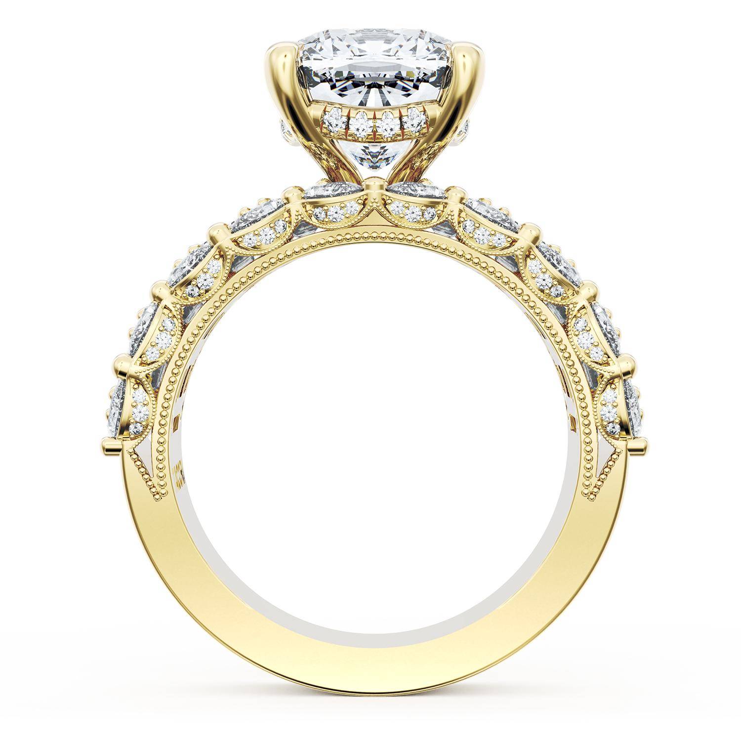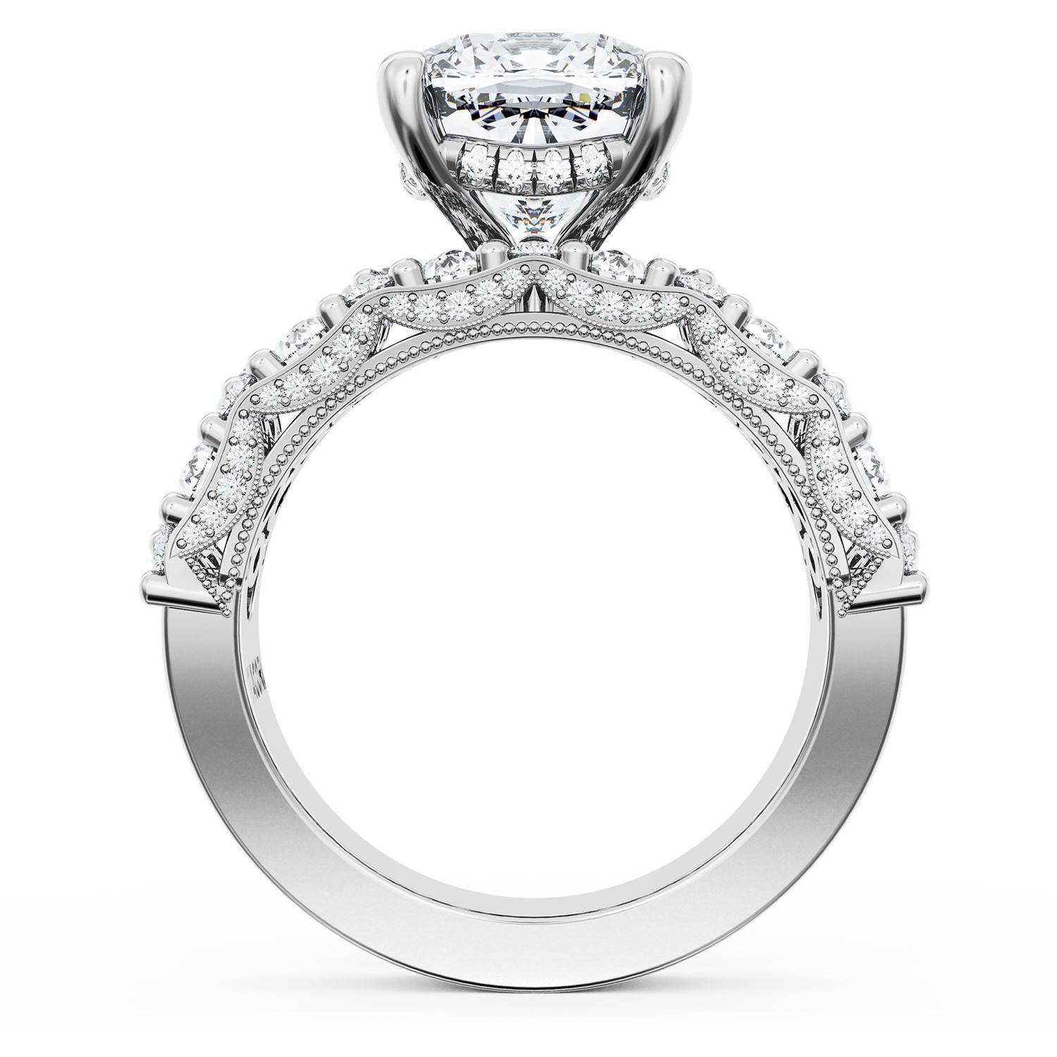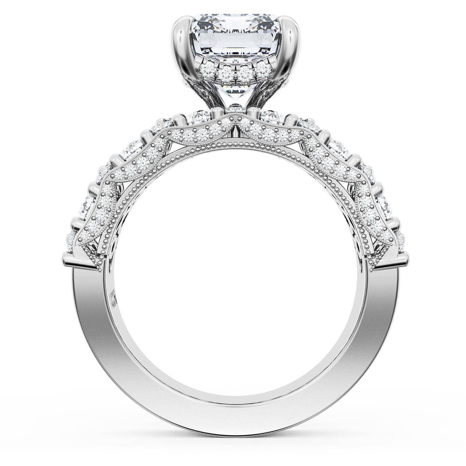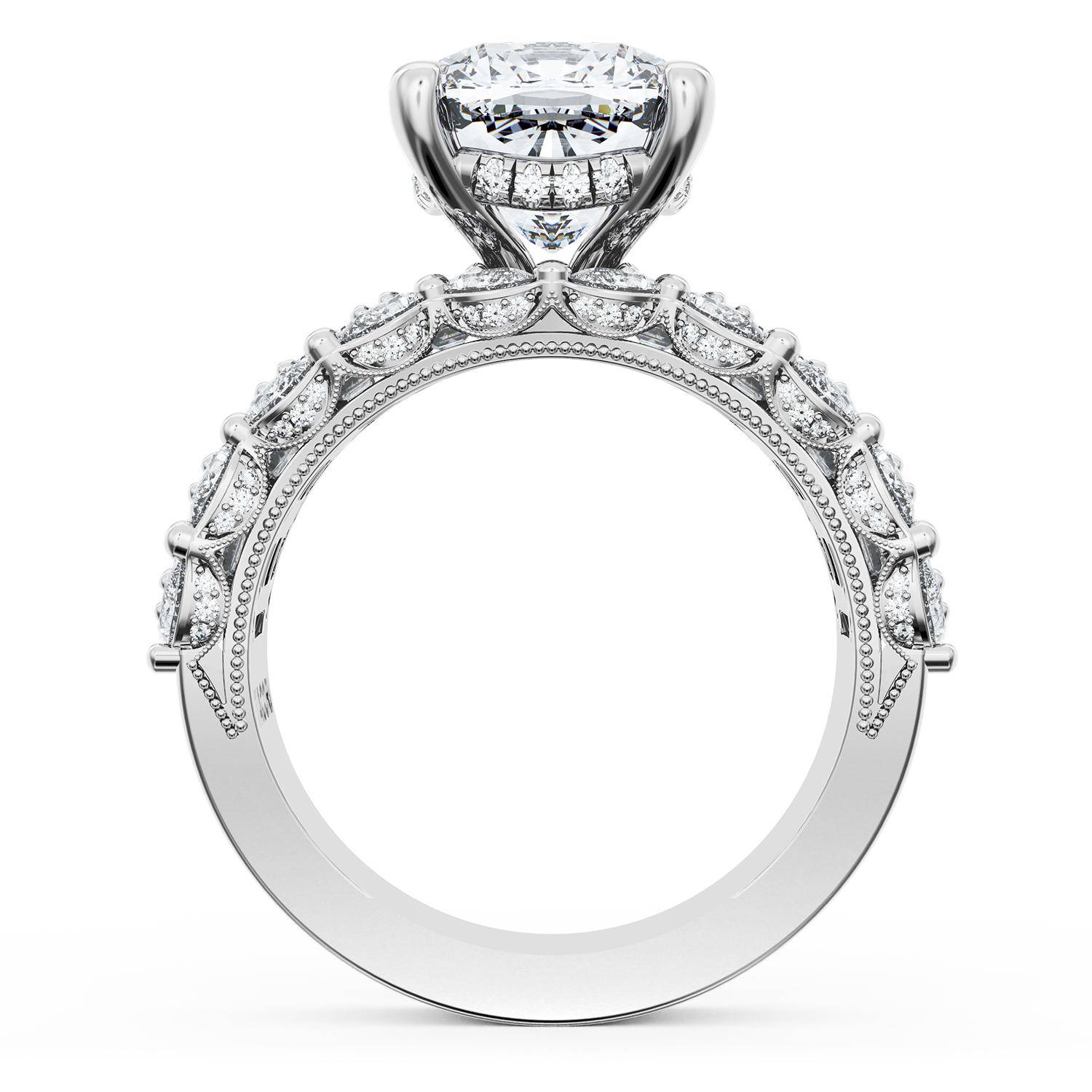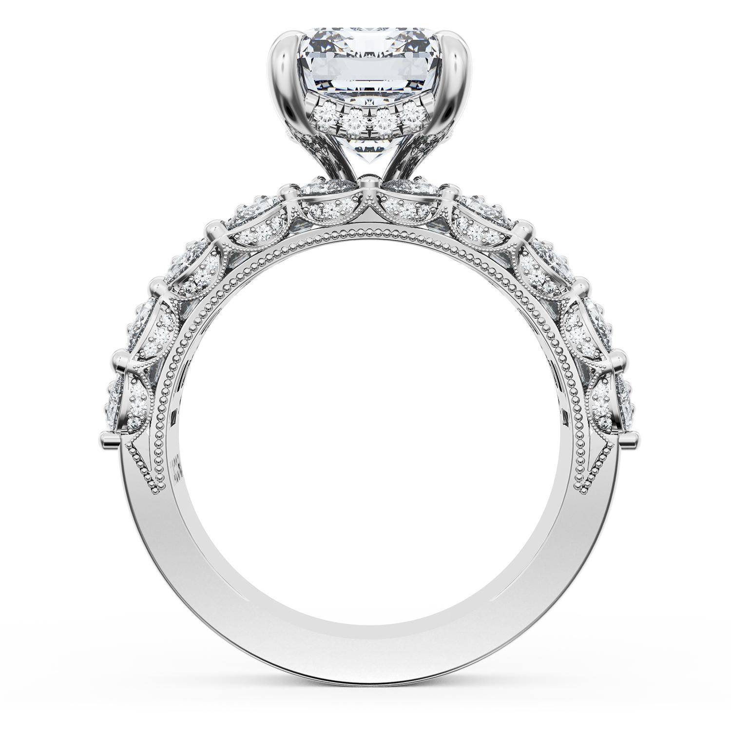 Two cadillac-cut side diamonds embrace the center stone, while a bloom encircles all crowning diamonds. Just below, diamond-studded prongs meet a Petite Crescent fabric and a ceiling of Pavé-set diamonds.