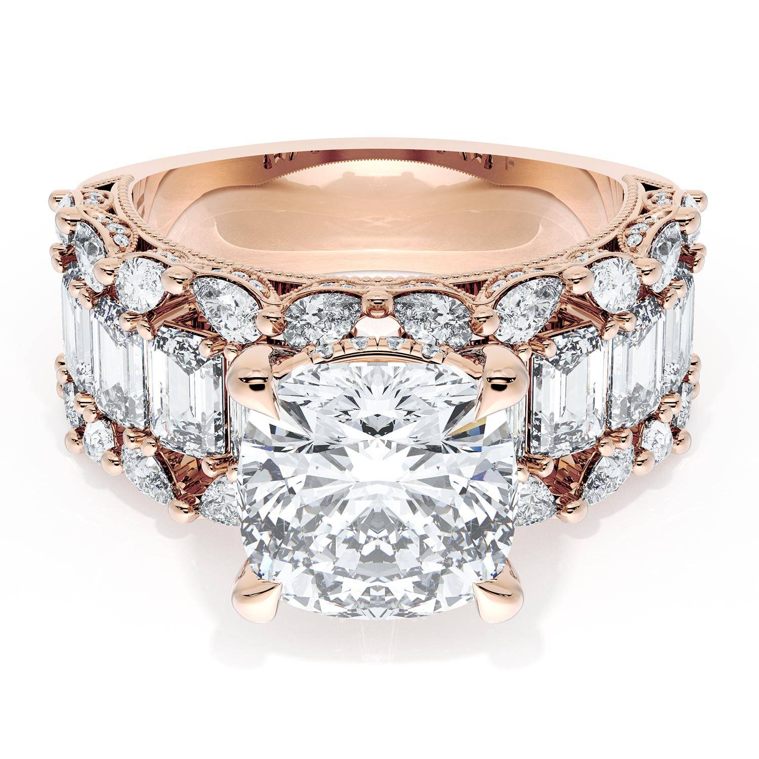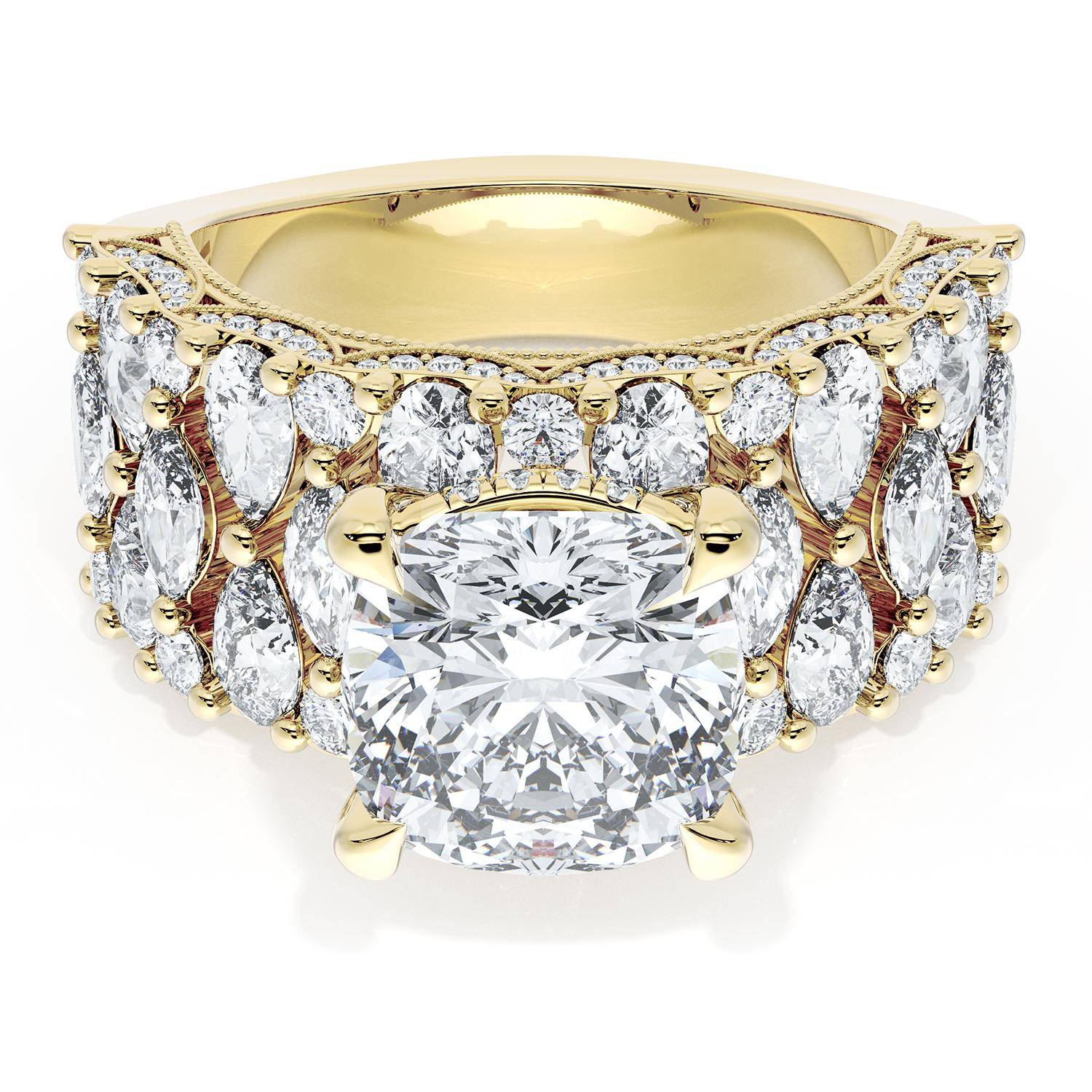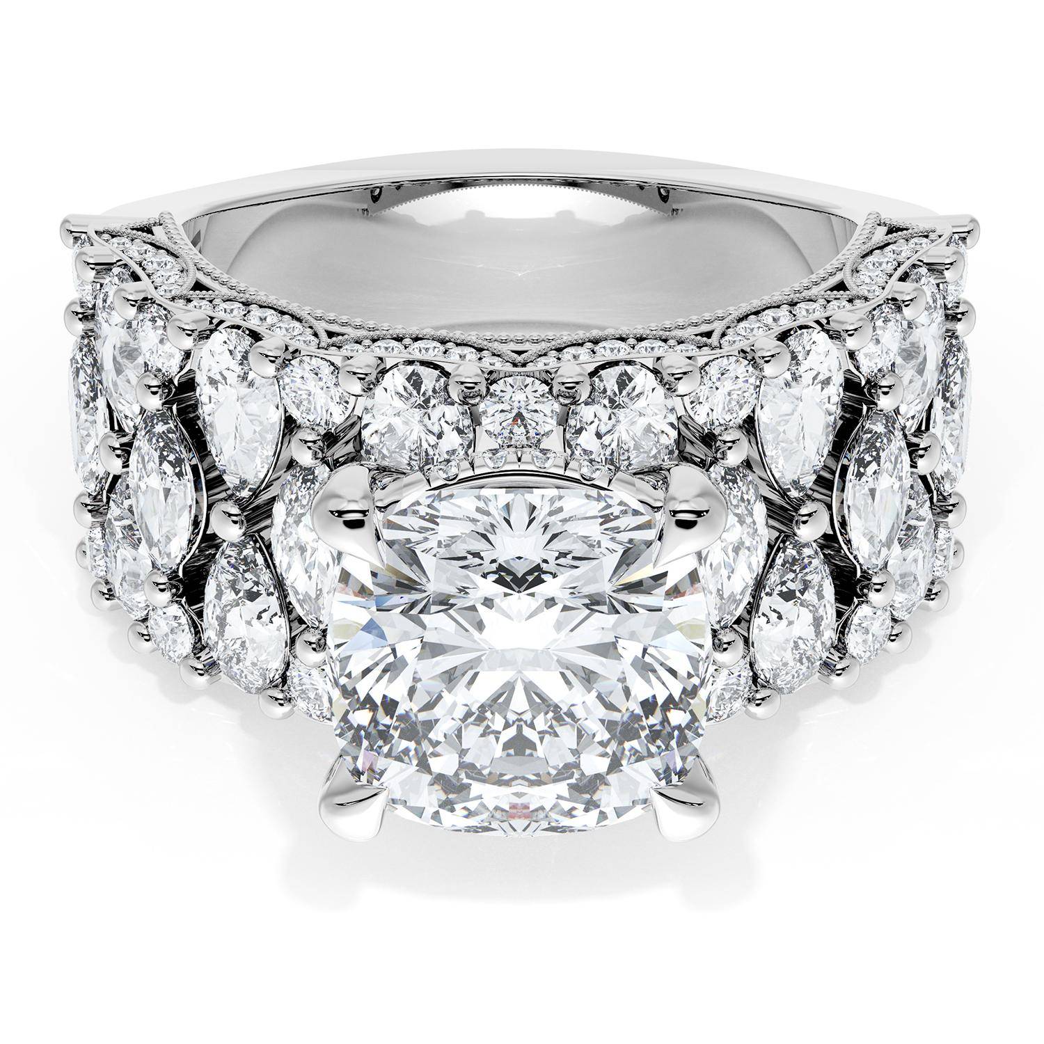 A Cushion cut center stone is set into a brilliant and mosaic-like ceiling of emerald and pear cut diamonds. Classic Crescent detailing decorates the inner face silhouette of the band.
