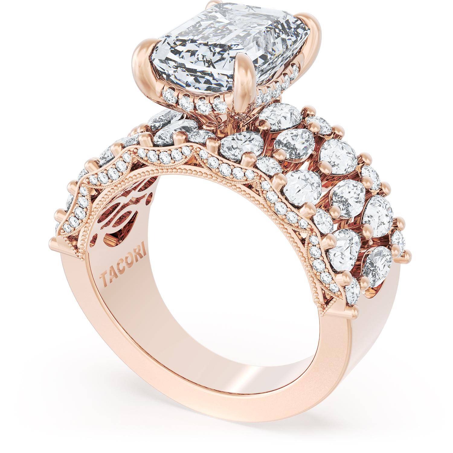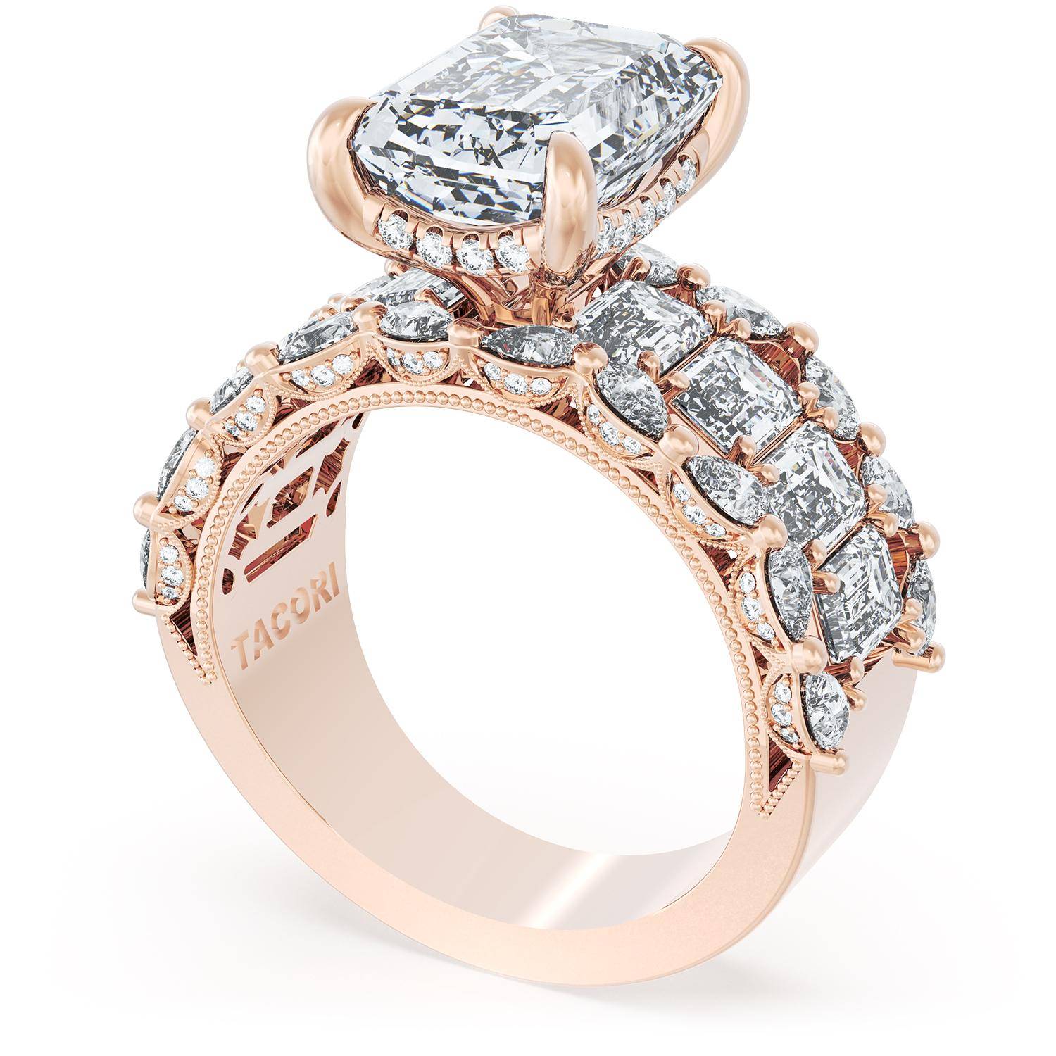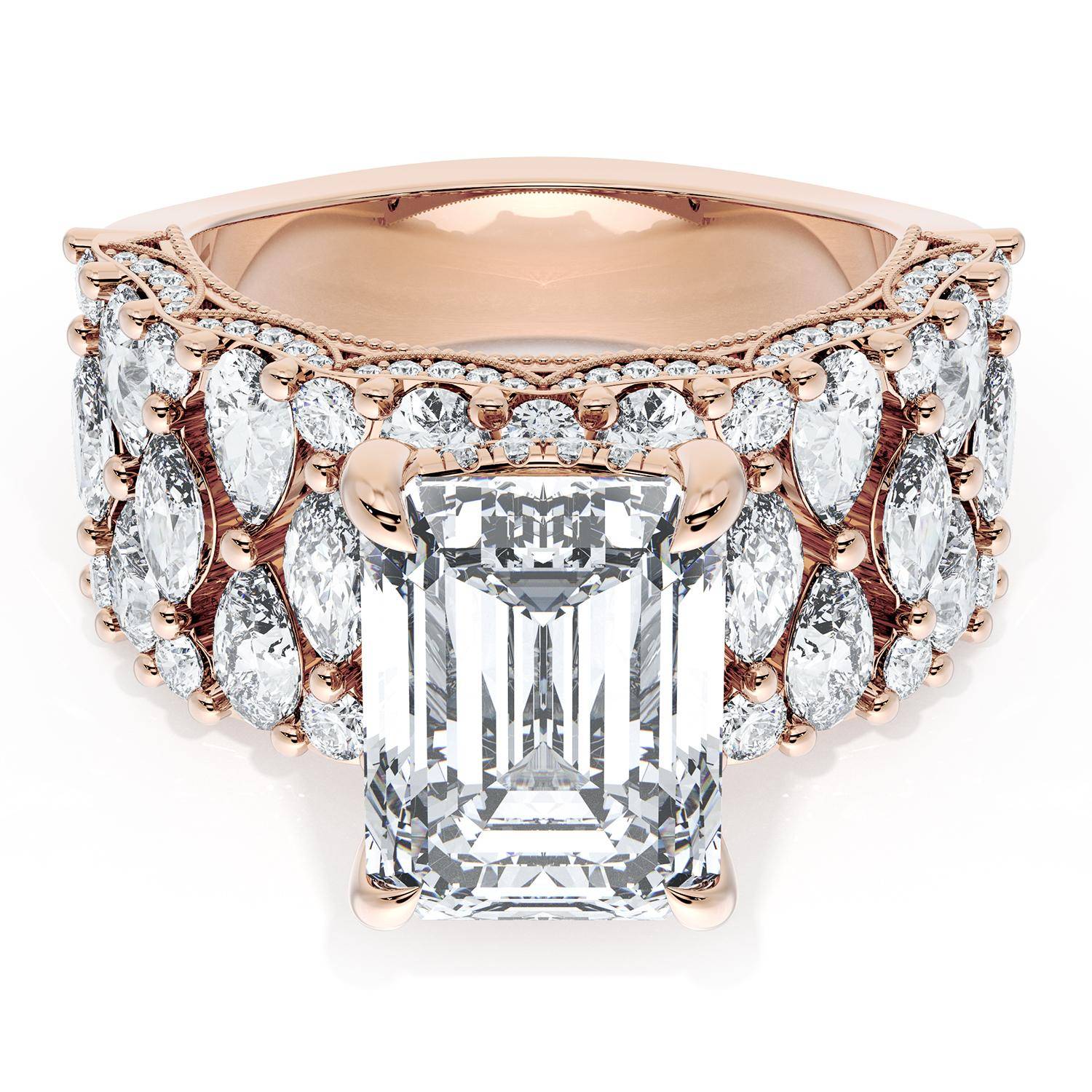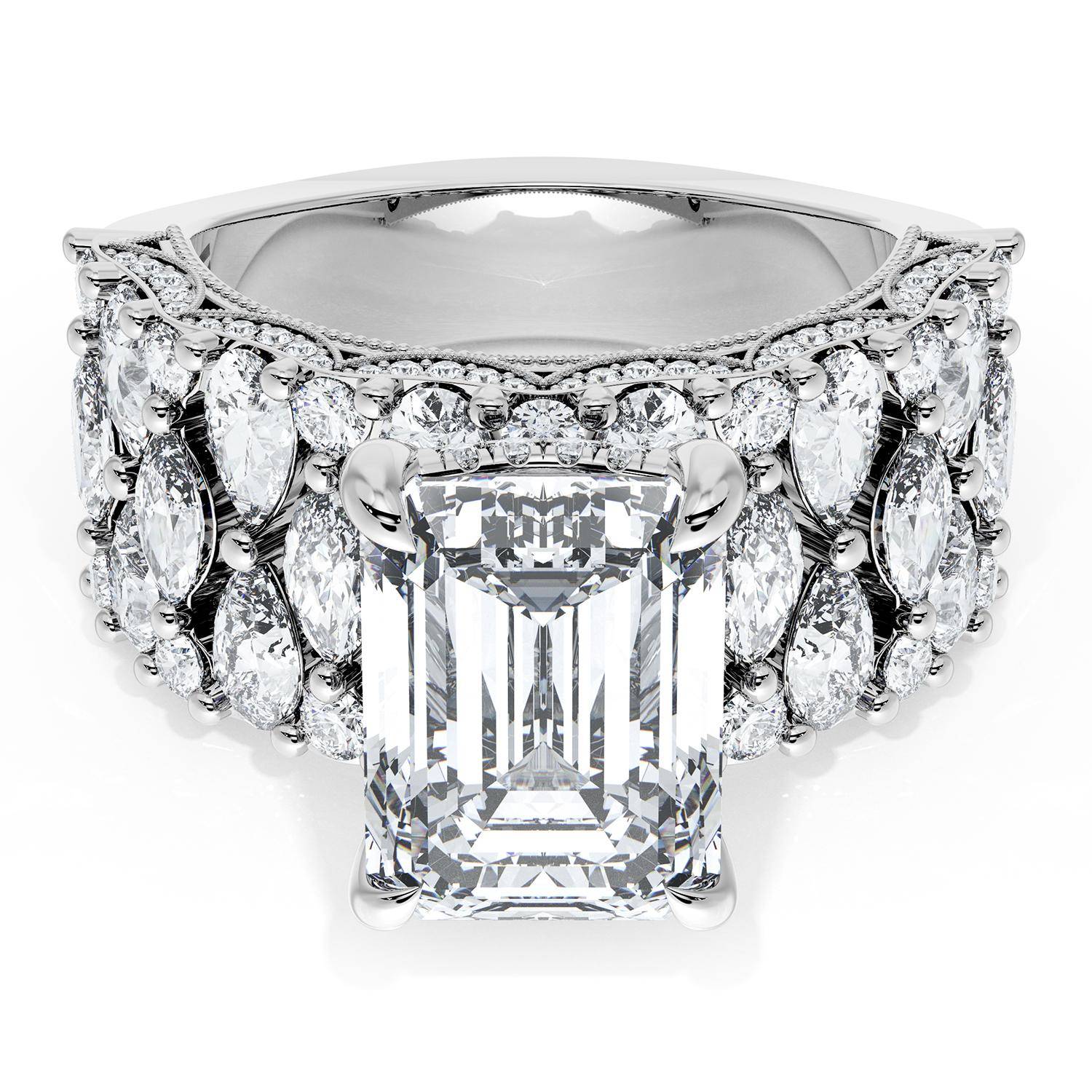 An Emerald cut center stone is set into a brilliant and mosaic-like ceiling of marquise and pear cut diamonds. Classic Crescent detailing decorates the inner face silhouette of the band.