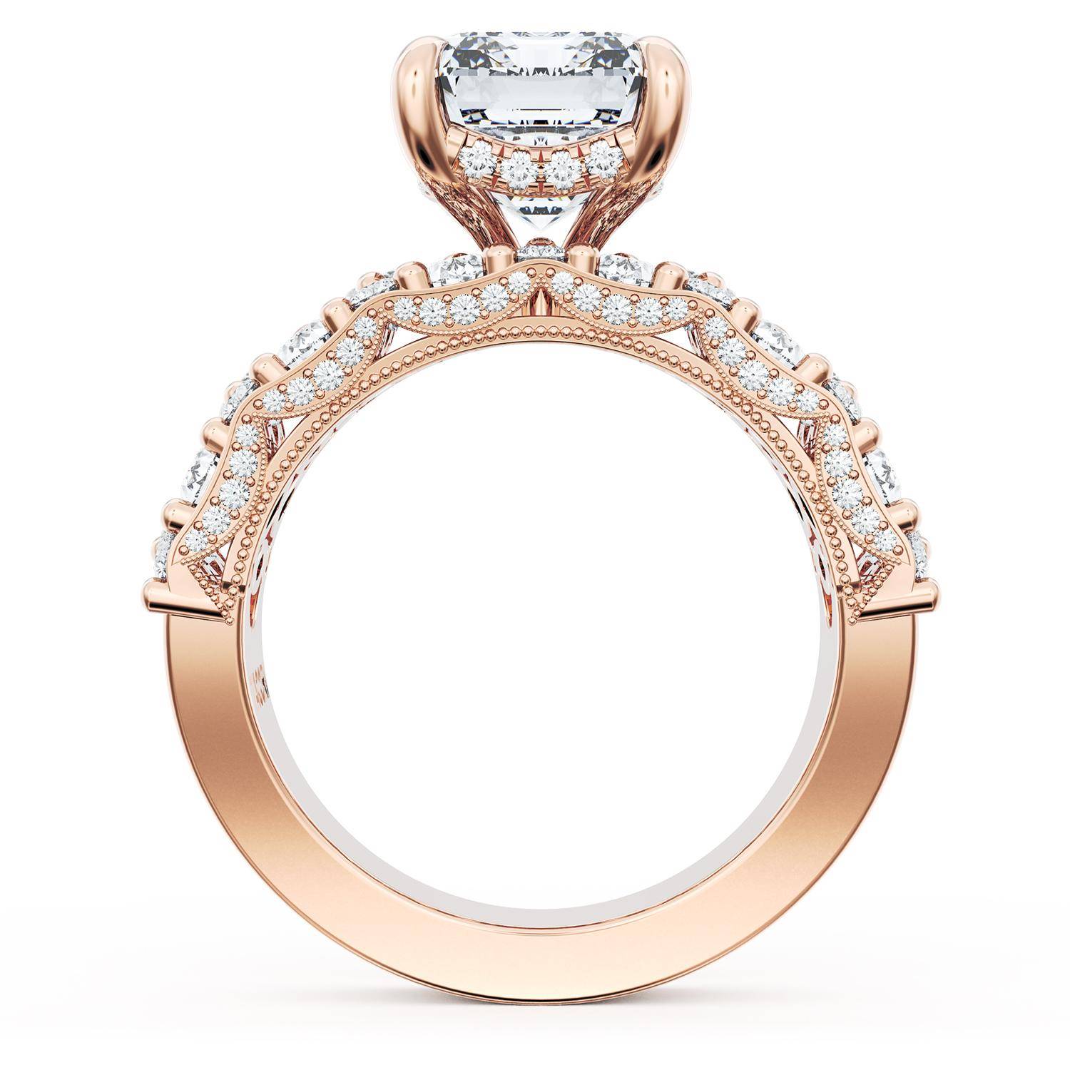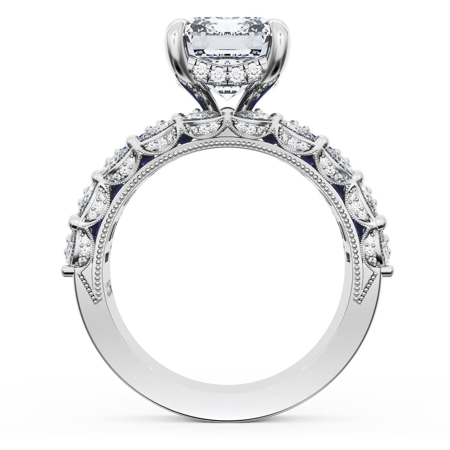 Two cadillac-cut side diamonds embrace the center stone, while a bloom encircles all crowning diamonds. Just below, diamond-studded prongs meet a Petite Crescent fabric and a ceiling of small Pavé-set diamonds.