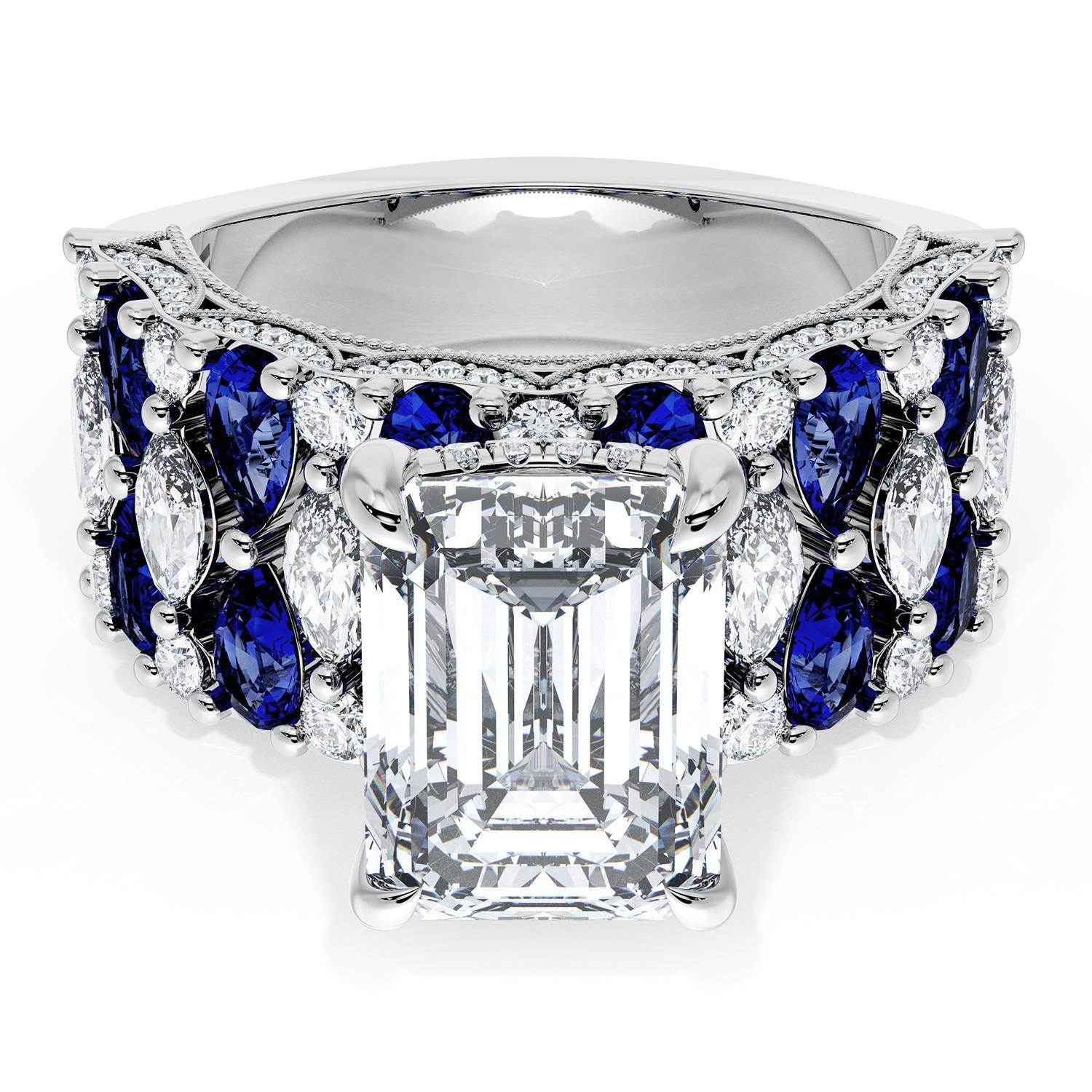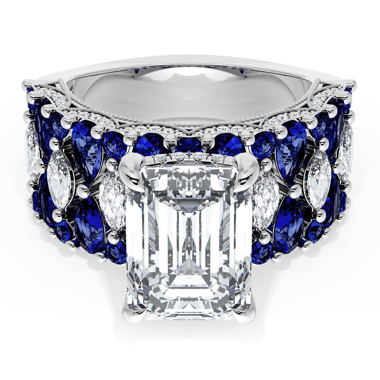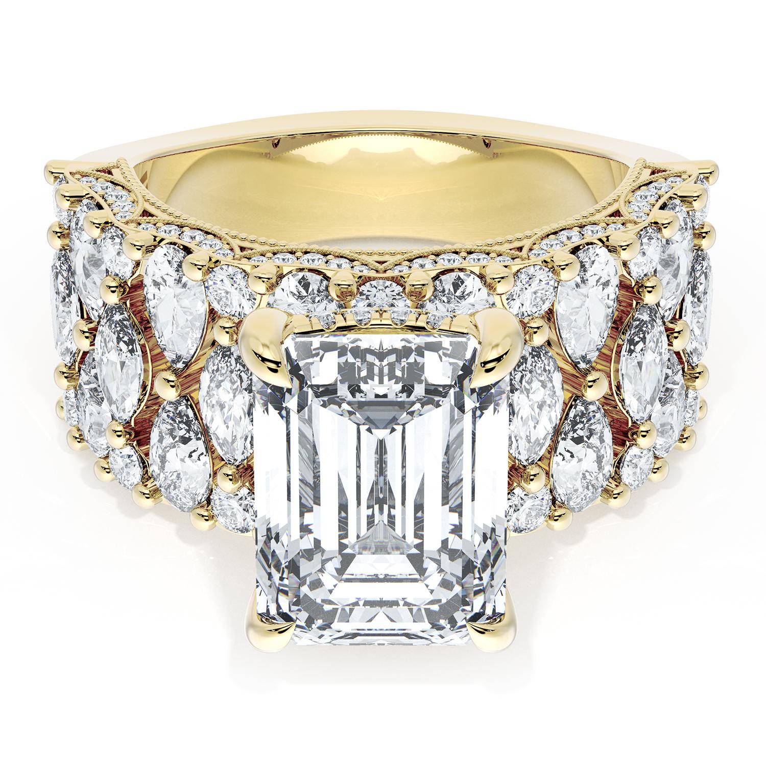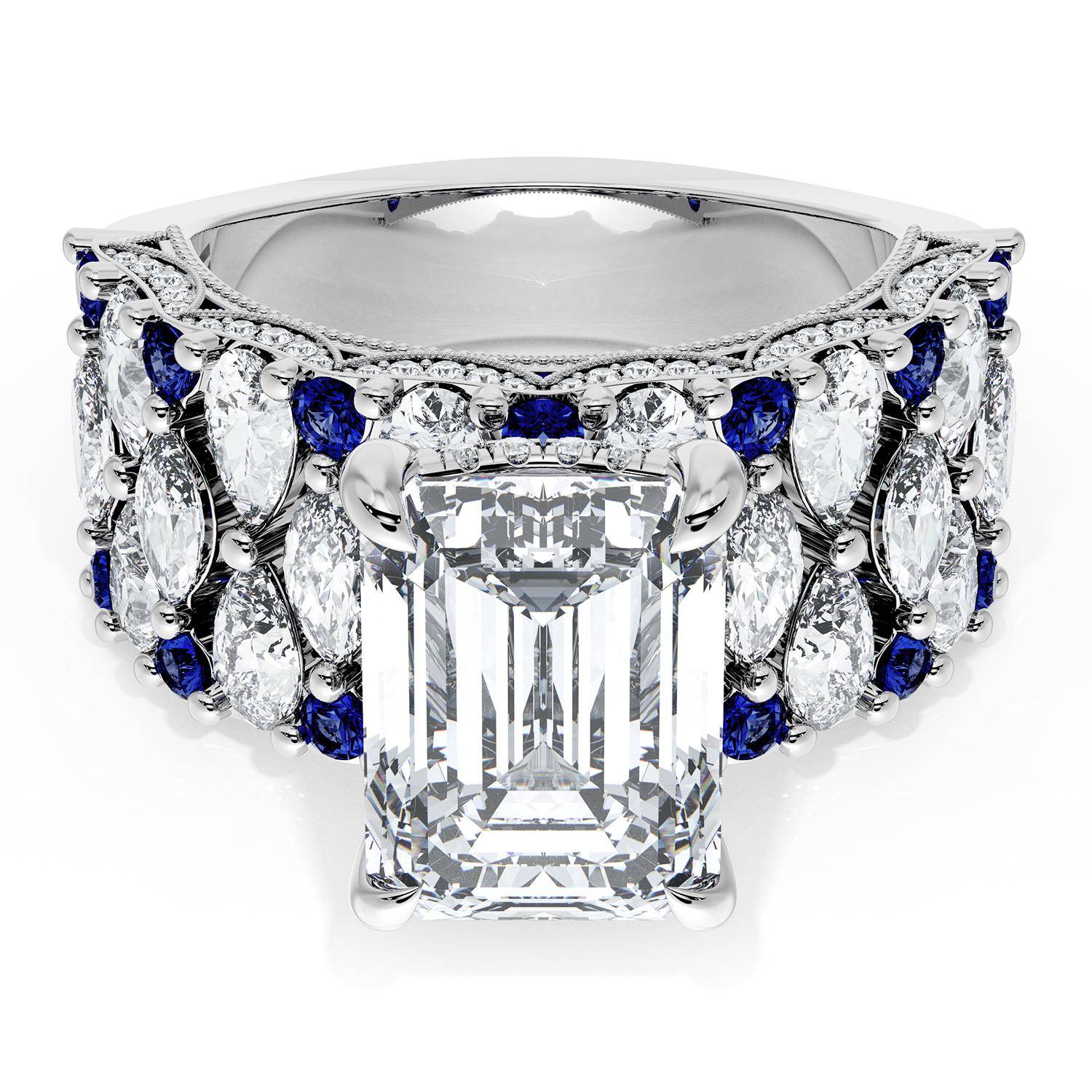 An Emerald cut center stone is set into a brilliant and mosaic-like ceiling of marquise and pear cut gemstones. Classic Crescent detailing decorates the inner face silhouette of the band.