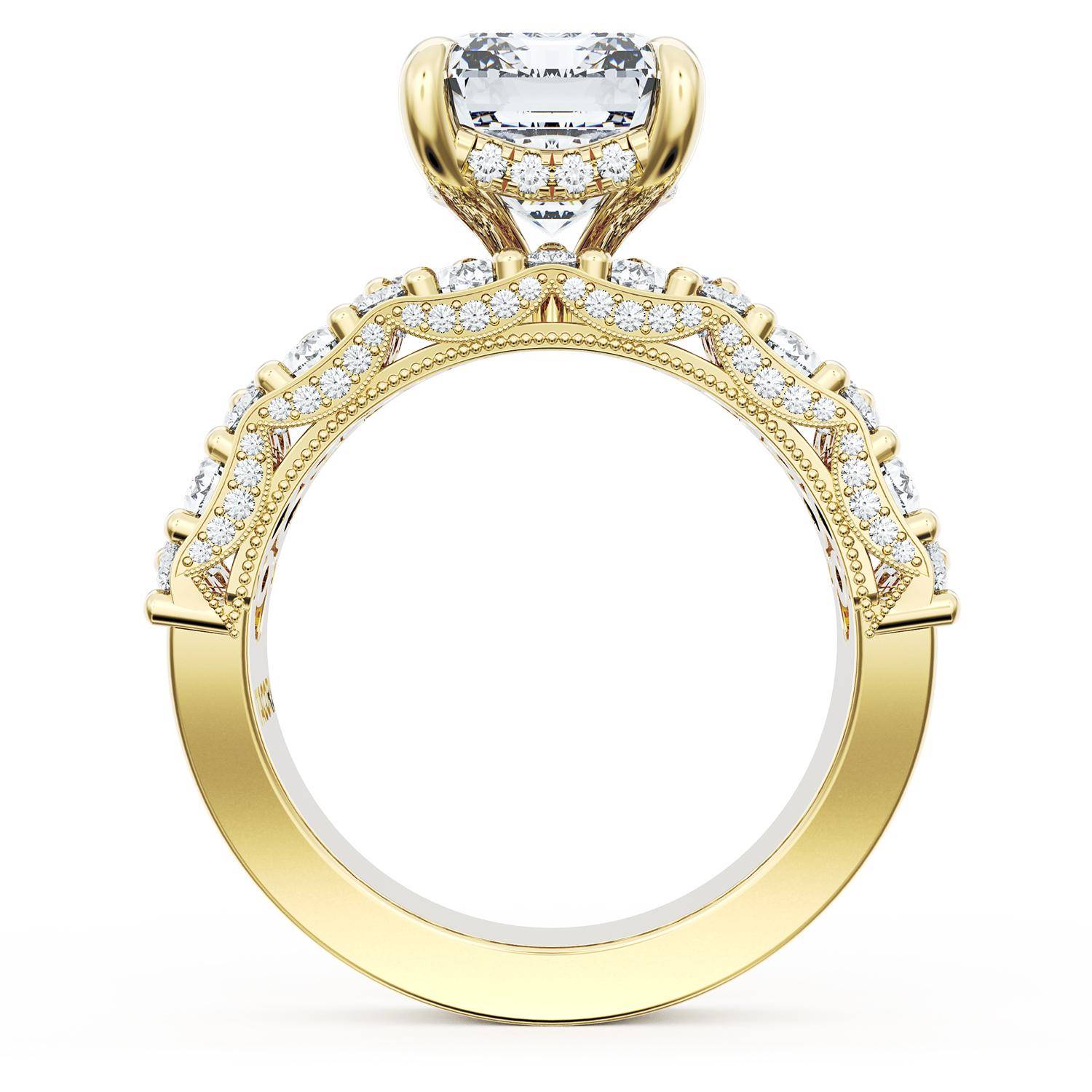 Two cadillac-cut diamonds embrace the center stone, while a bloom encircles all crowning diamonds. Just below, diamond-studded prongs meet a Petite Crescent fabric and a ceiling of Pavé-set diamonds.
