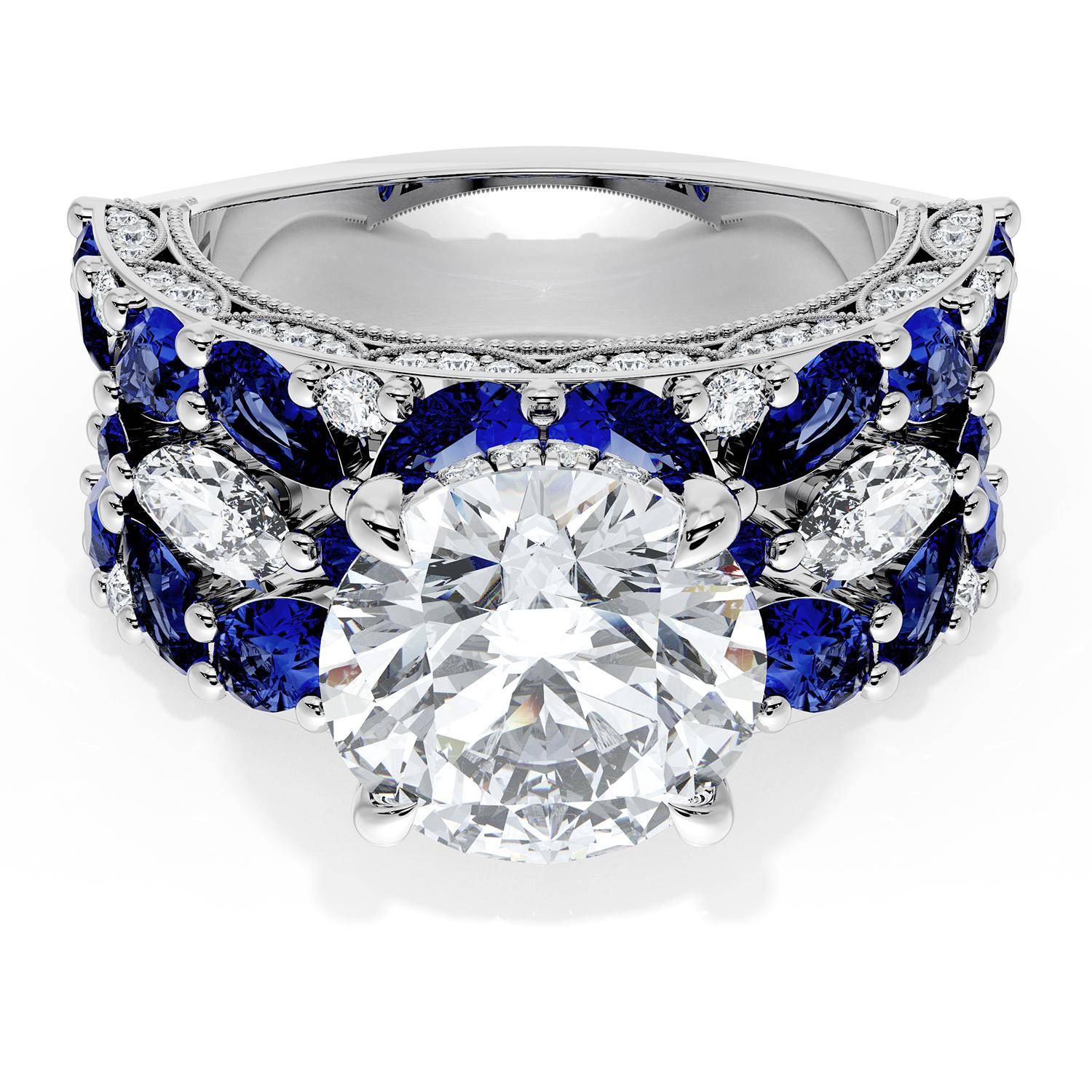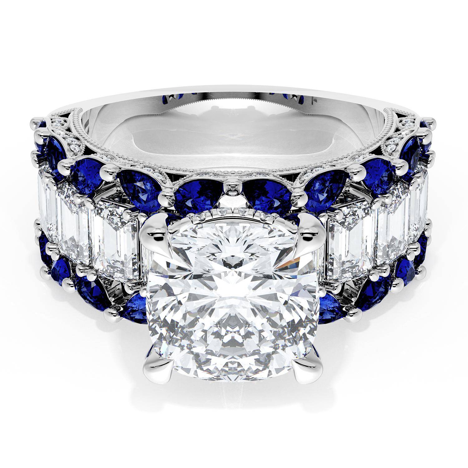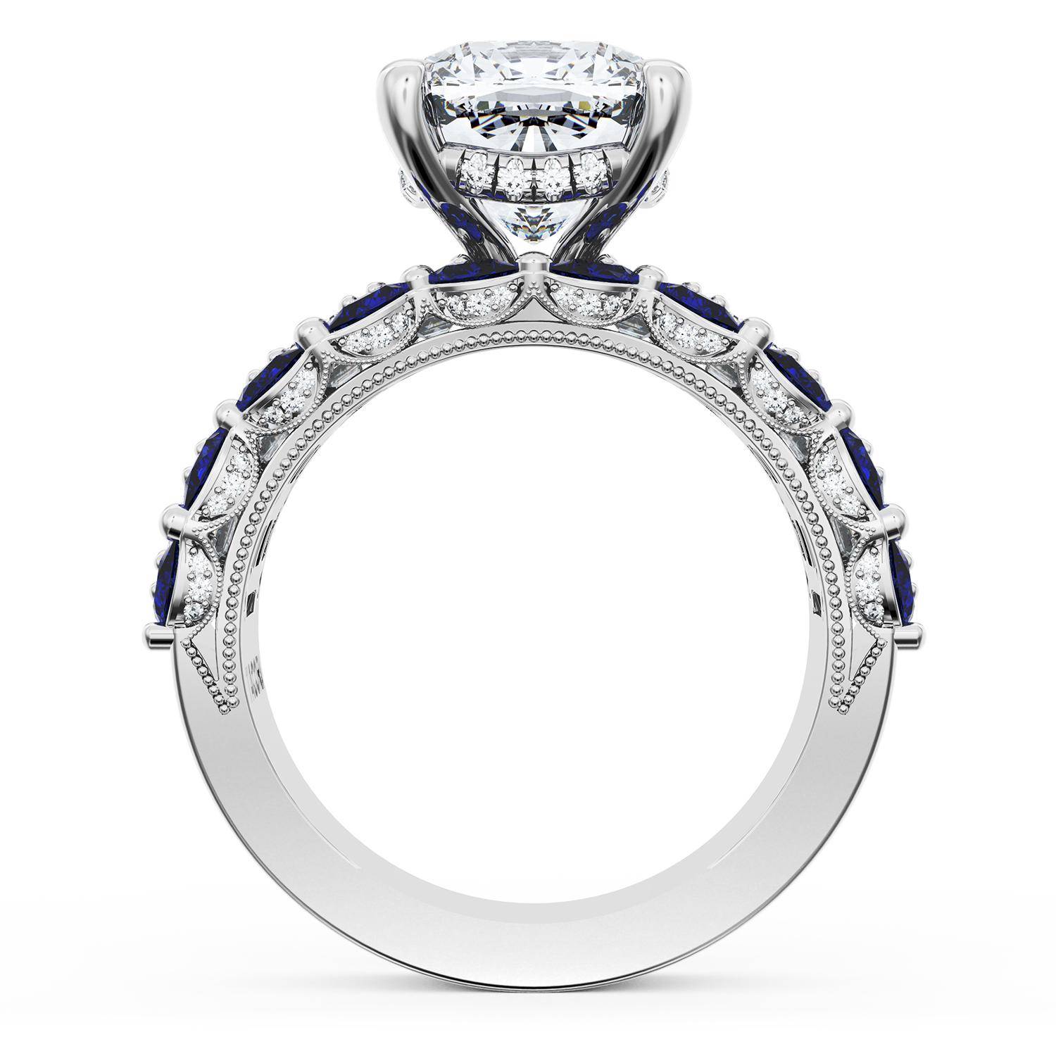 In this three-stone ring, cadillac-cut sapphires embrace the center stone, and a bloom encircles each. Below the crown, diamond-studded prongs meet an innerface of Petite Crescent fabric and a ceiling of Pavé.