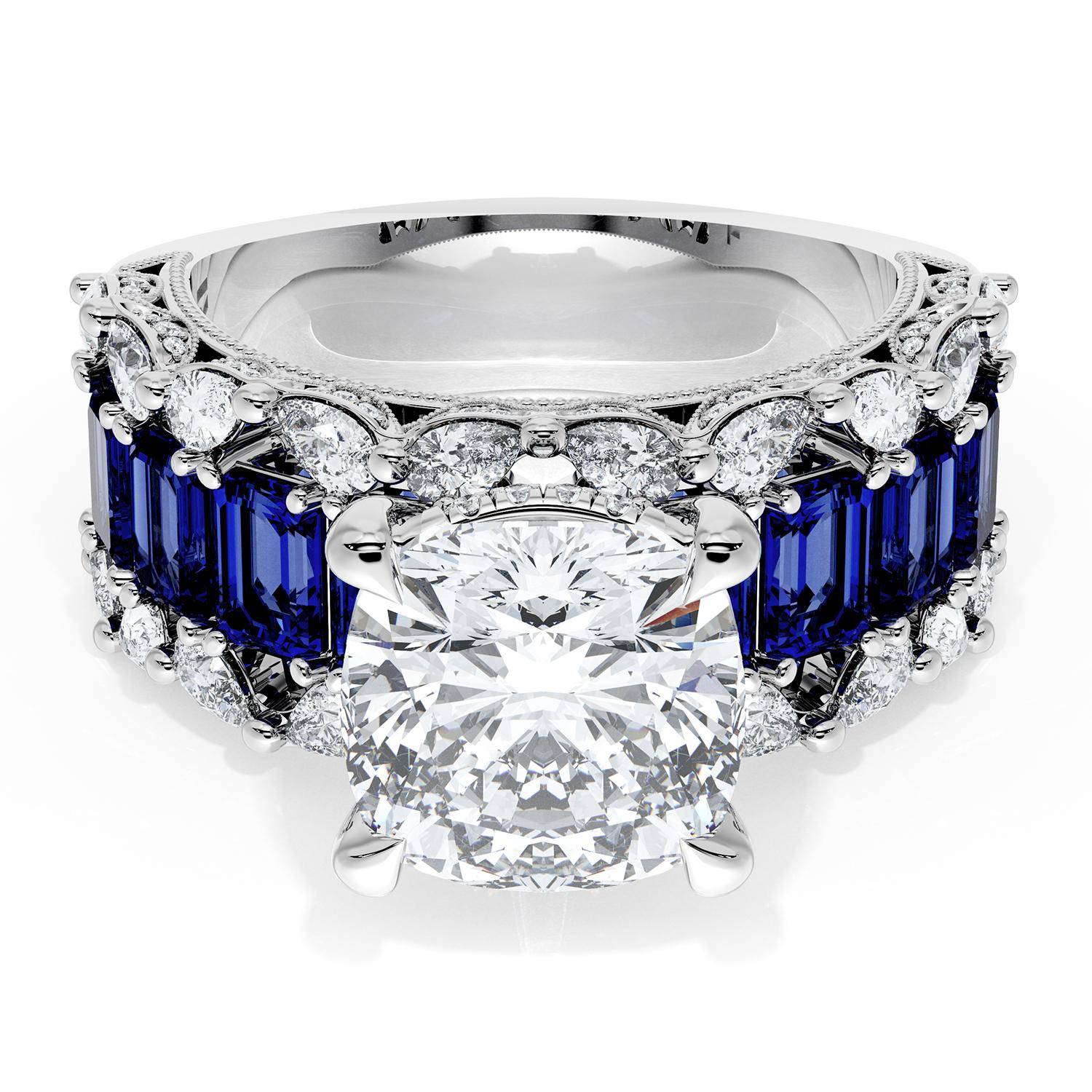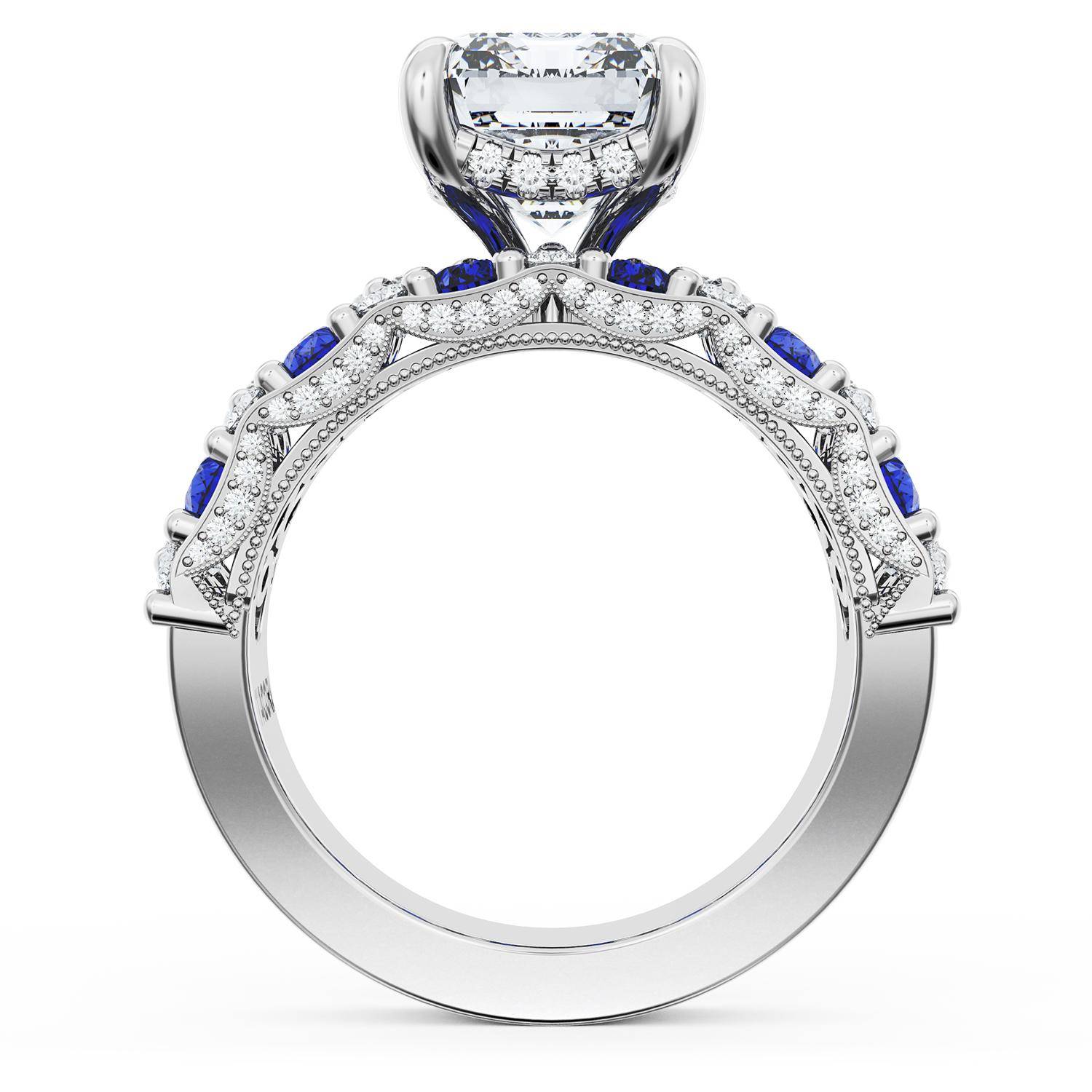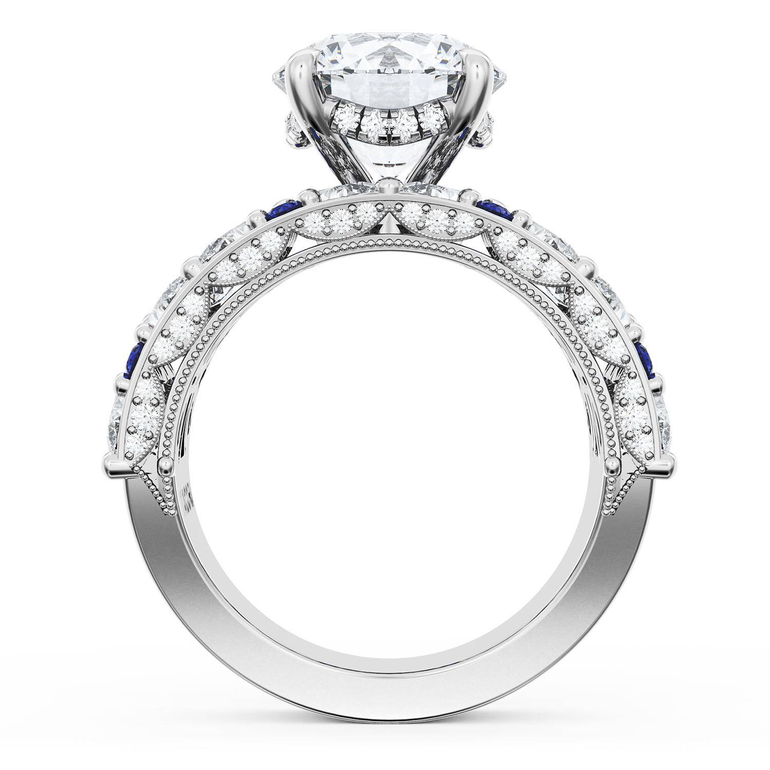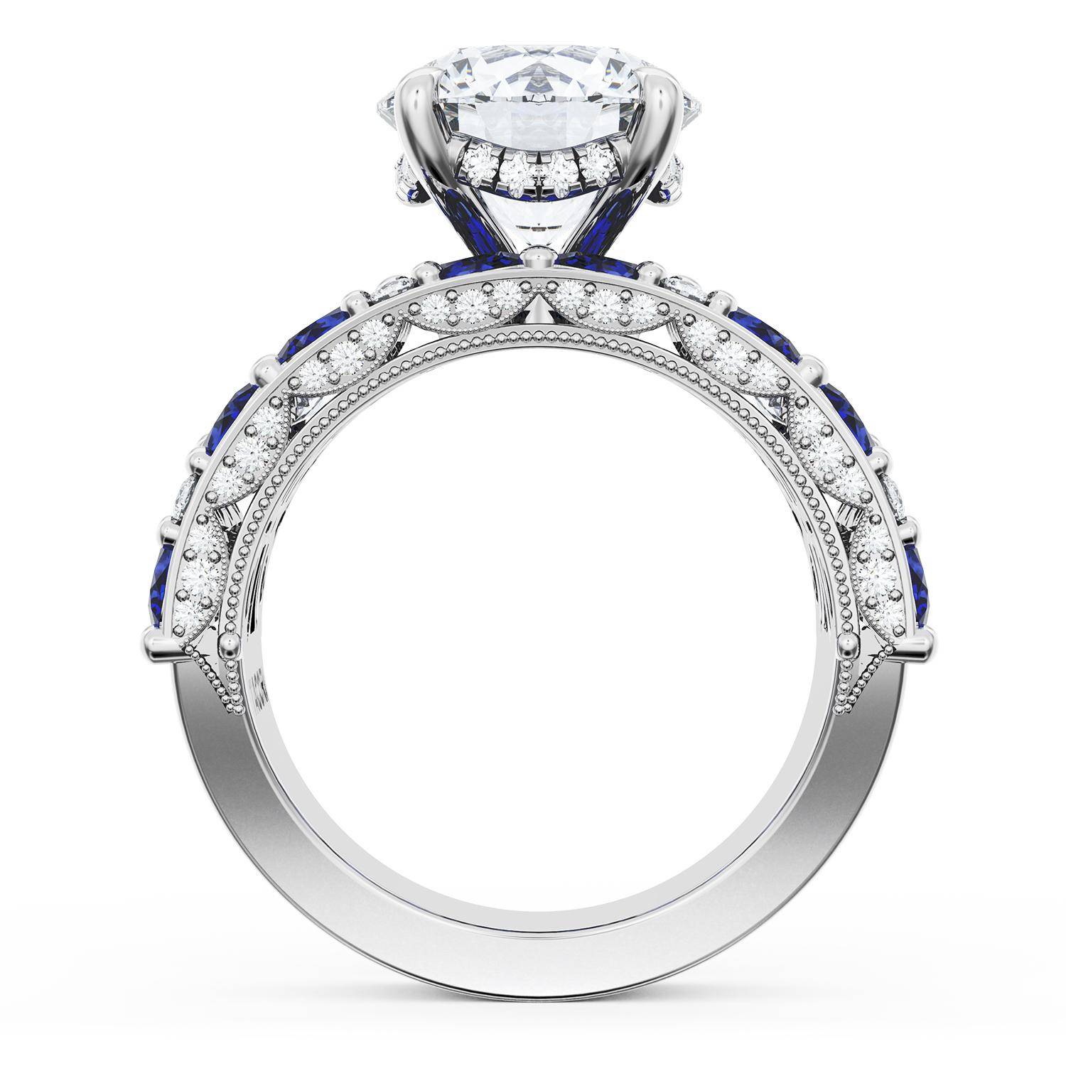 In this three-stone ring, cadillac-cut sapphires embrace the center stone, and a bloom encircles each. Below the crown, diamond-studded prongs meet an innerface of Petite Crescent fabric and a ceiling of Pavé.