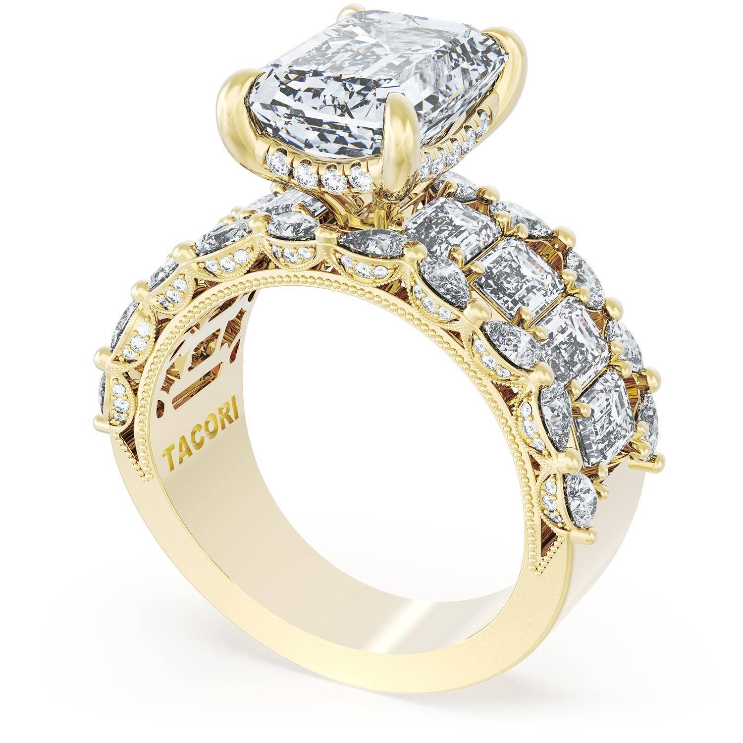 An Emerald cut center stone is set into a brilliant and mosaic-like ceiling of emerald and pear cut gemstones. Classic Crescent detailing decorates the inner face silhouette of the band.