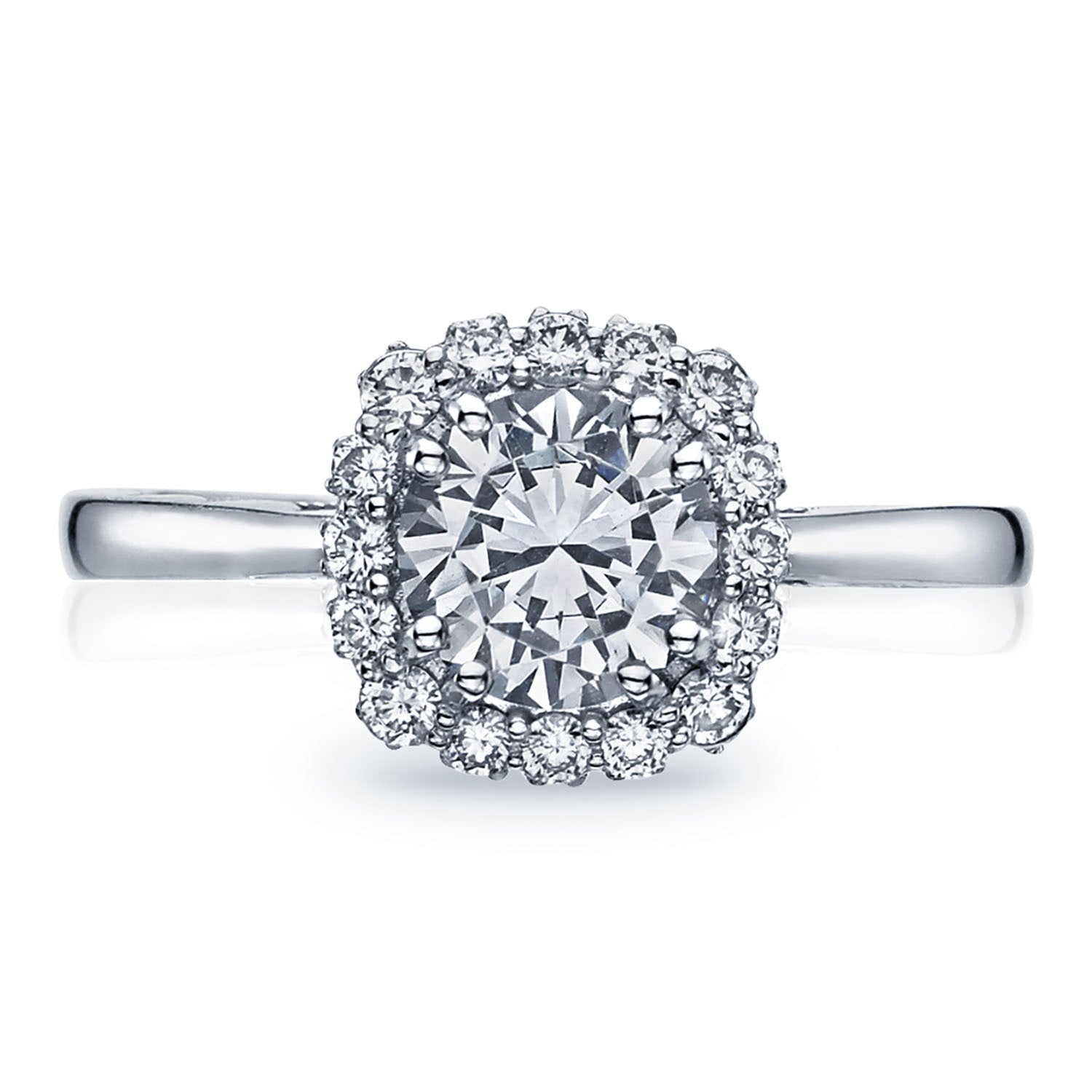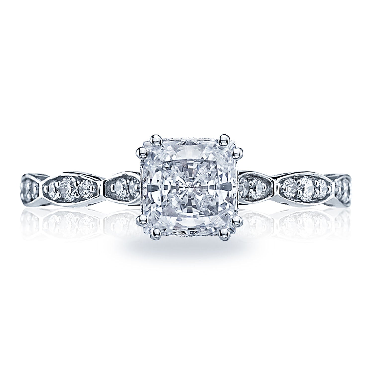 A cushion bloom enhances the center stone, which sits on a Classic 360 foundation with an open gallery. Hand carved Sculpted Crescent fabric with careful milgrain decorates the innerface of the ring.
