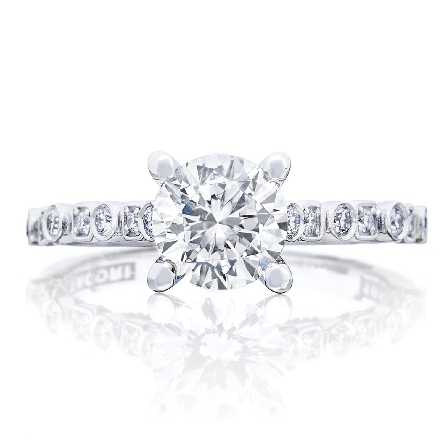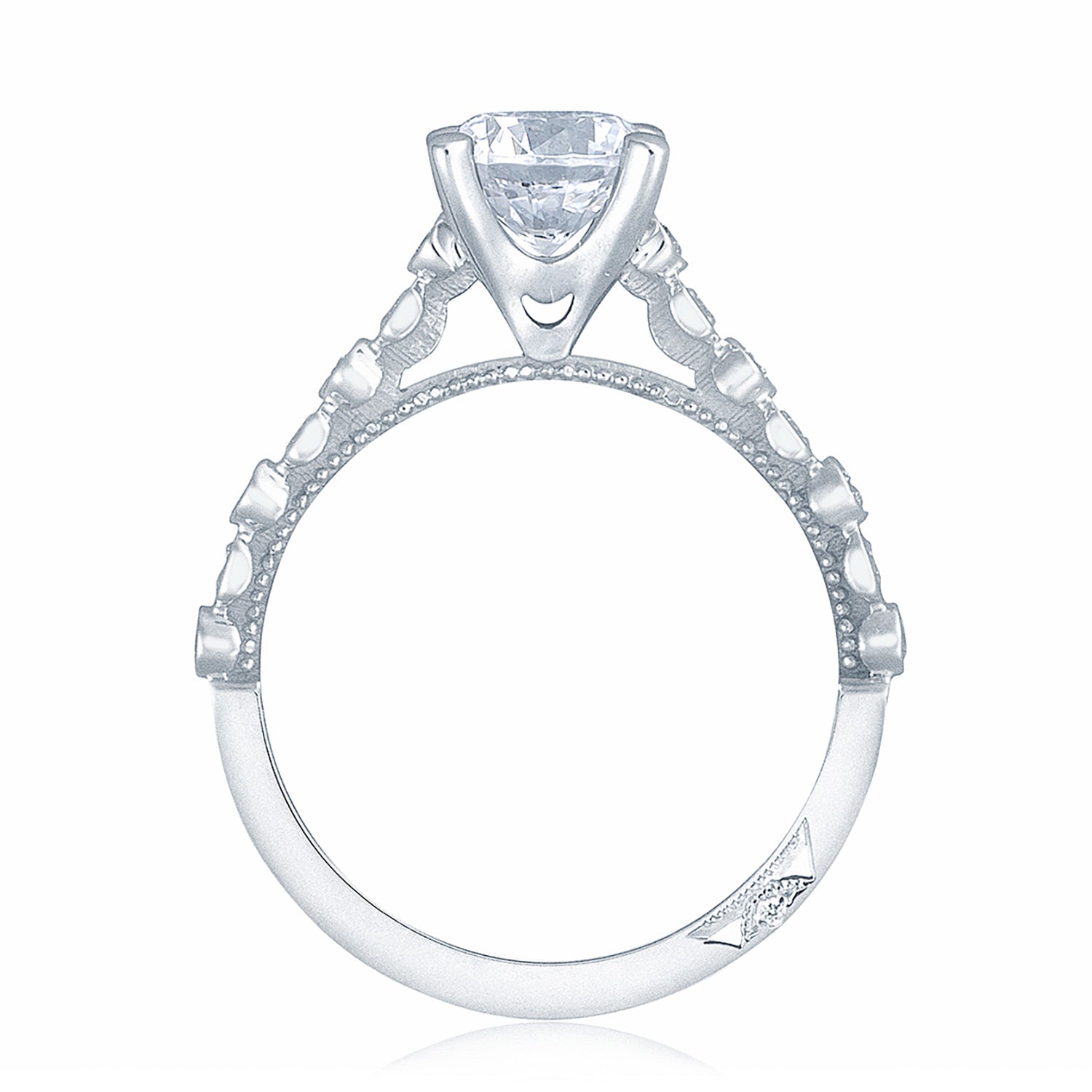 Round-brilliant diamonds are bezel set onto the ceiling and lead to the solitaire. Beading along the innerface adds texture to the Sculpted Crescent fabric, and a Signature Crescent marks the resting point.