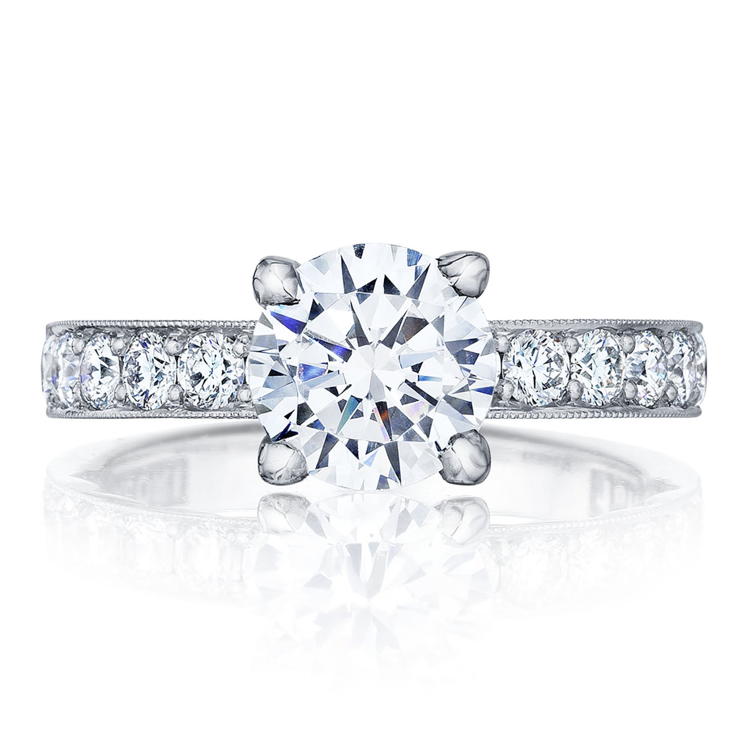 Channel-set round-brilliant diamonds lined with milgrain decorate the ceiling of the ring, while hand-carved Sculpted Crescent fabric and more milgrain detail the innerface. The solitaire floats on a Classic 360 foundation.