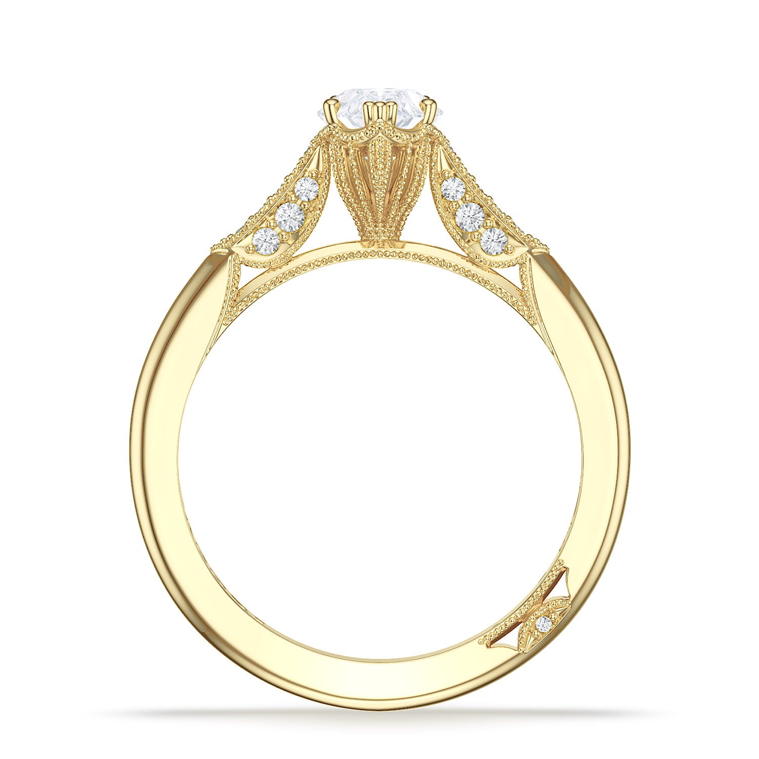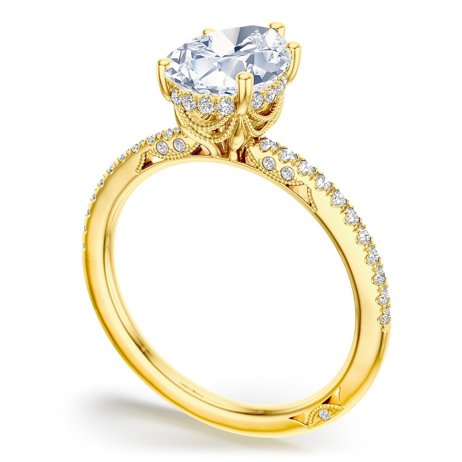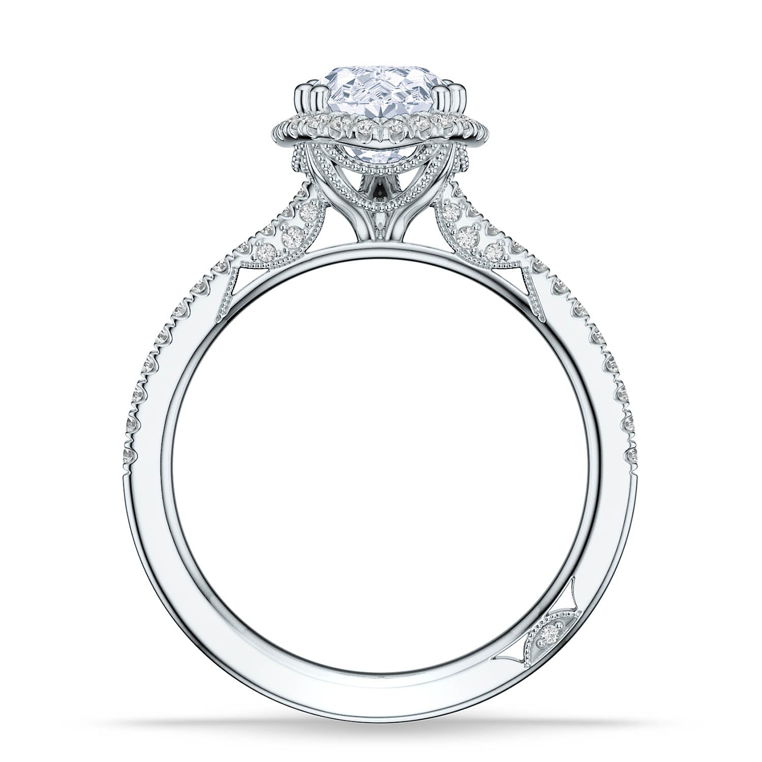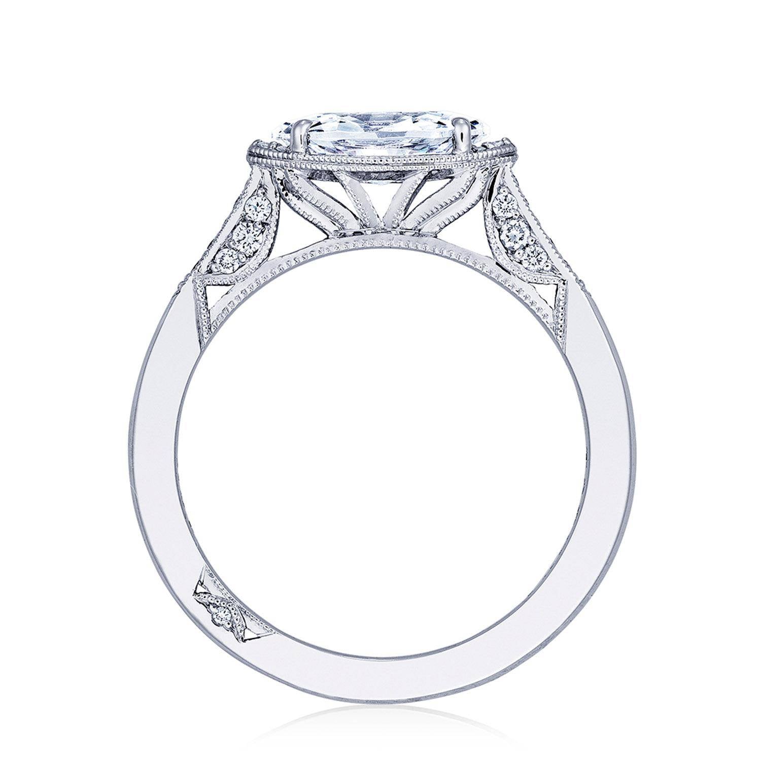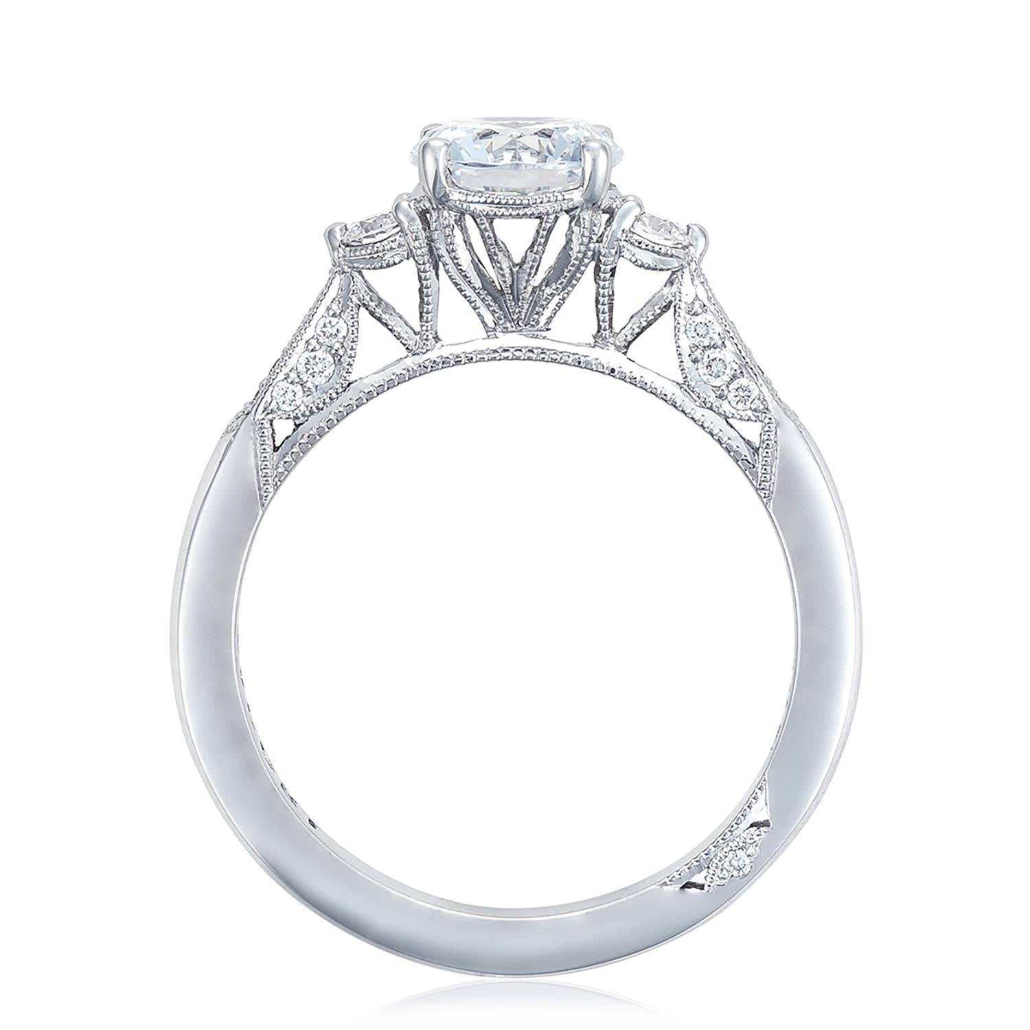 Two marquise side stones embrace the oval center stone, which its on a diamond-decorated Cathedral foundation. Raised TACORI crescents and outlines of delicate milgrain beading are reminiscient of the elegant draping of bridal fabric.
