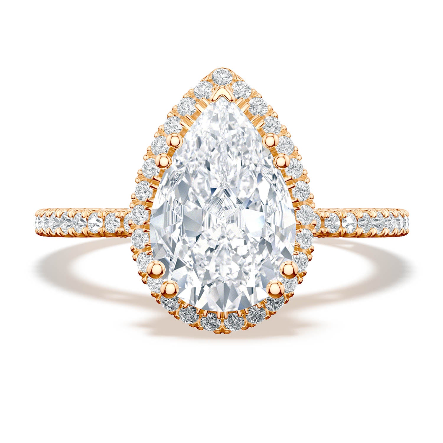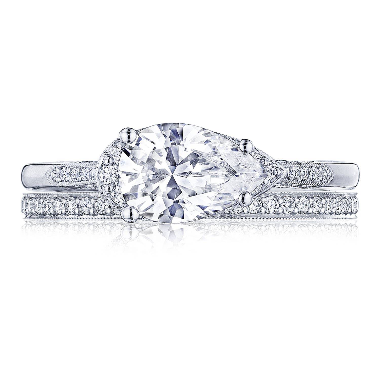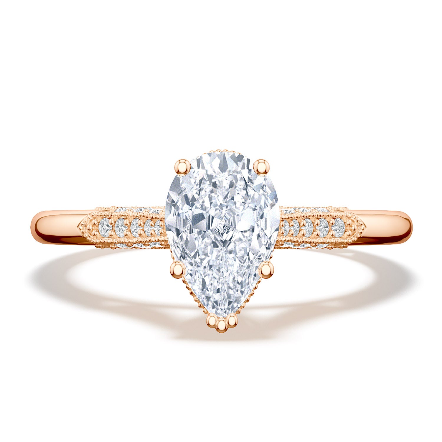 The pear-shape solitaire is set East to West on the band and is accentuated by a diamond-tipped frame and pavé-set diamonds on the ceiling. Simply Tacori crescent fabric adds diamond detail just beneath the crown.