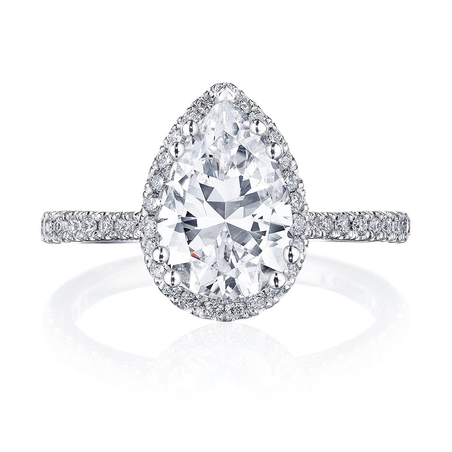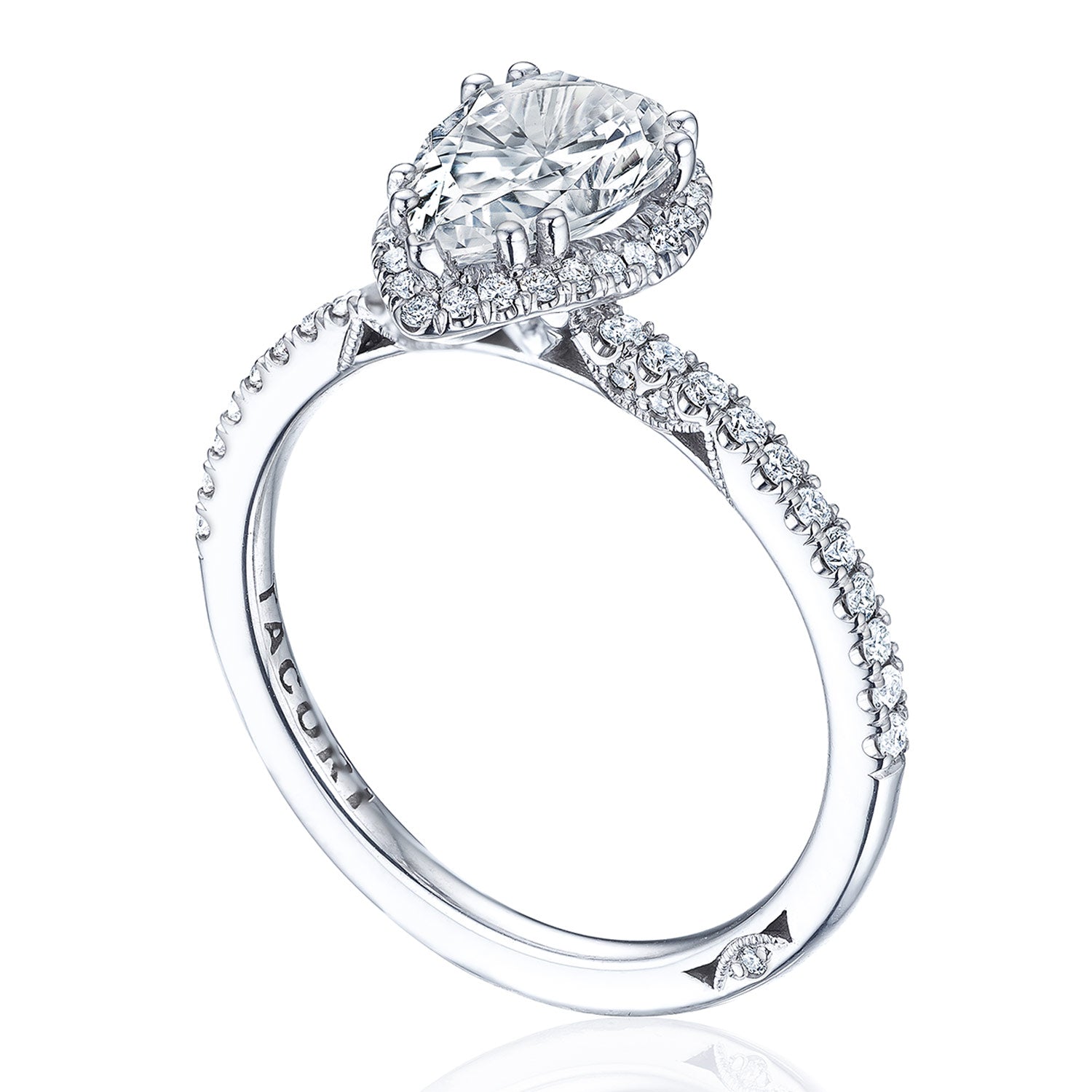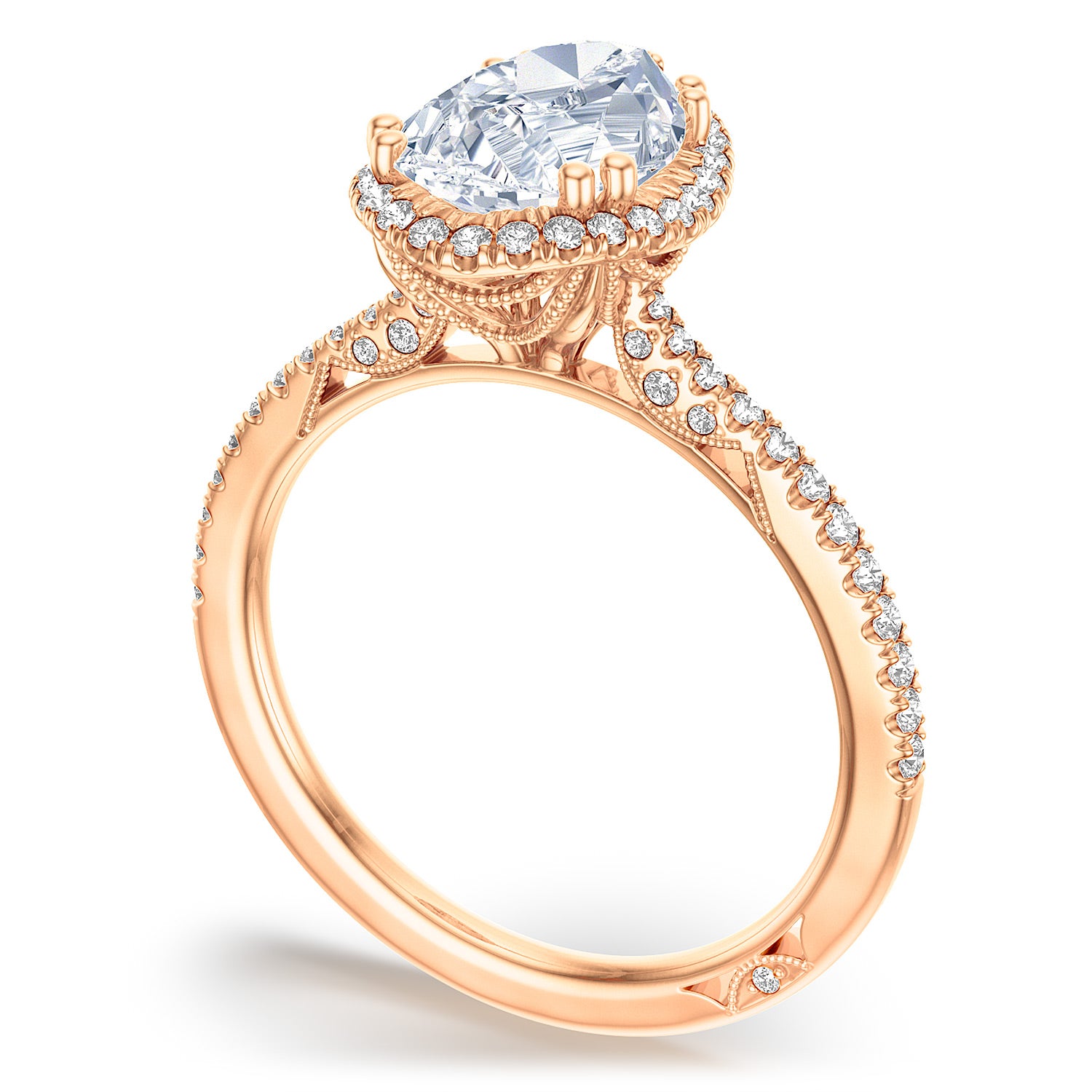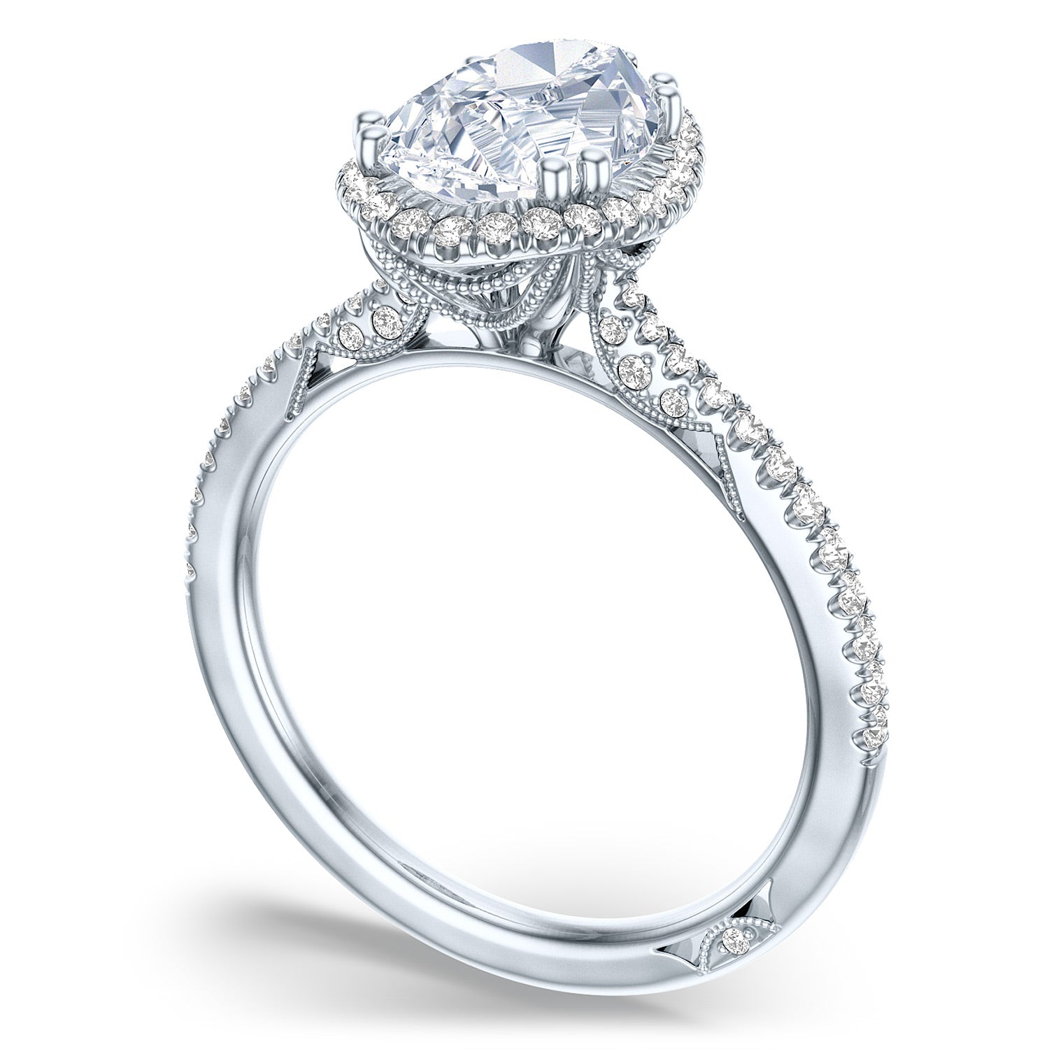 Contemporary and diamond-intense, with Simply TACORI Crescent Fabric and pavé-set diamonds adorning the ceiling. A stunning bloom around the fancy-cut pear solitare delivers brilliant detail. A signature Crescent marks the ring as Truly TACORI.