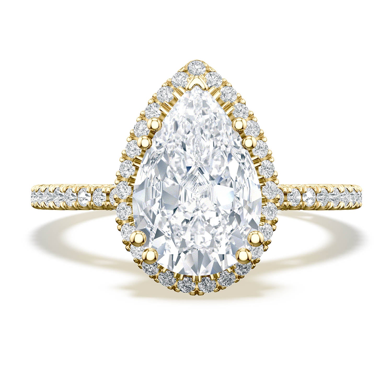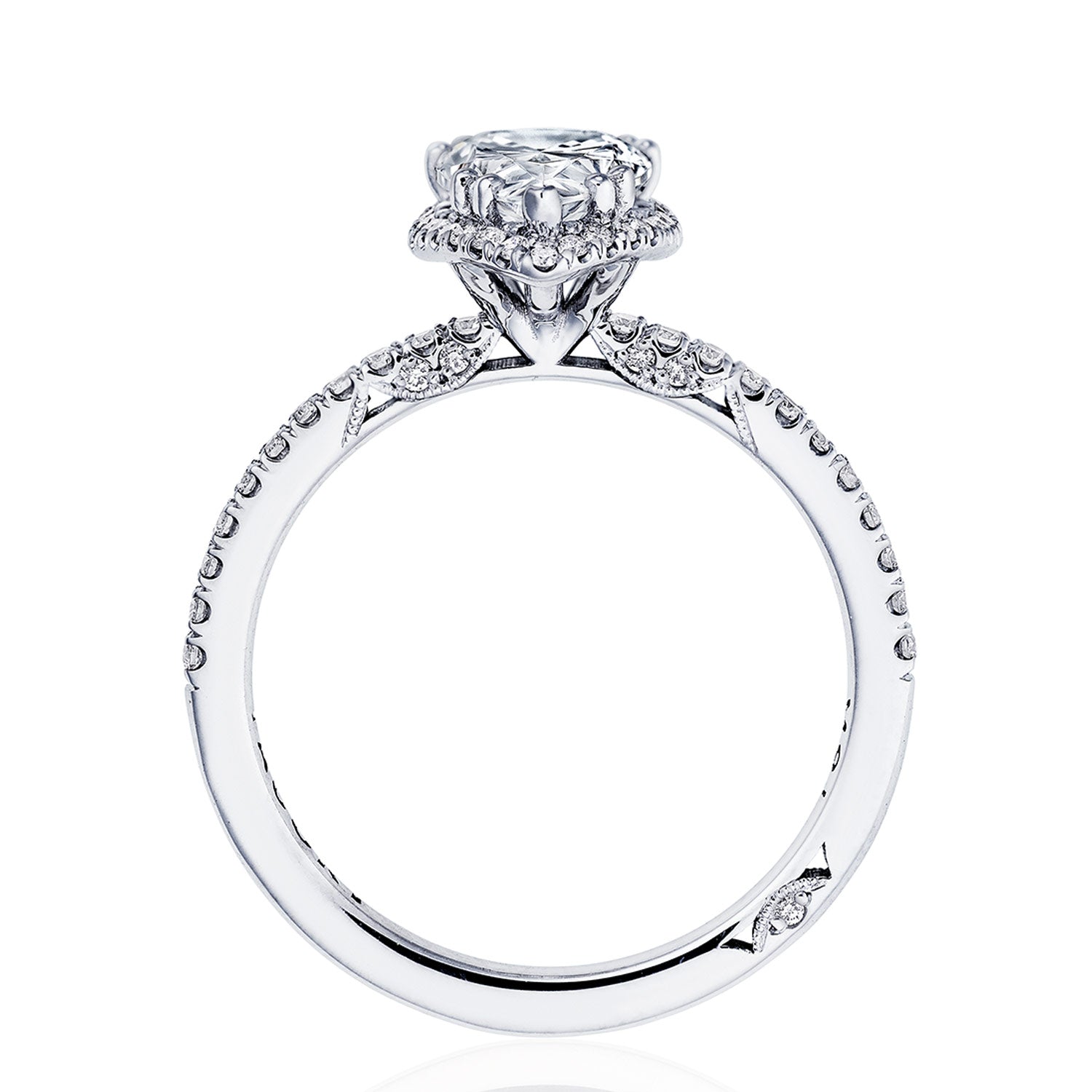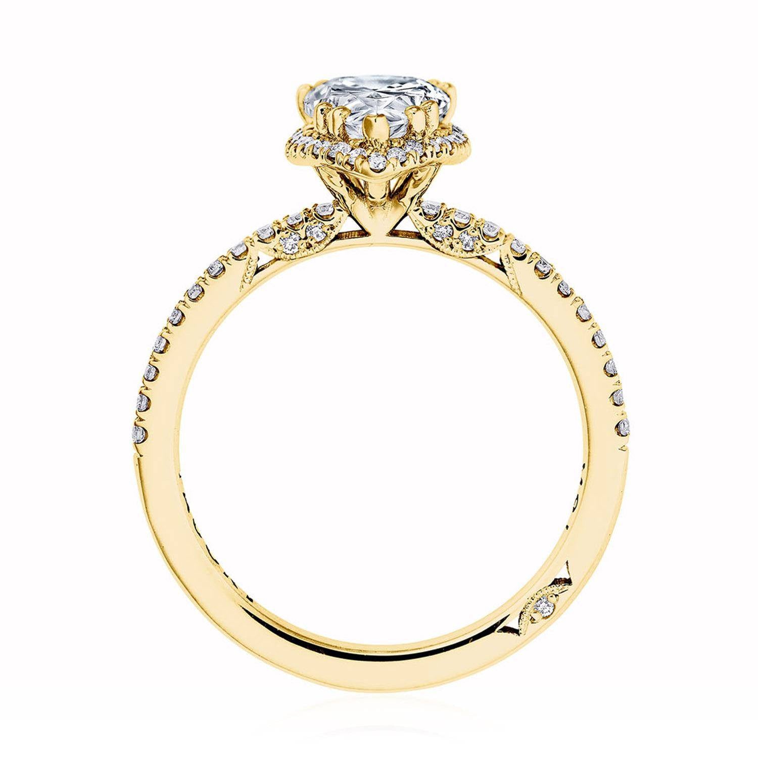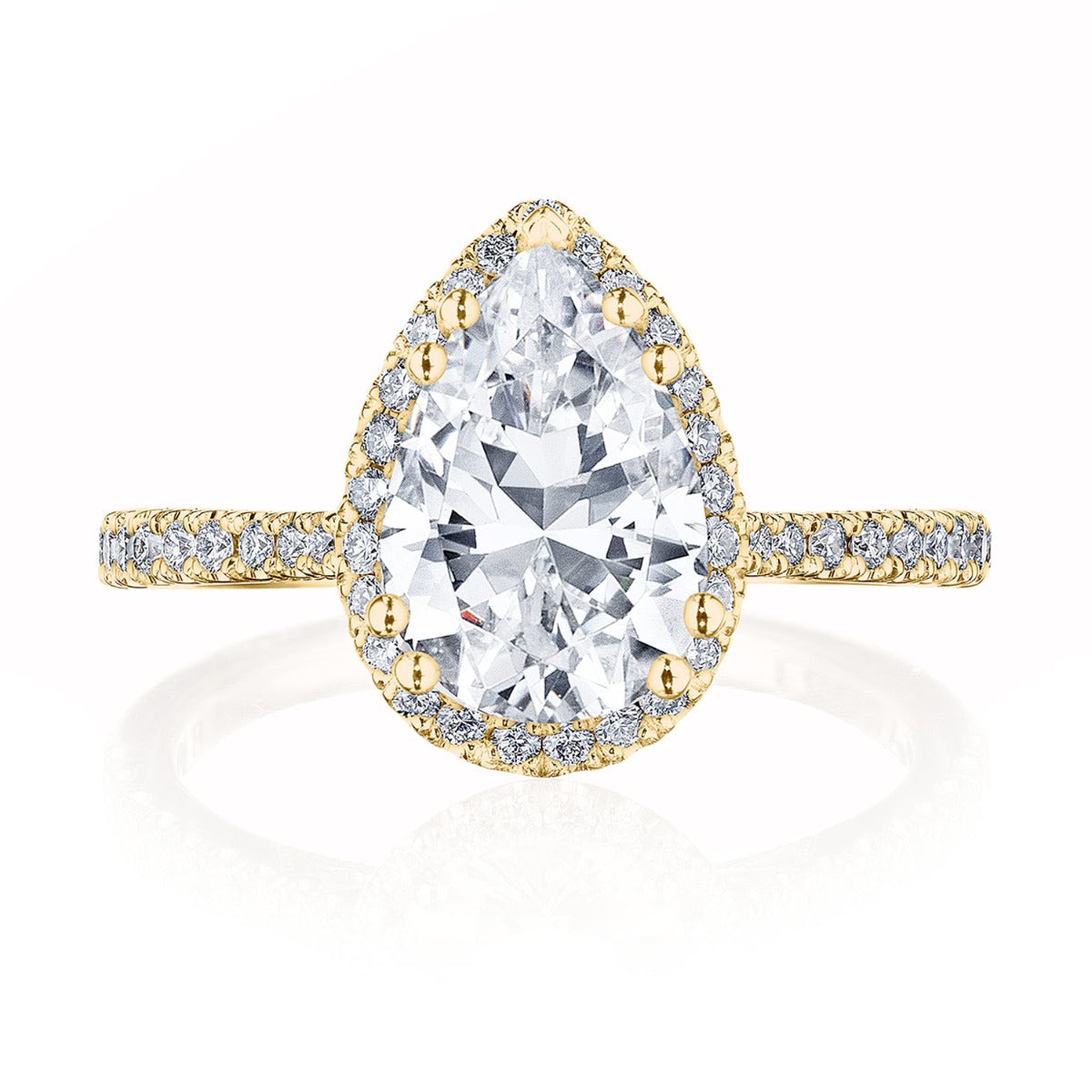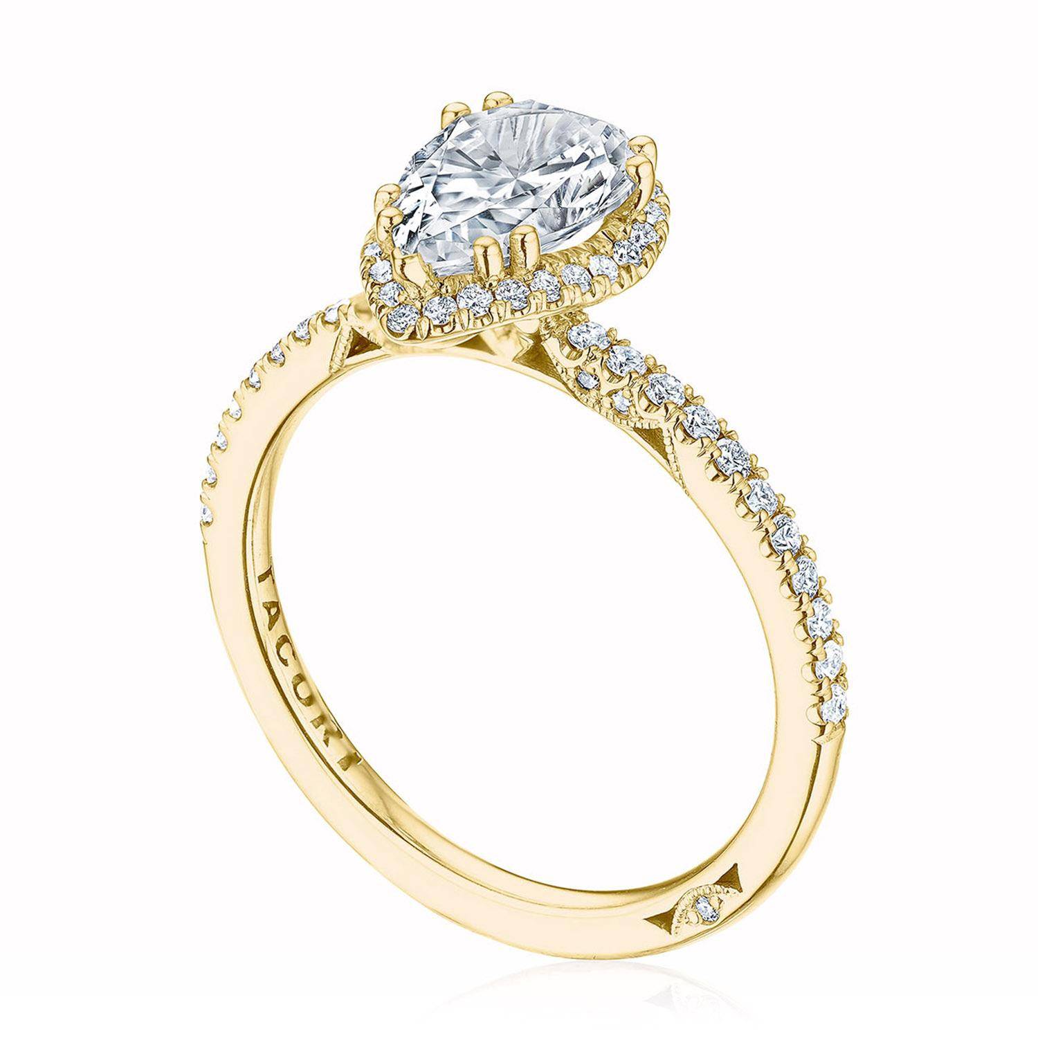 Contemporary and diamond-intense, with Simply TACORI Crescent Fabric and pavé-set diamonds adorning the ceiling. A stunning bloom around the fancy-cut pear solitare delivers brilliant detail. A signature Crescent marks the ring as Truly TACORI.