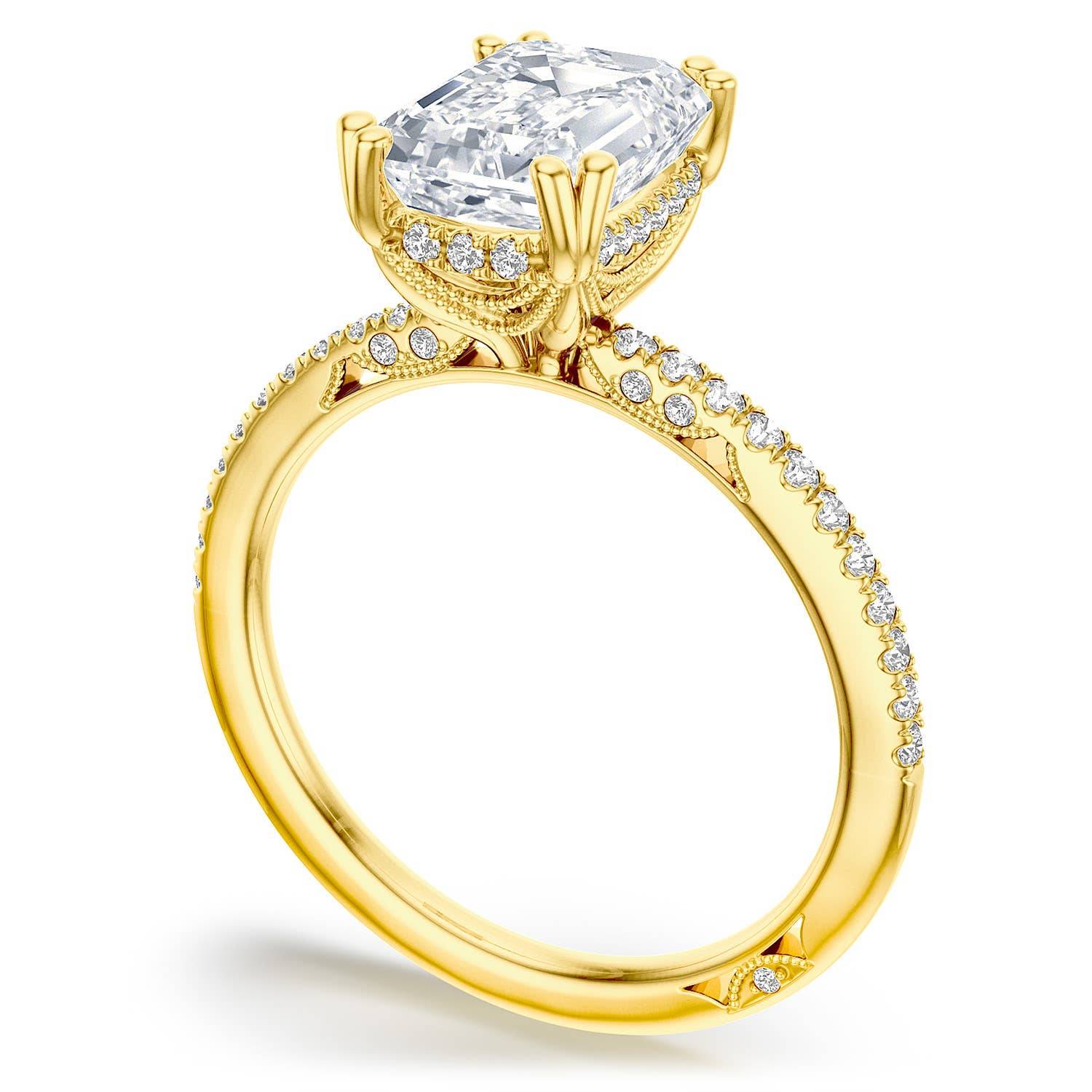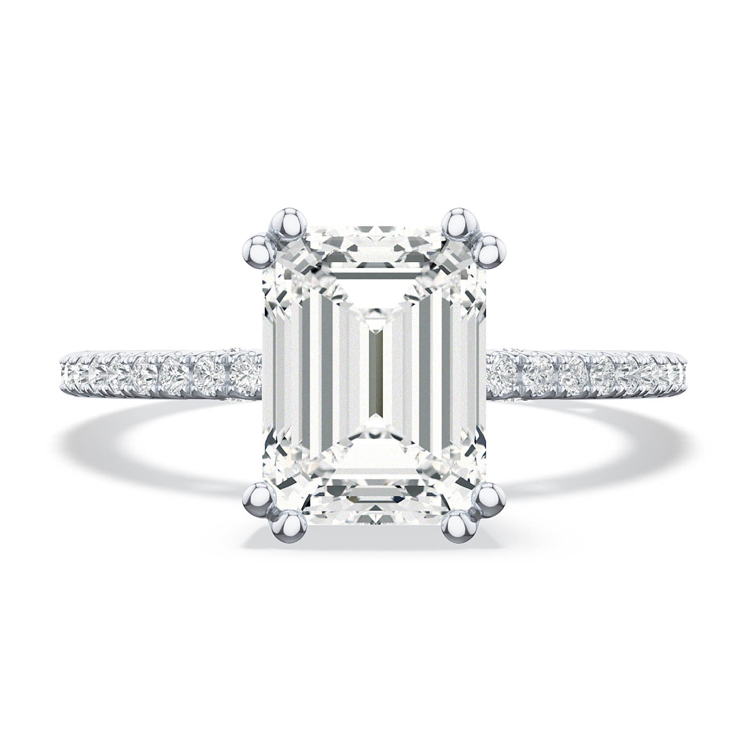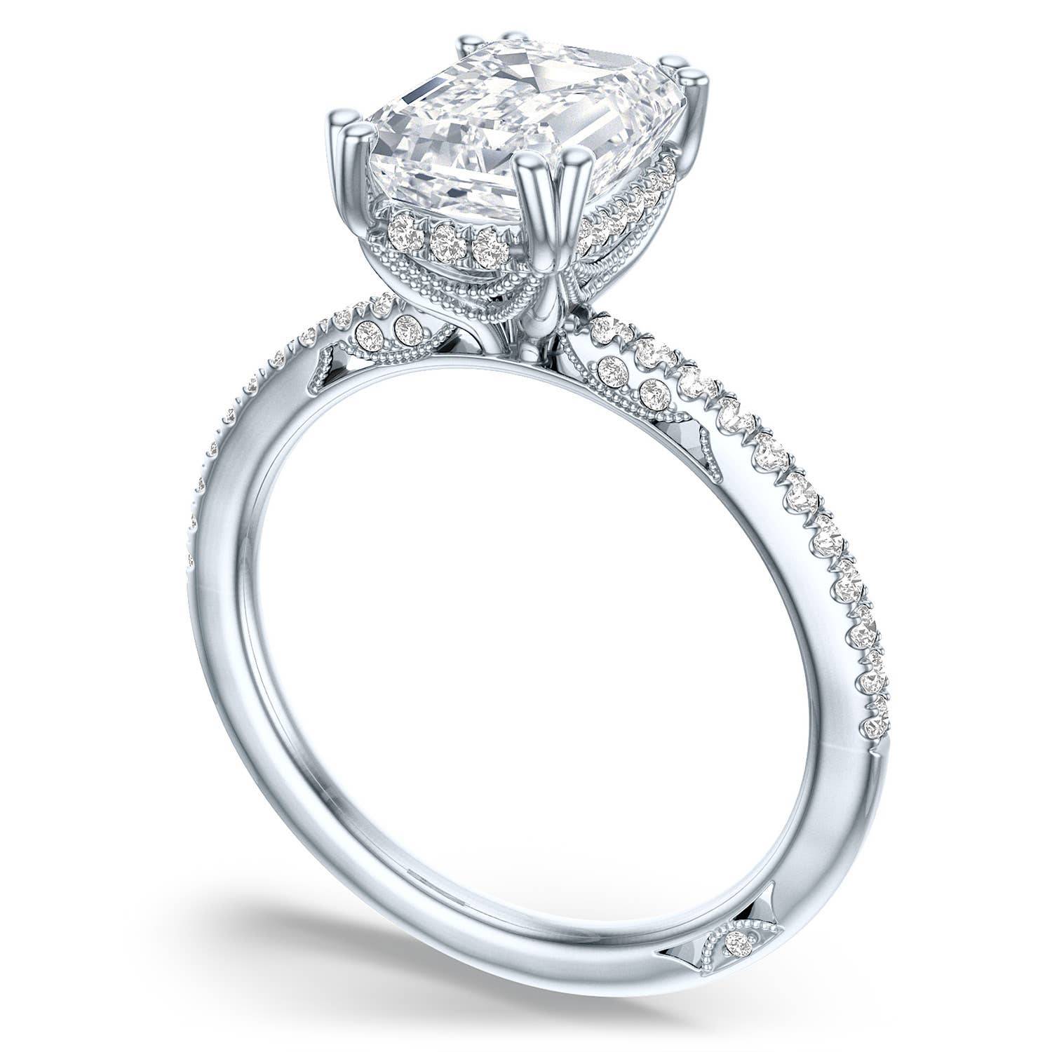 A bloomed emerald solitaire rests on a Cathedral foundation above a pavé ceiling and a Simply TACORI inner face. Stunning milgrain is inspired by the draping found in bridal gowns, and evokes couture bridal wear.