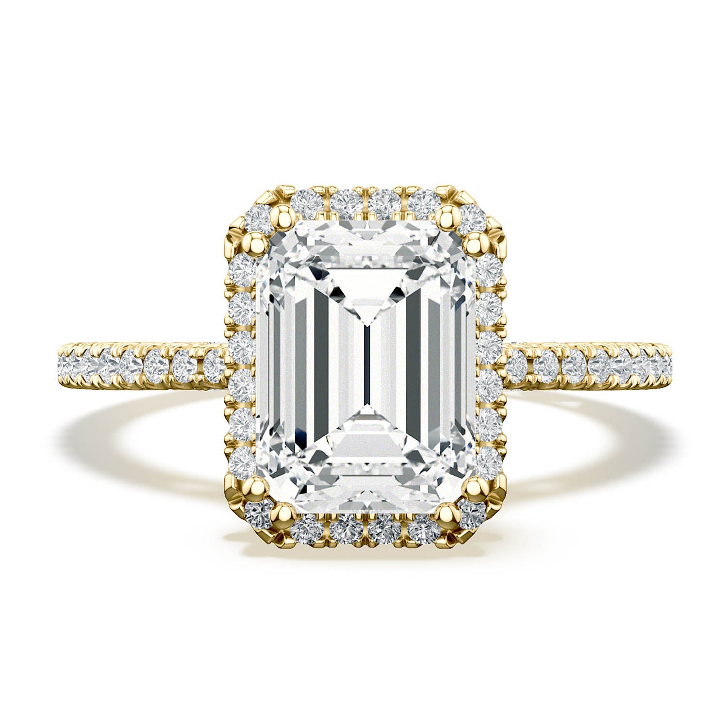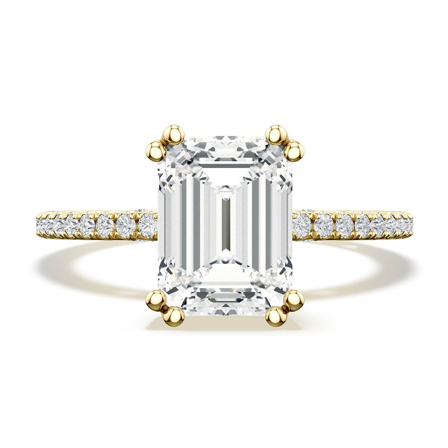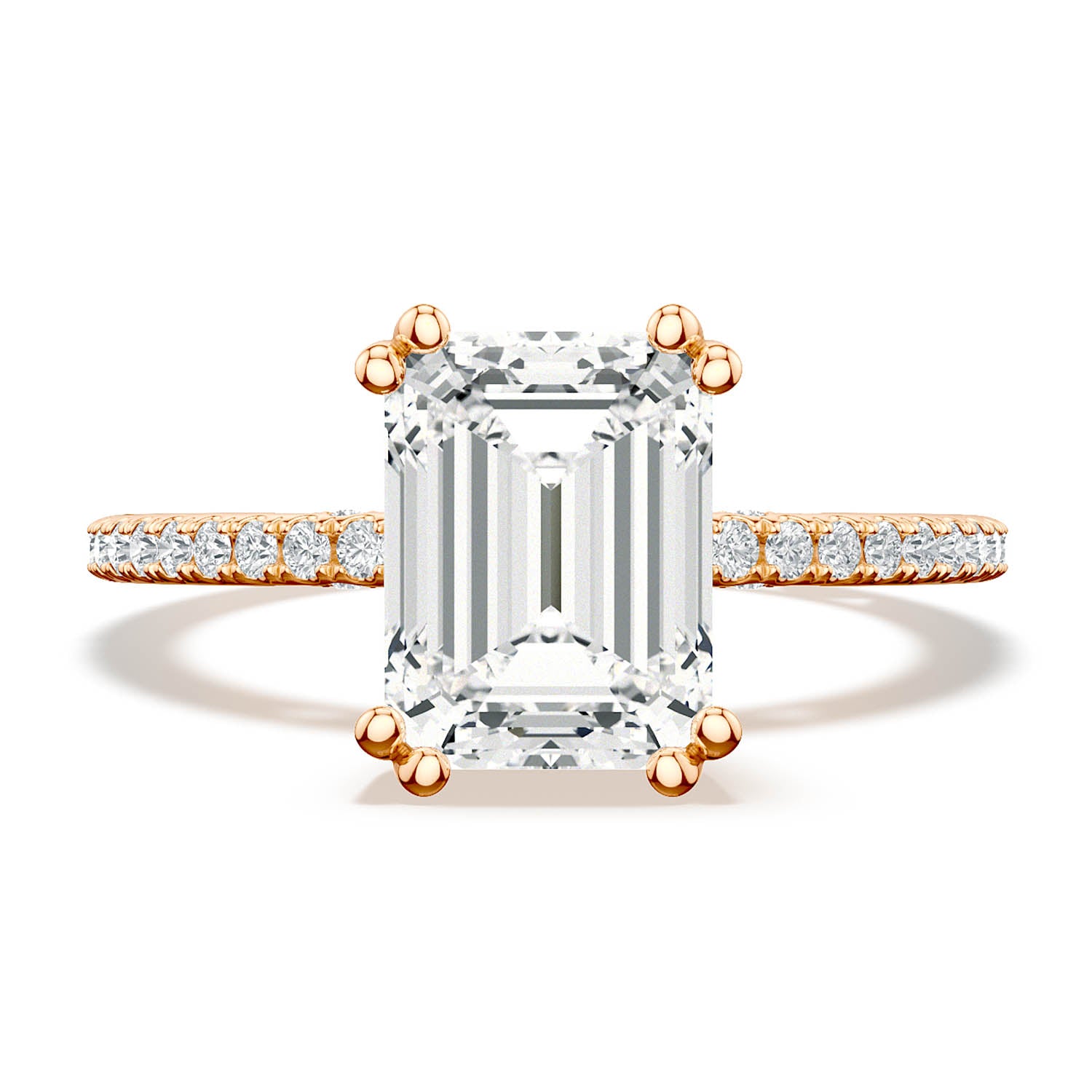 A bloomed emerald solitaire rests on a Cathedral foundation above a pavé ceiling and a Simply TACORI inner face. Stunning milgrain is inspired by the draping found in bridal gowns, and evokes couture bridal wear.