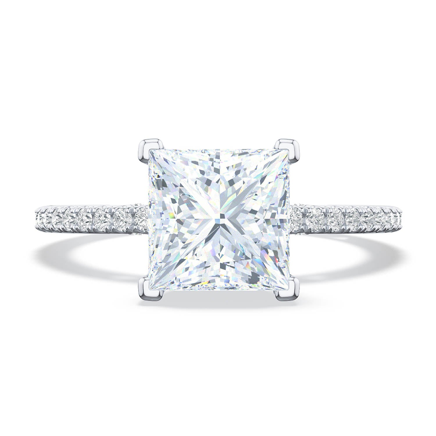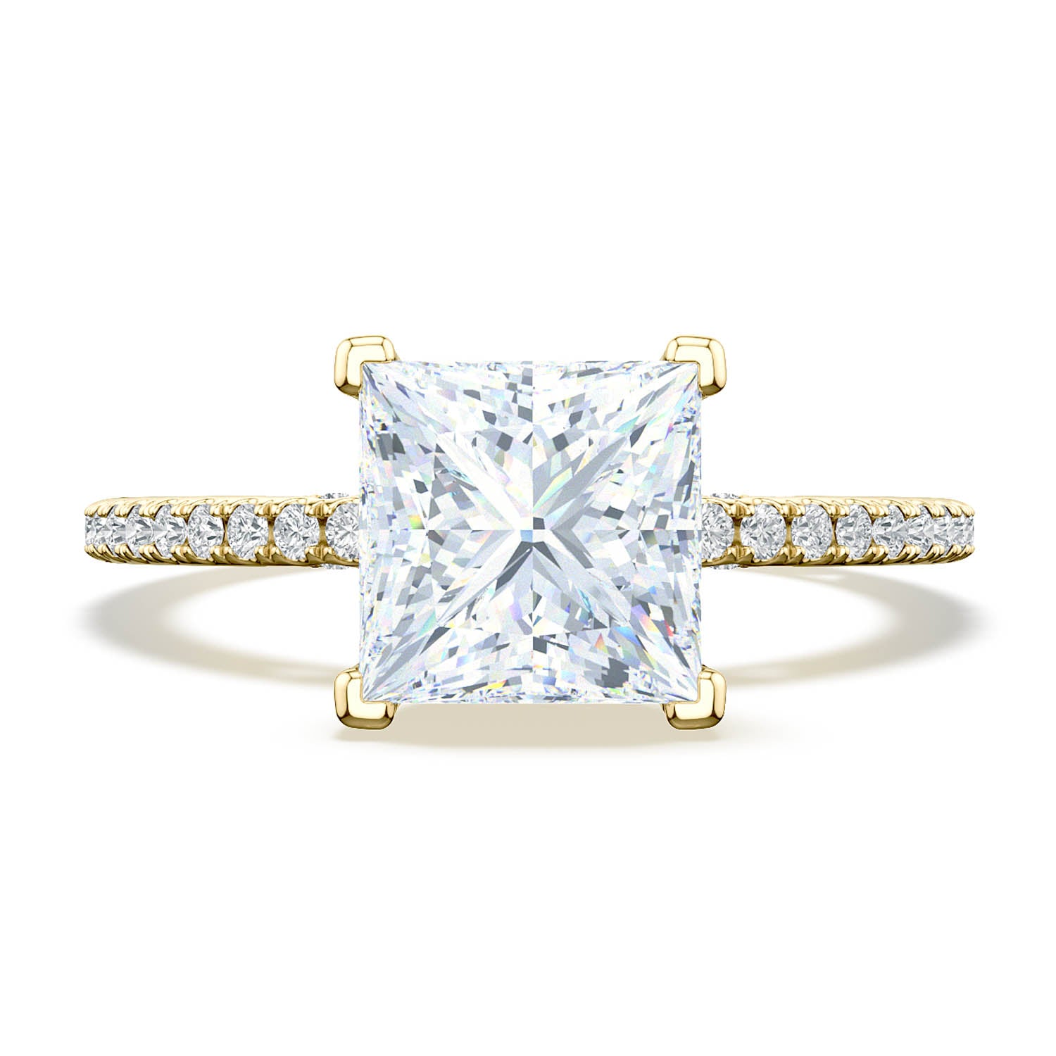 Let your brilliant princess center shine in this timeless engagement ring. A sleek high polished ring with hidden diamond details along the inner face brings your princess center to life.