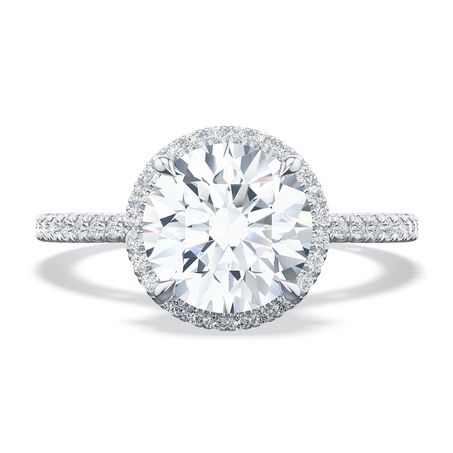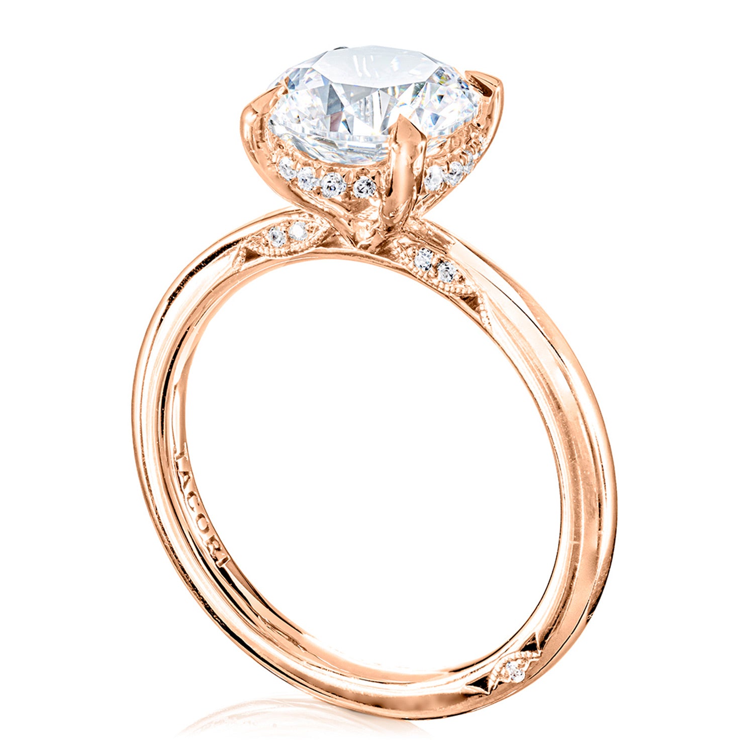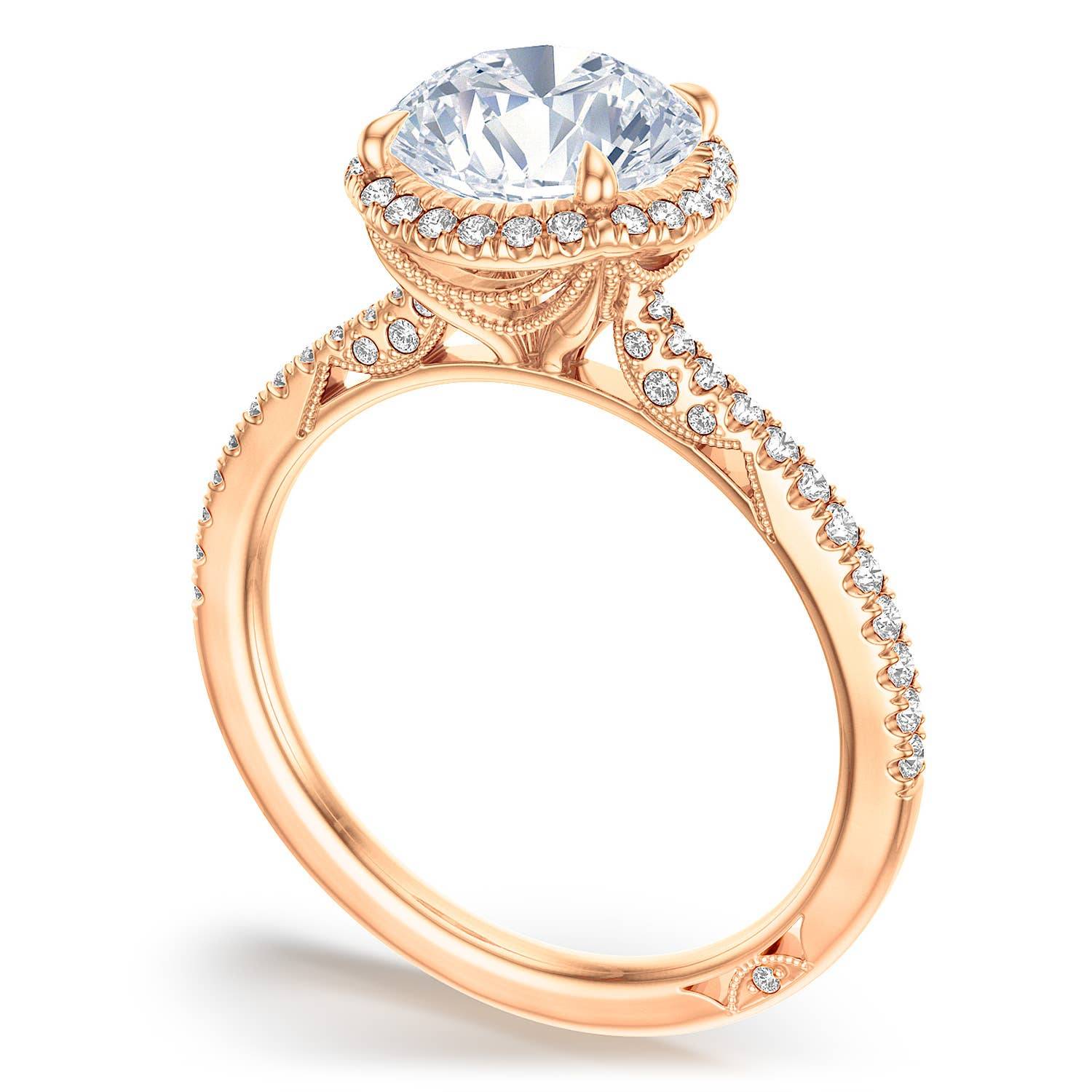 A bloomed round brilliant solitaire rests on a Cathedral foundation above a pavé ceiling and a Simply TACORI inner face. Stunning milgrain is inspired by the draping found in bridal gowns, and evokes couture bridal wear.