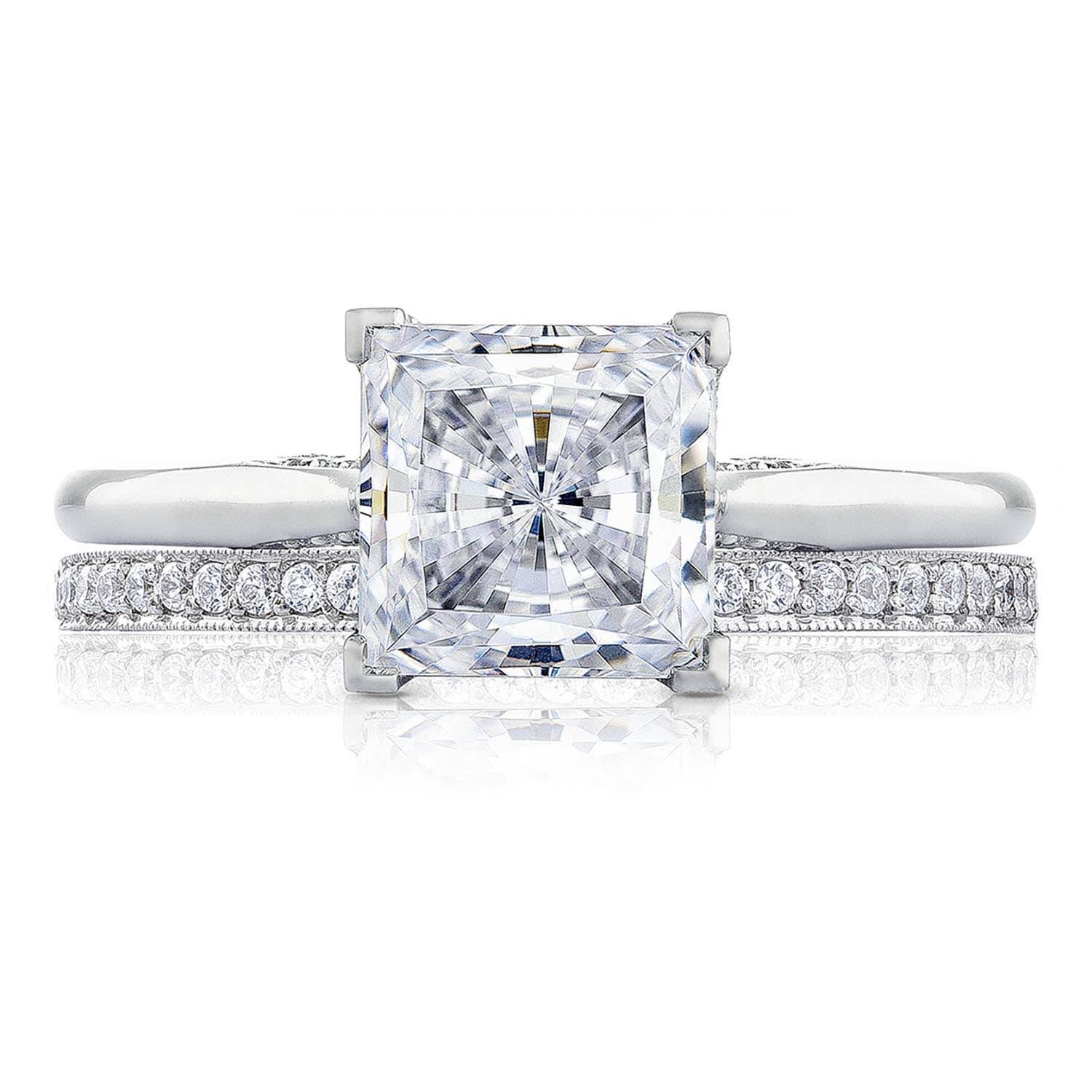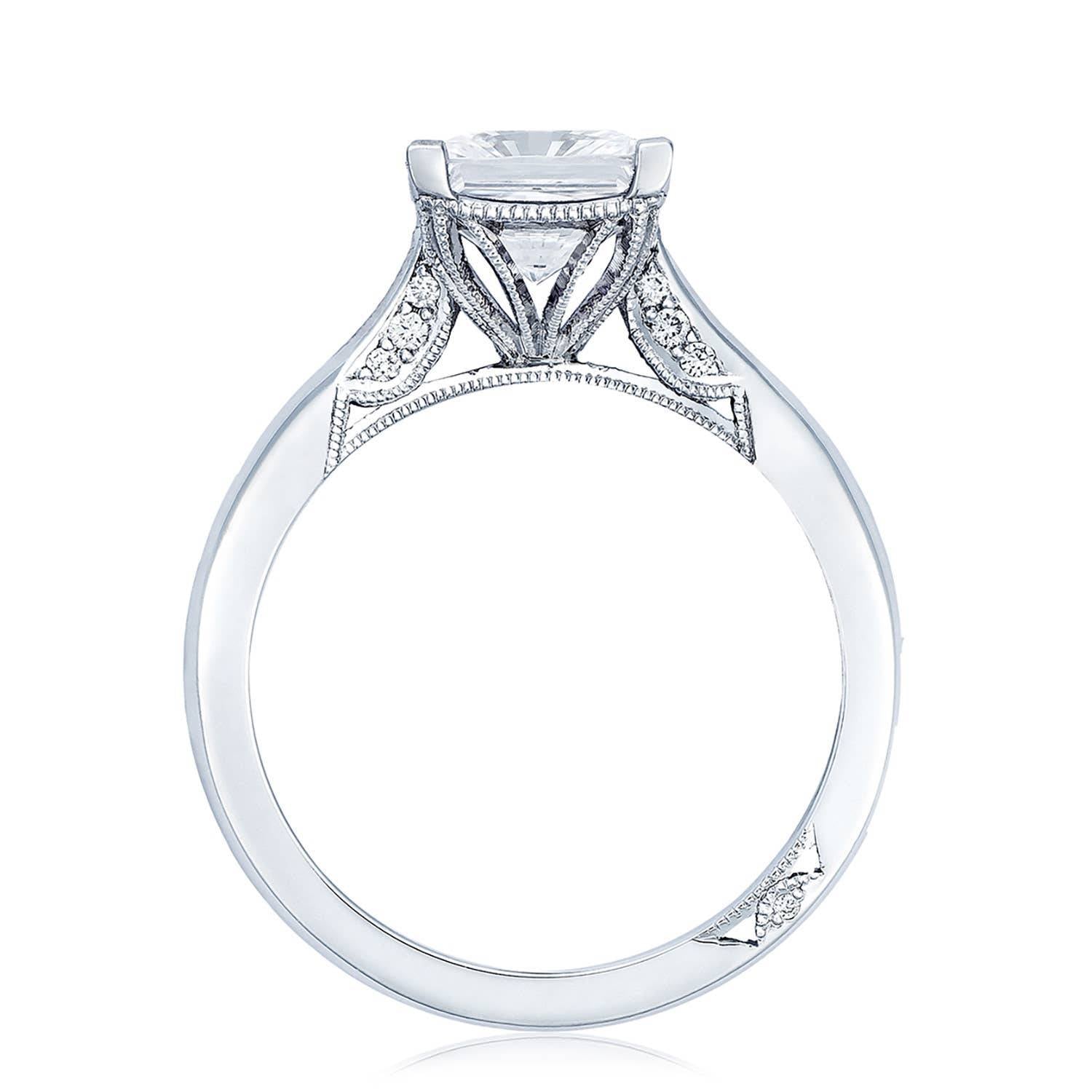 Two marquise side stones embrace the princess-shape center stone, which its on a diamond-decorated Cathedral foundation. Raised TACORI crescents and outlines of delicate milgrain beading are reminiscient of the elegant draping of bridal fabric.