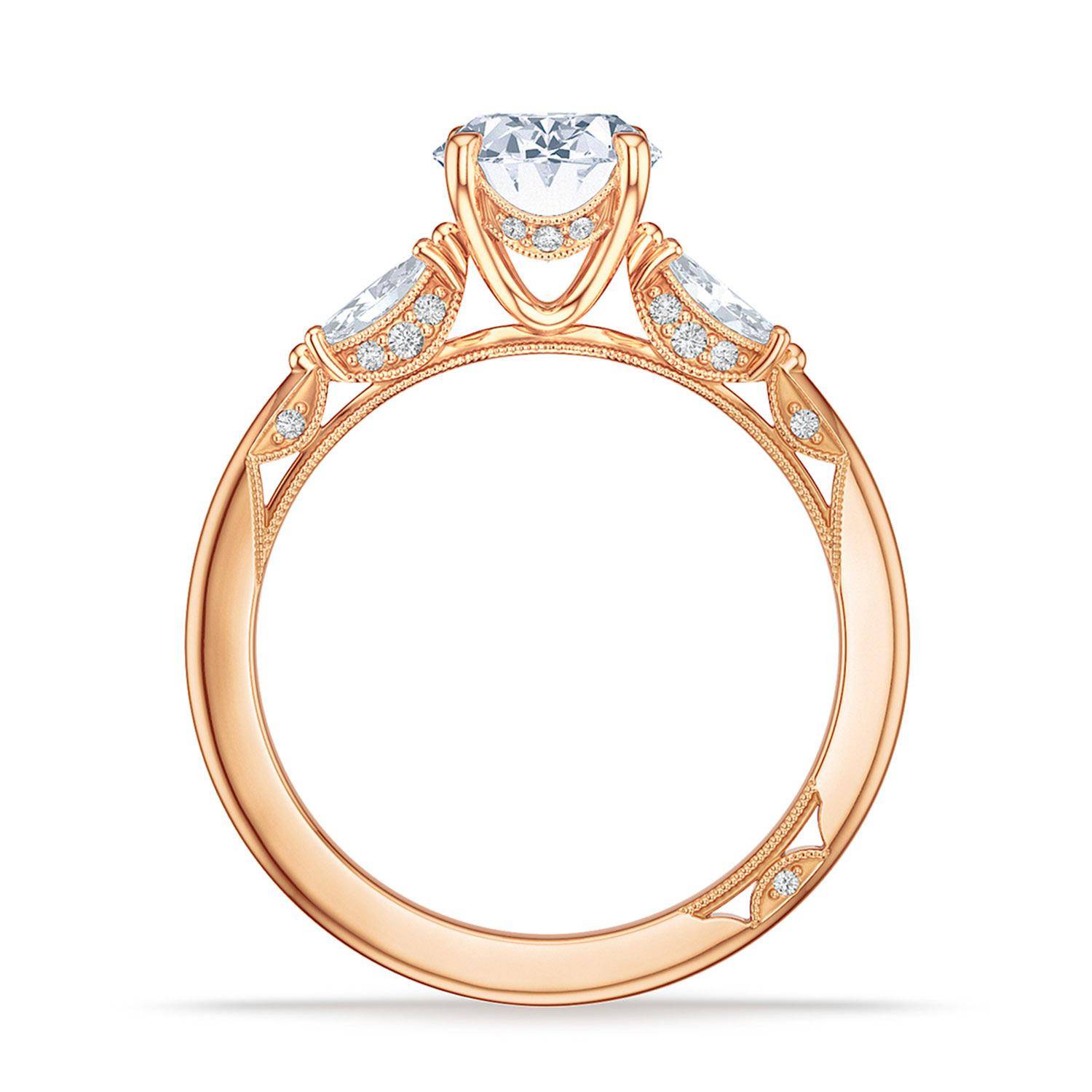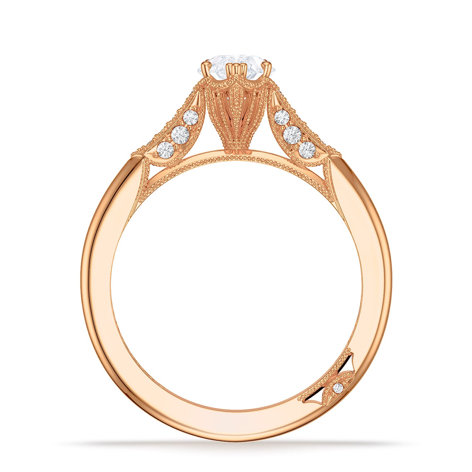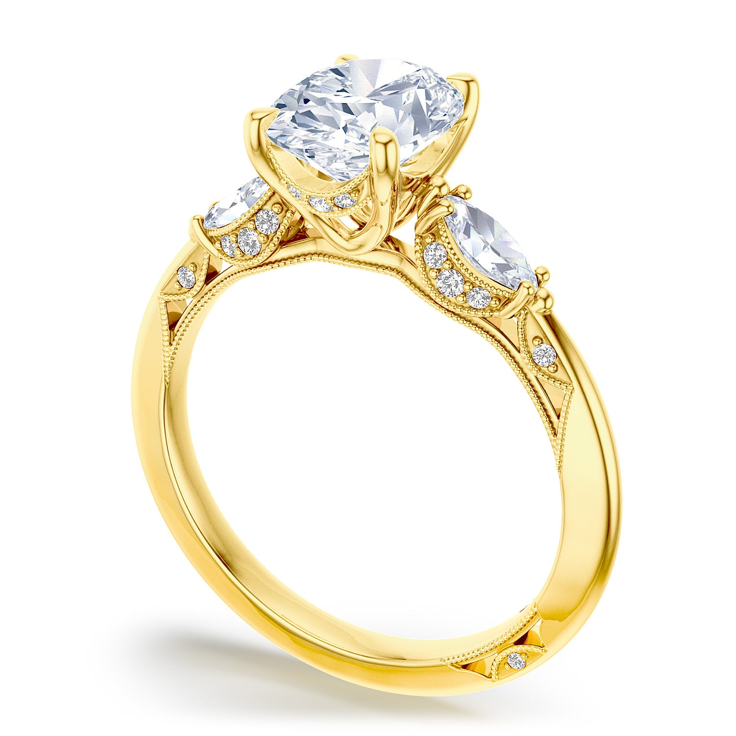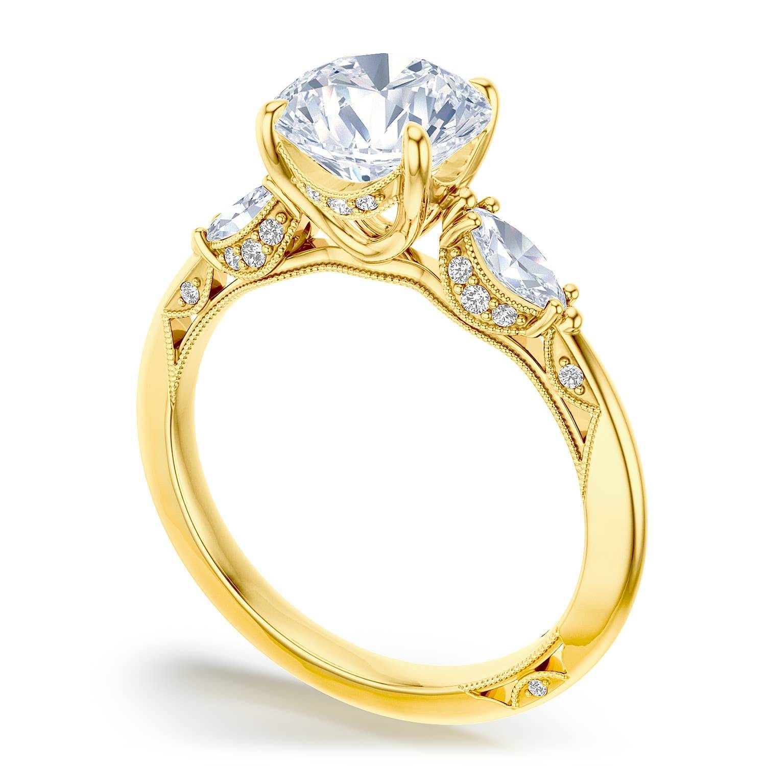 Two marquise side stones embrace the round-brilliant center stone, which its on a diamond-decorated Cathedral foundation. Raised TACORI crescents and outlines of delicate milgrain beading are reminiscient of the elegant draping of bridal fabric.