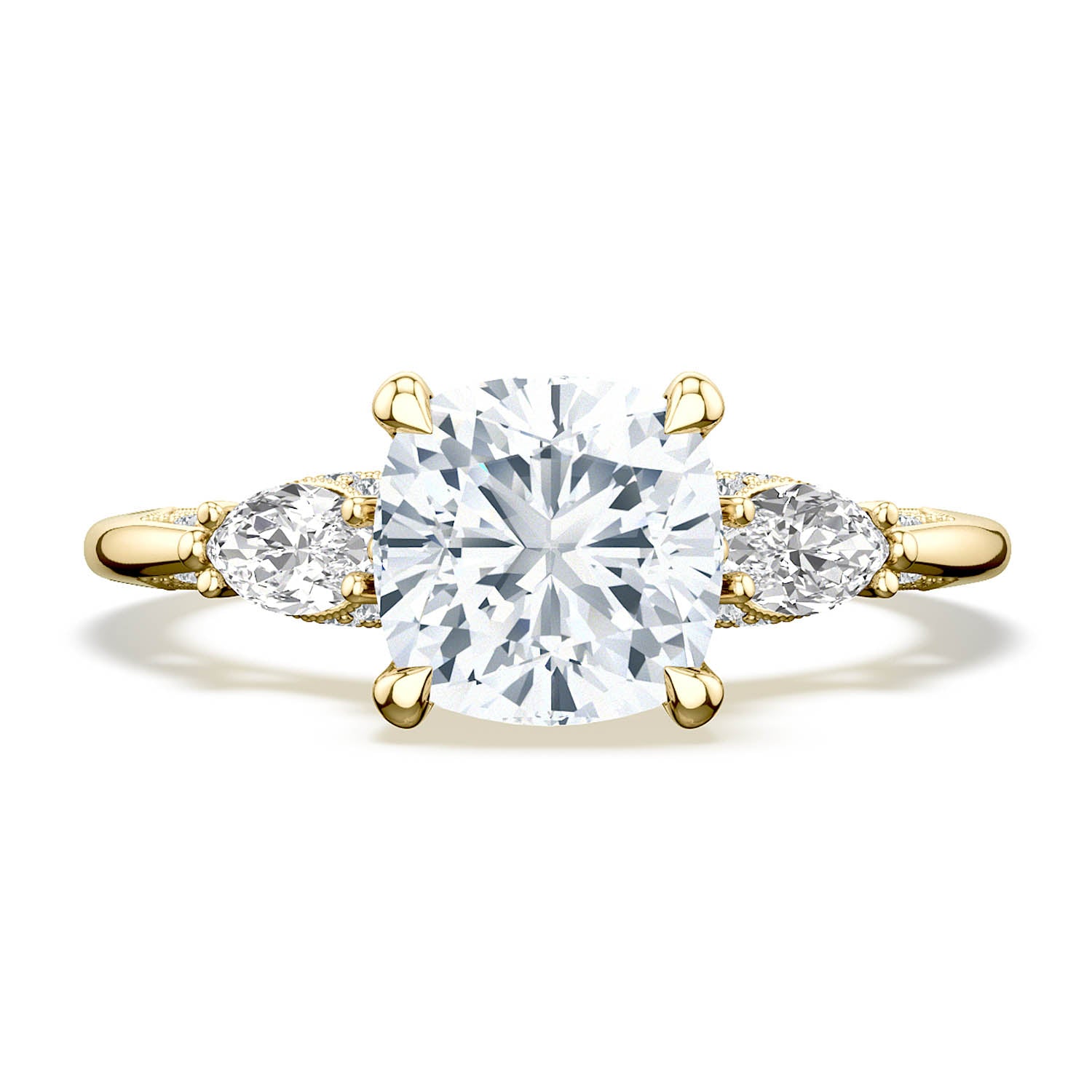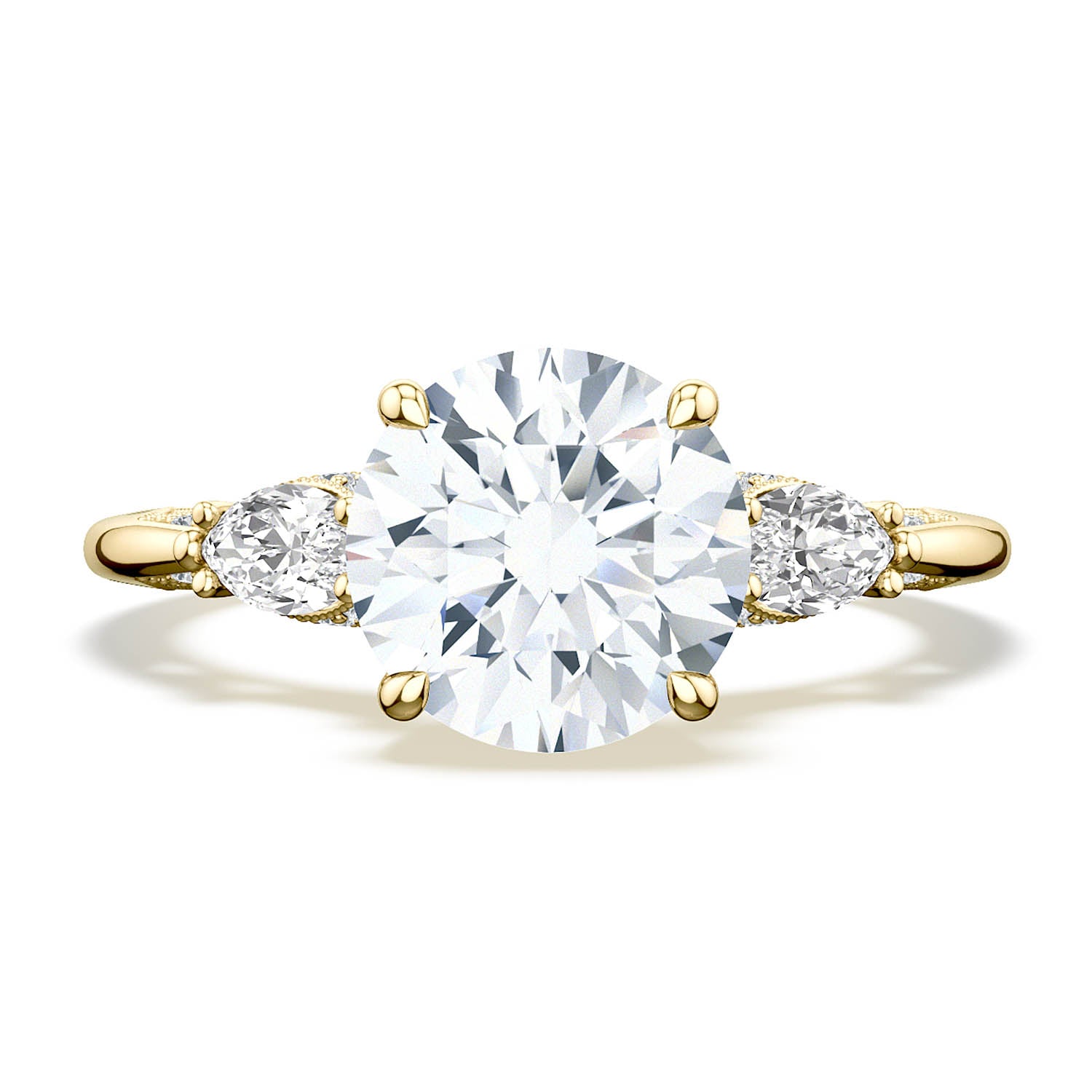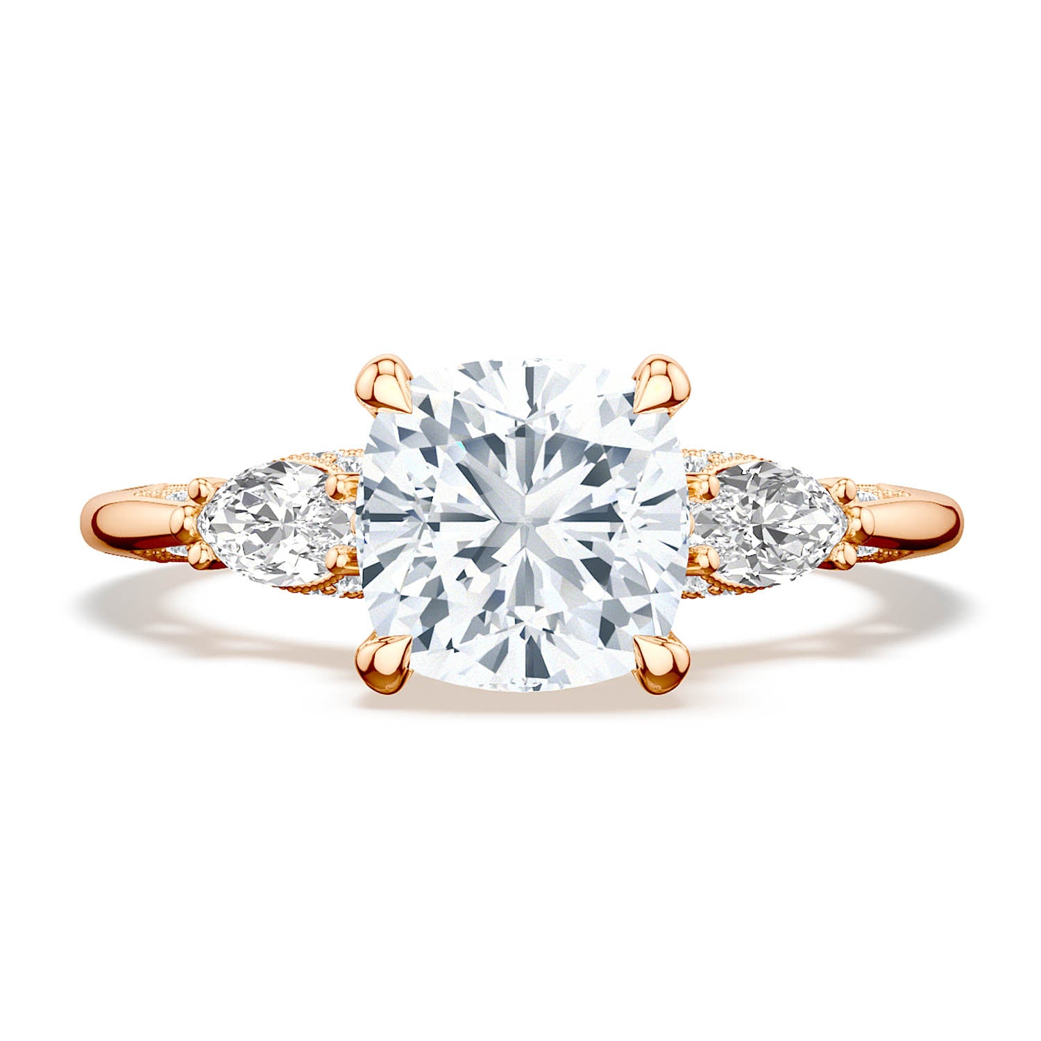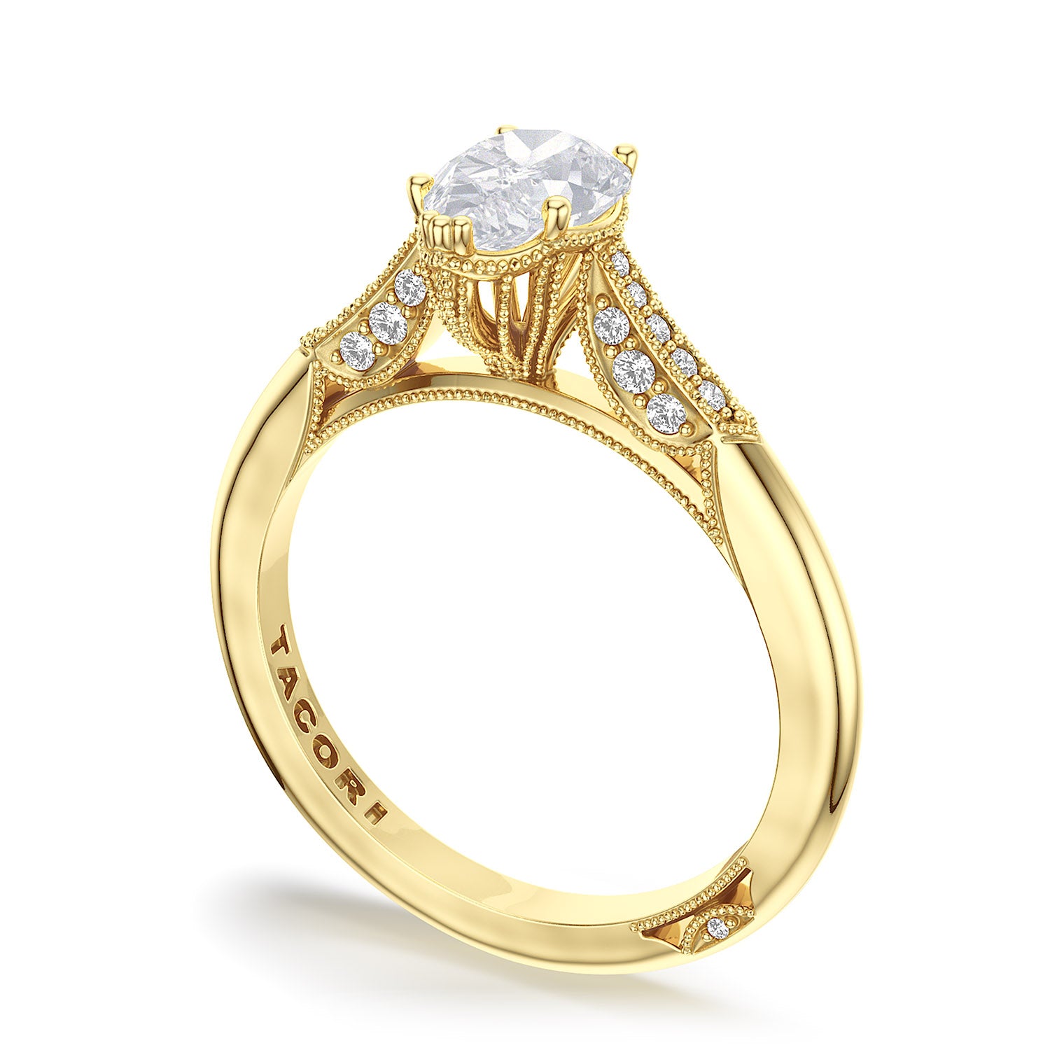 Two marquise side stones embrace the pear-shape center stone, which its on a diamond-decorated Cathedral foundation. Raised TACORI crescents and outlines of delicate milgrain beading are reminiscient of the elegant draping of bridal fabric.
