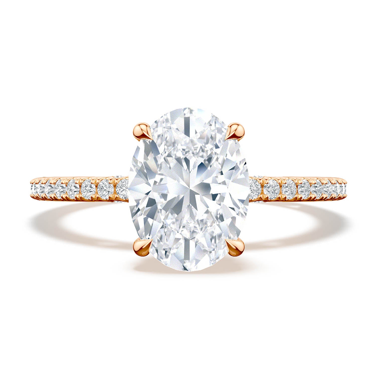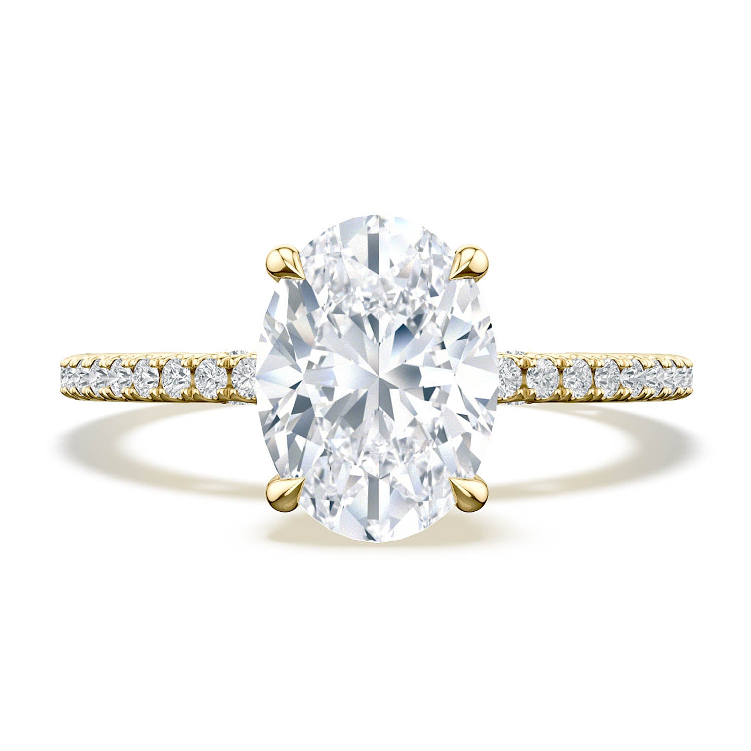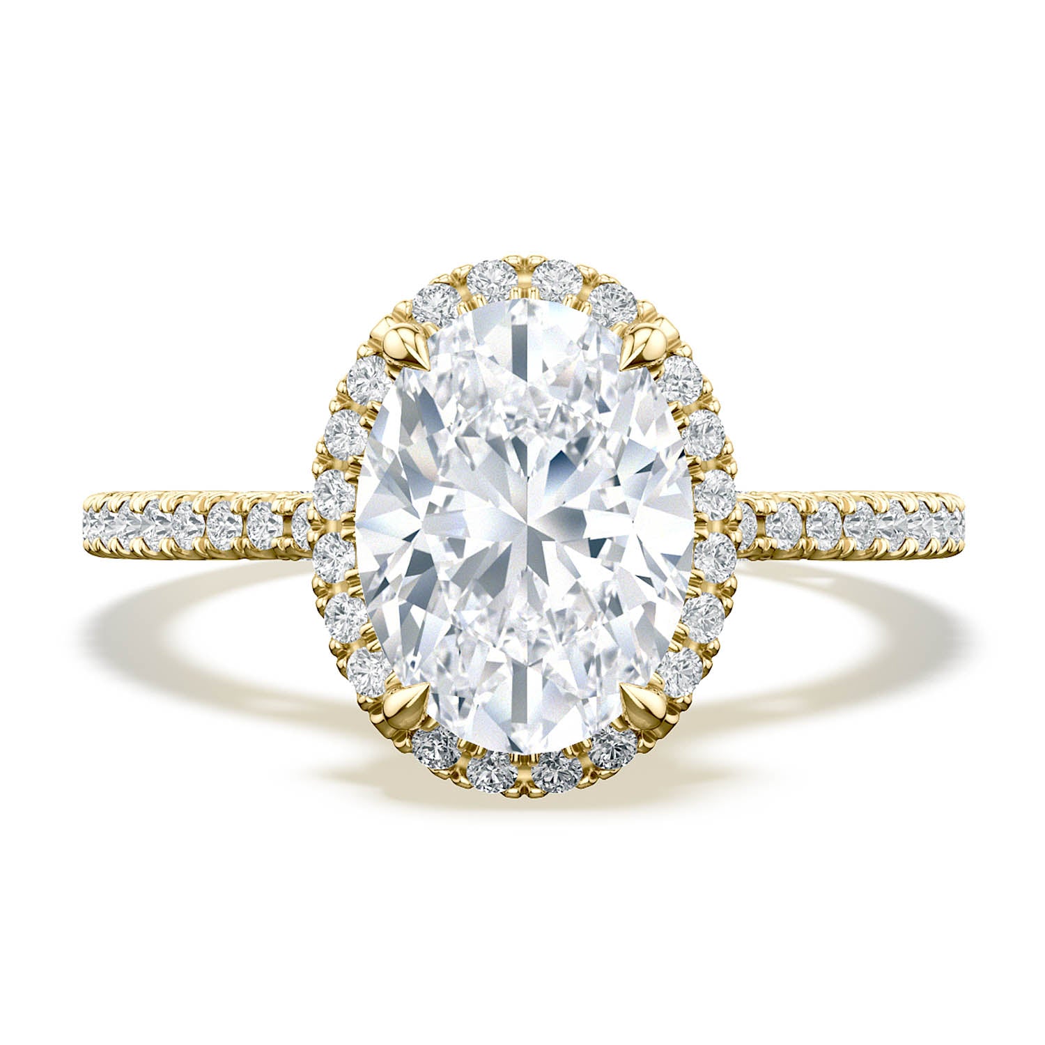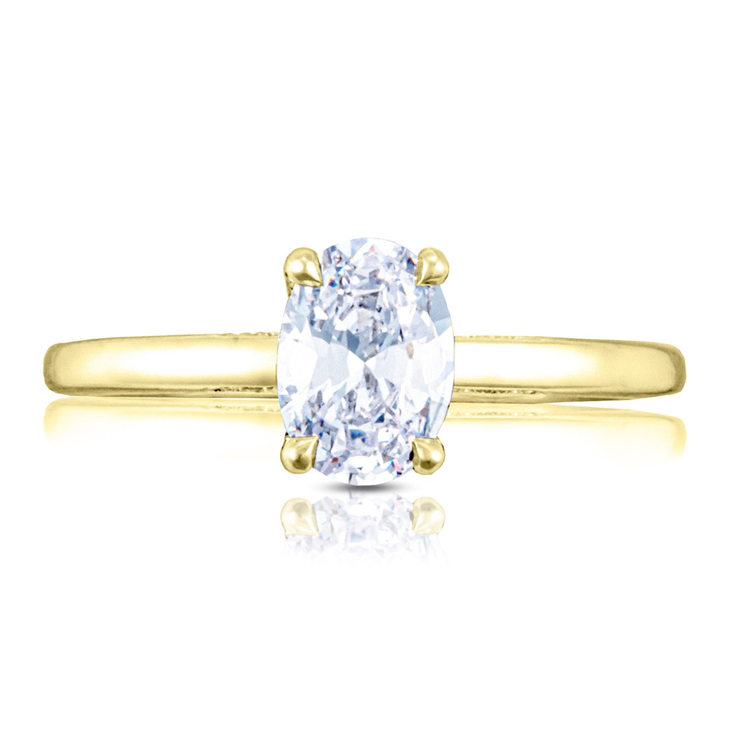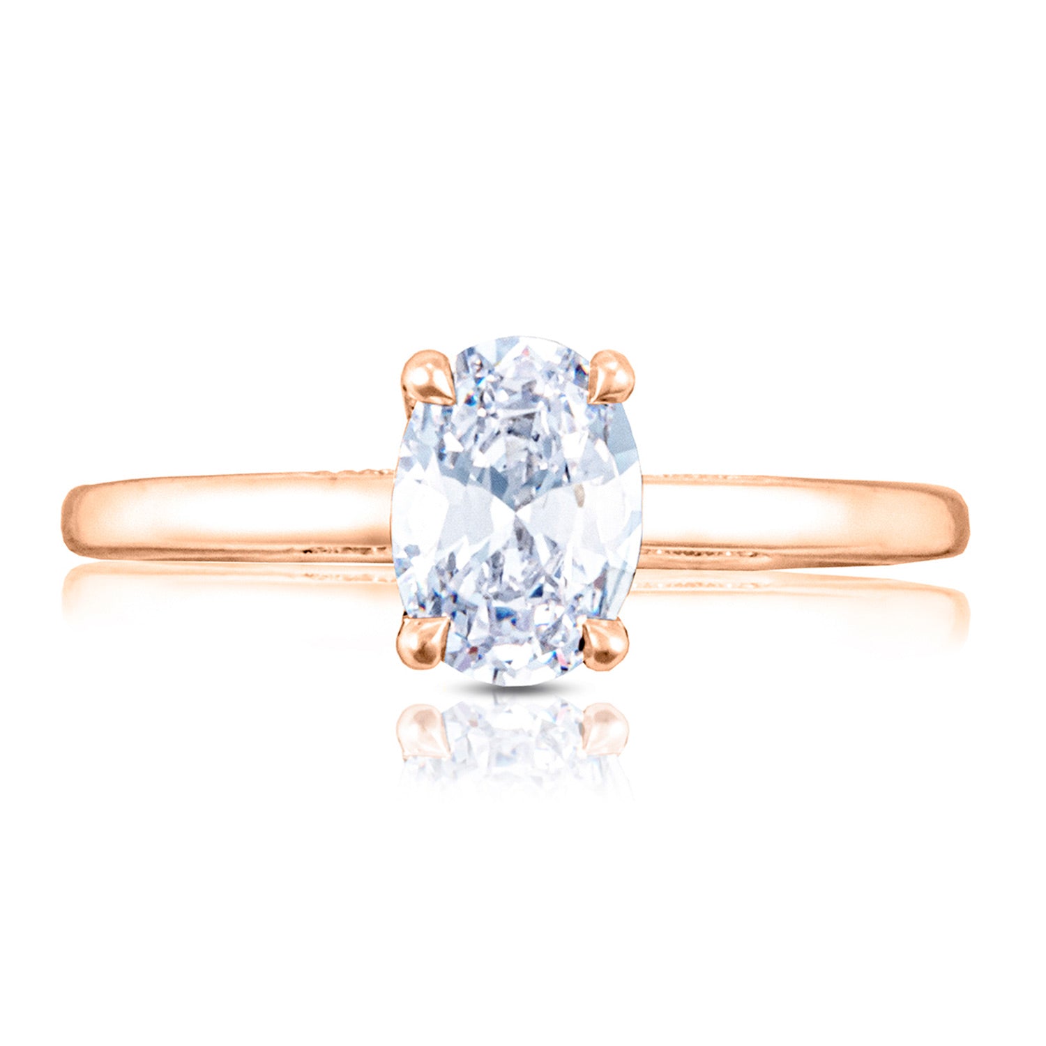 A bloomed oval solitaire rests on a Cathedral foundation above a pavé ceiling and a Simply TACORI inner face. Stunning milgrain is inspired by the draping found in bridal gowns, and evokes couture bridal wear.