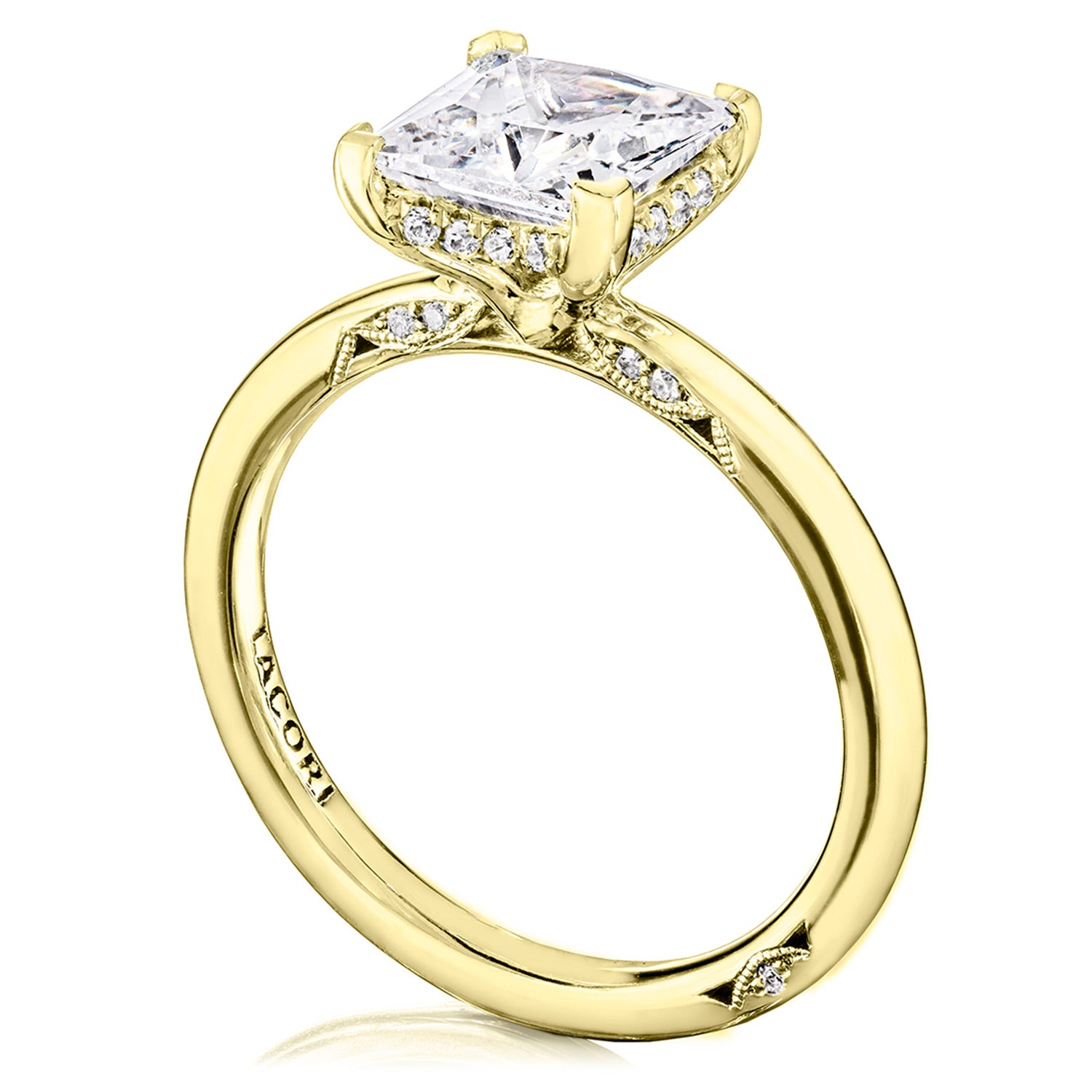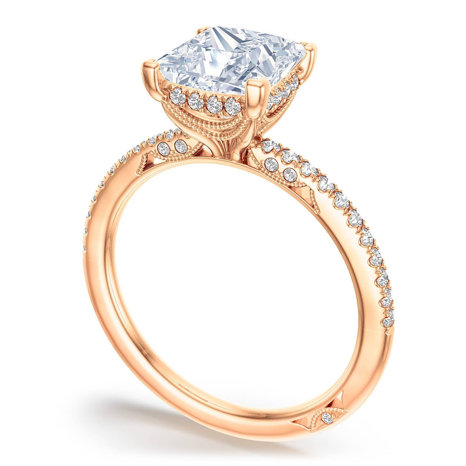 A bloomed princess solitaire rests on a Cathedral foundation above a pavé ceiling and a Simply TACORI inner face. Stunning milgrain is inspired by the draping found in bridal gowns, and evokes couture bridal wear.
