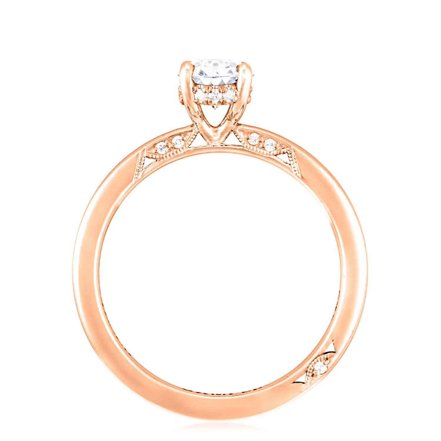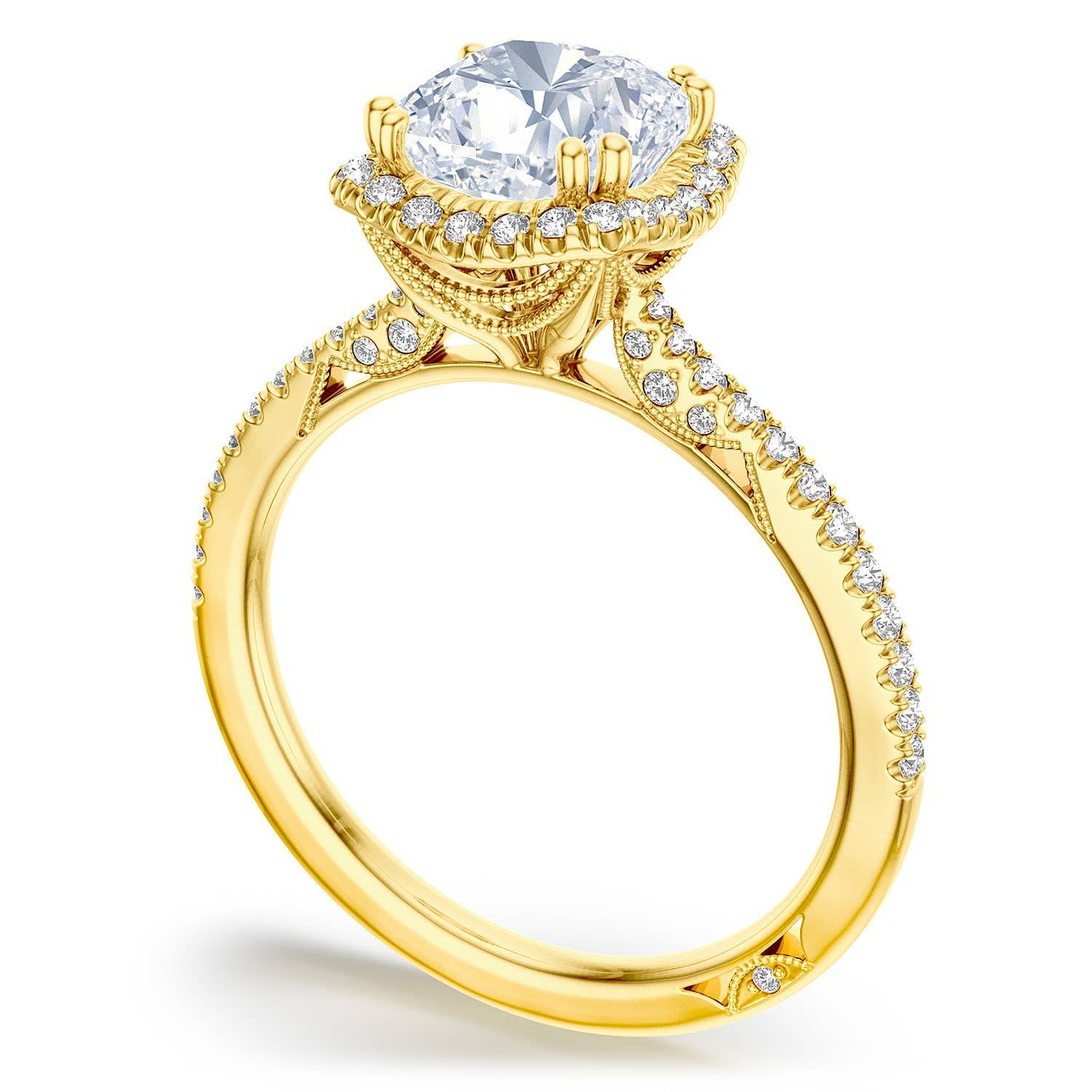 Features a Classic 360 foundation with a high polish finish. The iconic Simply Tacori crescent fabric decorates the ring with delicate diamond and milgrain detailing, while a hidden bloom beneath the crown adds an all-angles sparkle.