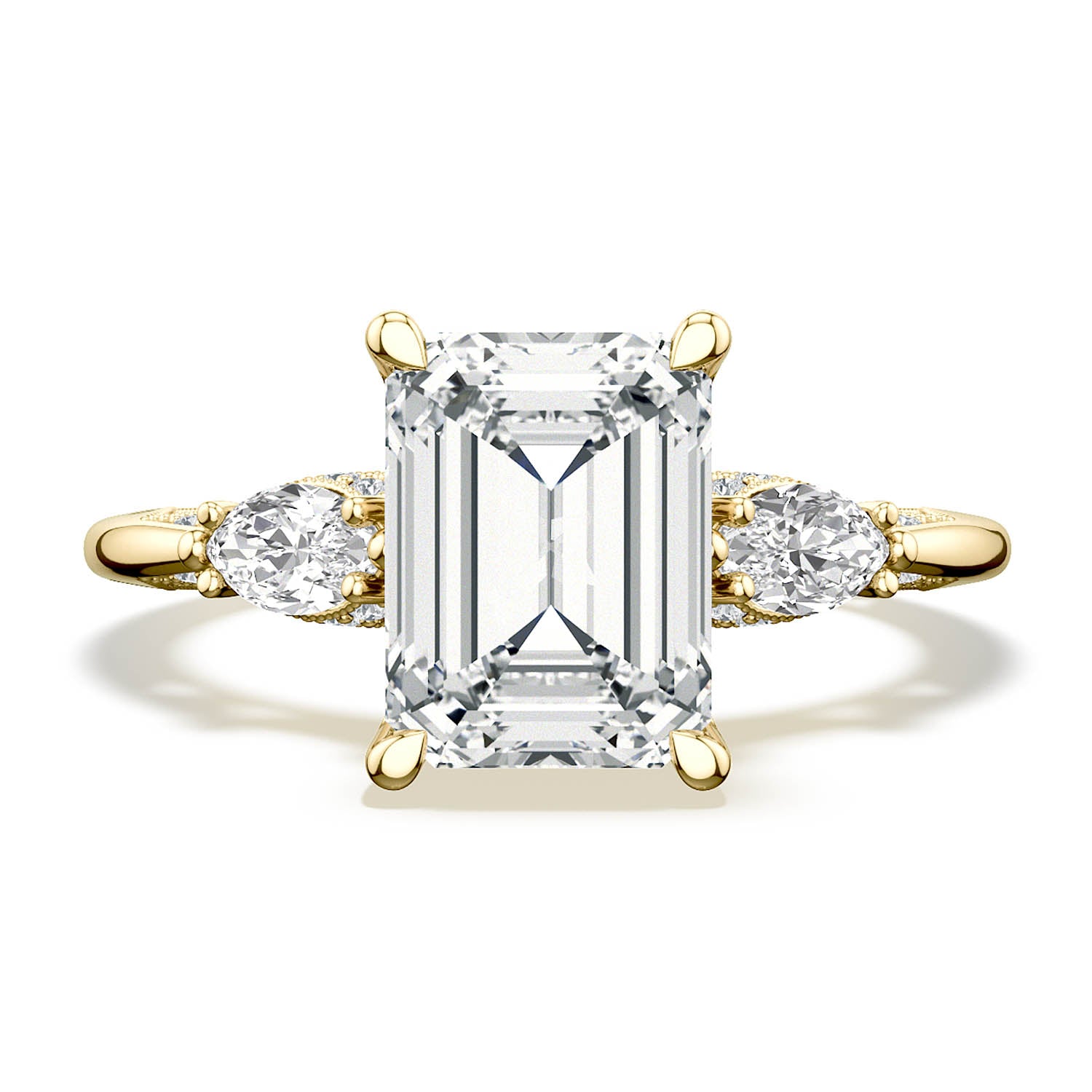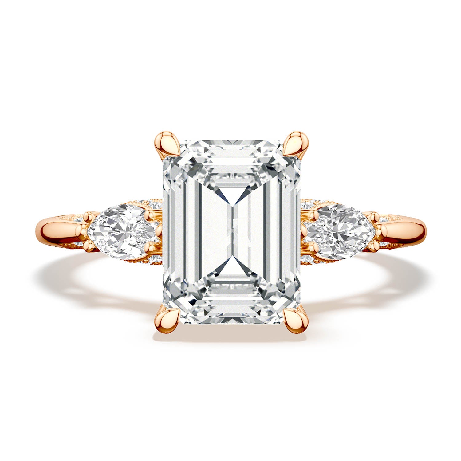 Two marquise side stones embrace the emerald center stone, which its on a diamond-decorated Cathedral foundation. Raised TACORI crescents and outlines of delicate milgrain beading are reminiscient of the elegant draping of bridal fabric.