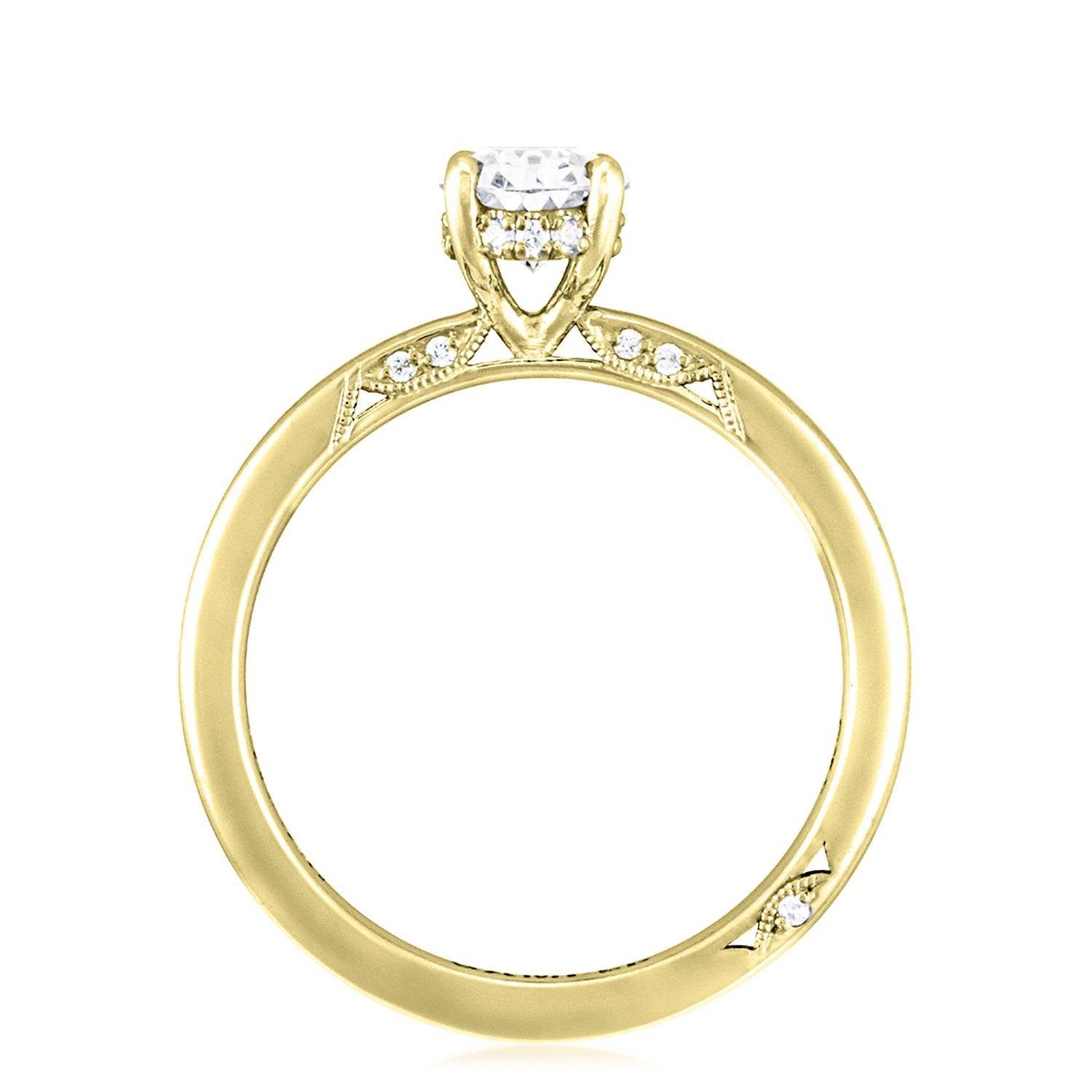 Two round-brilliant side stones and diamond pavé on the ceiling accentuate the solitaire, which sits on a milgrain-studded Cathedral foundation. Simply Tacori crescent fabric decorates the upper innerface of the ring with more dimond detailing.