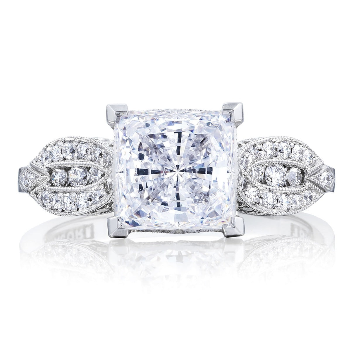 Pave-set diamonds on the ceiling twist towards the princess-cut center stone in this diamond-intense design. Beneath the crown, Simply Tacori crescent detailing adds detail to the innerface of the band.