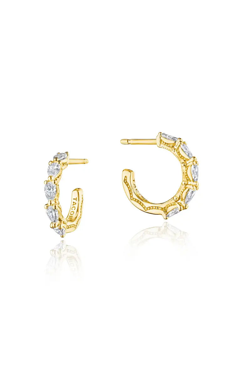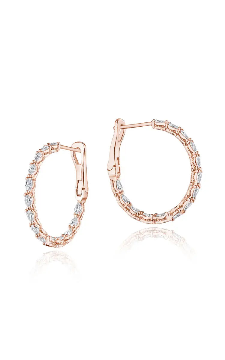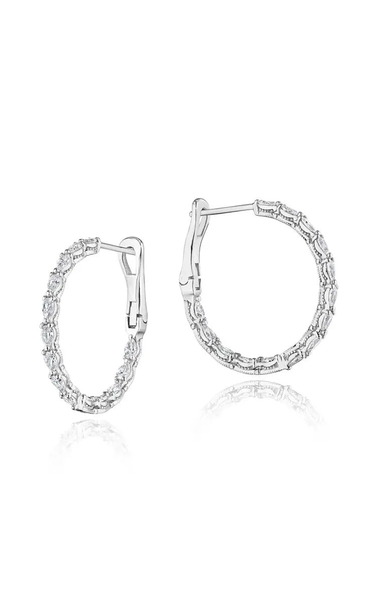 Delicate hoop earrings of 18k White Gold are meticulously hand-set with marquise and round brilliant cut diamonds. Milgrain-studded TACORI Crescent detailing decorates the silhouette.