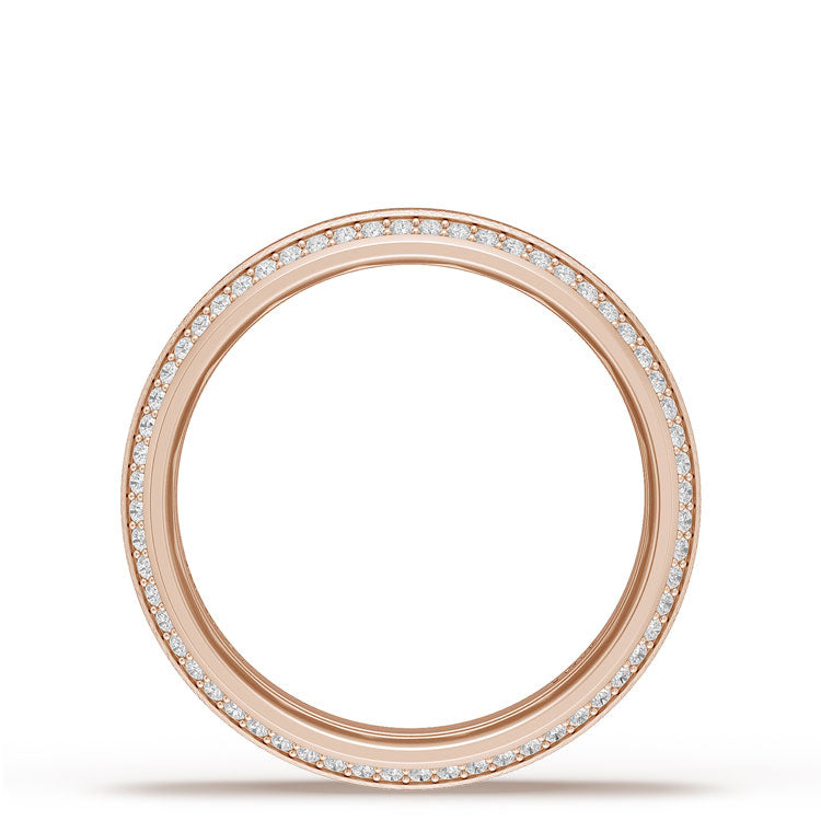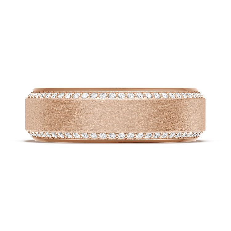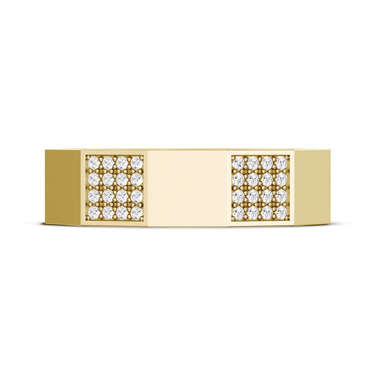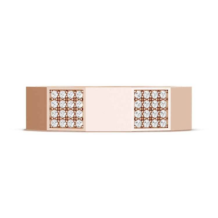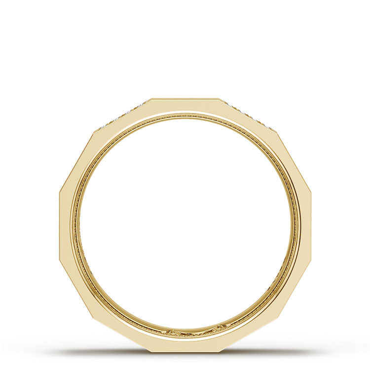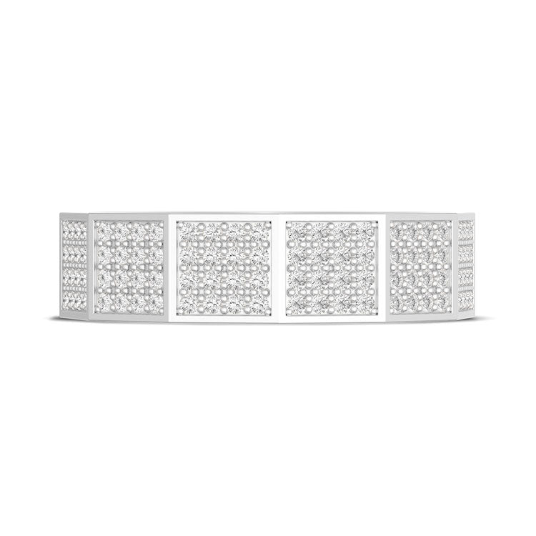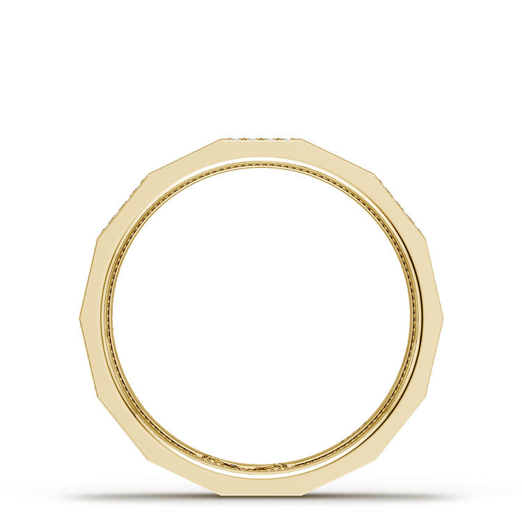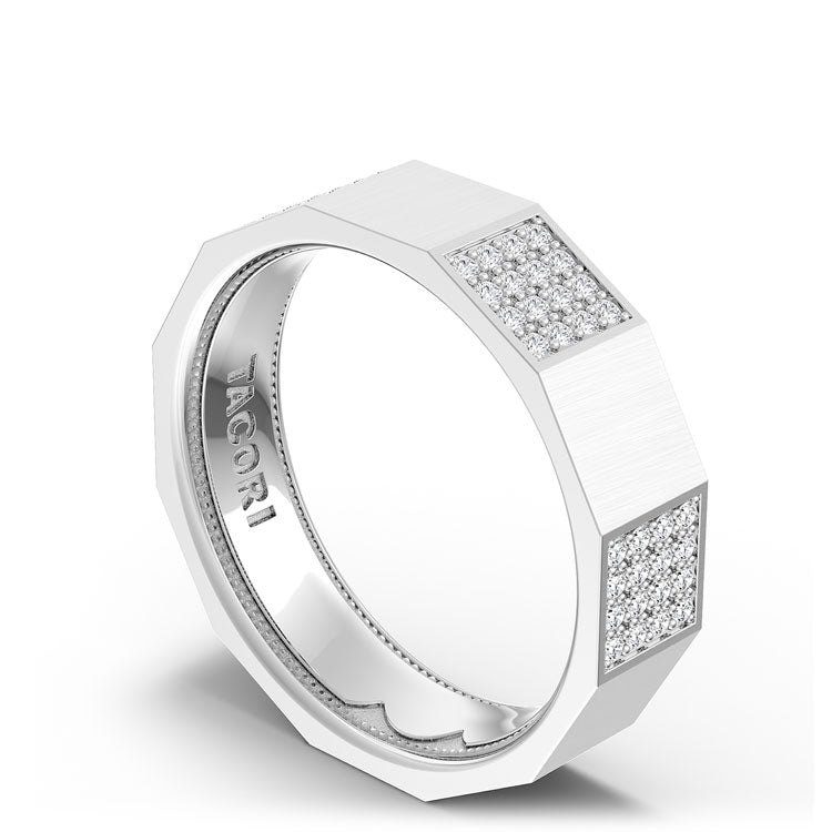 Every facet of this multifaceted wedding band is decorated with a grid of round brilliant pave-set diamonds. The inner face silhouette features a single TACORI Crescent and hand-hewn milgrain. Rings are available in sizes 4-12.