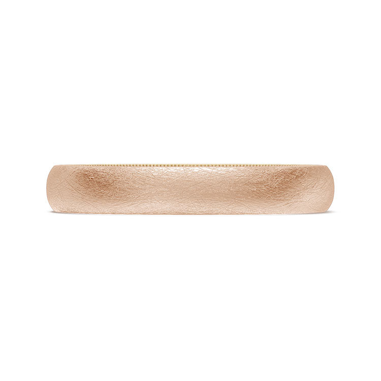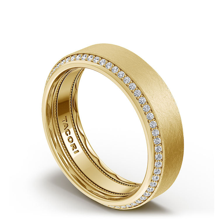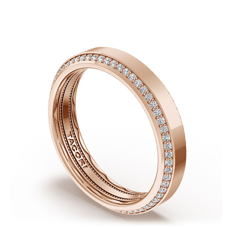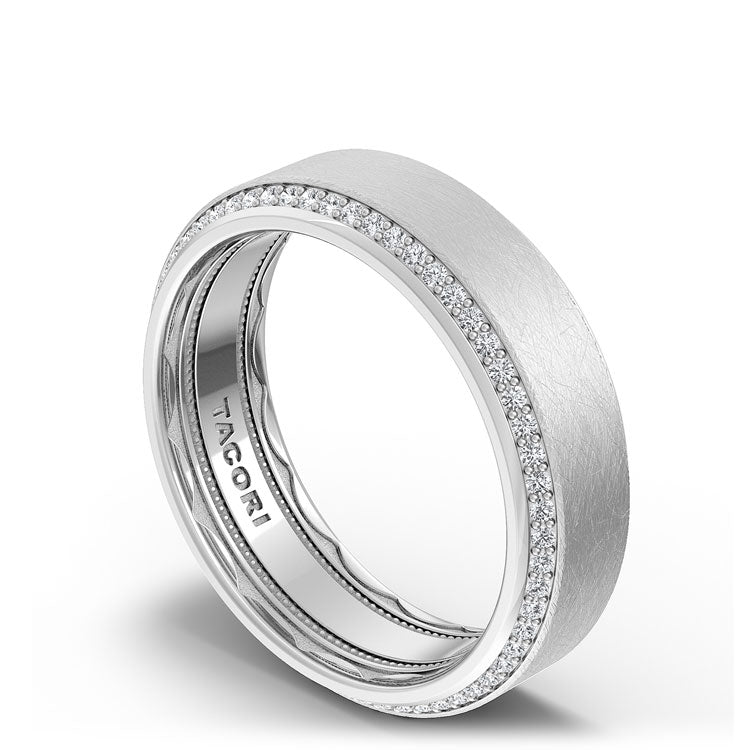 Two eternities of round-brilliant diamonds are hand set into beveled grooves that countour the wedding band's ceiling. TACORI Crescents and hand-hewn milgrain decorate the inner face. Rings are available in sizes 4-12.