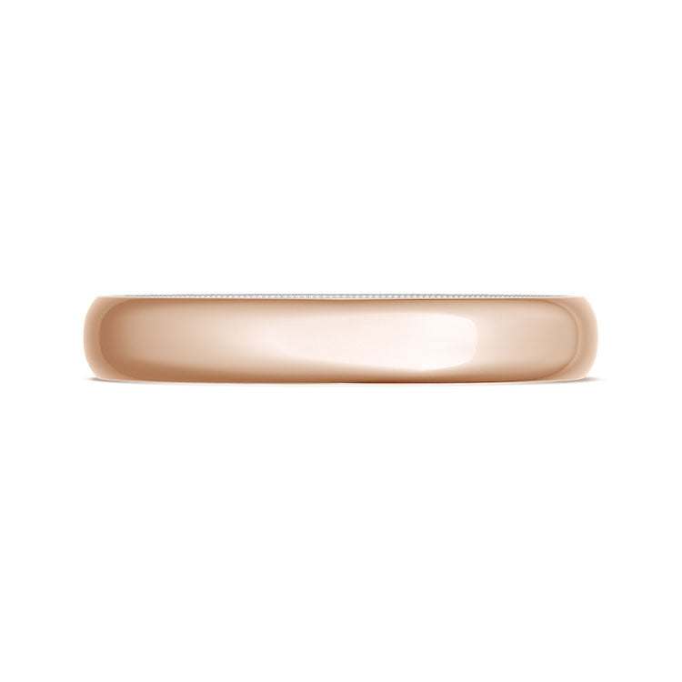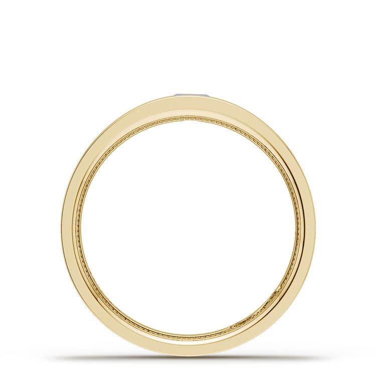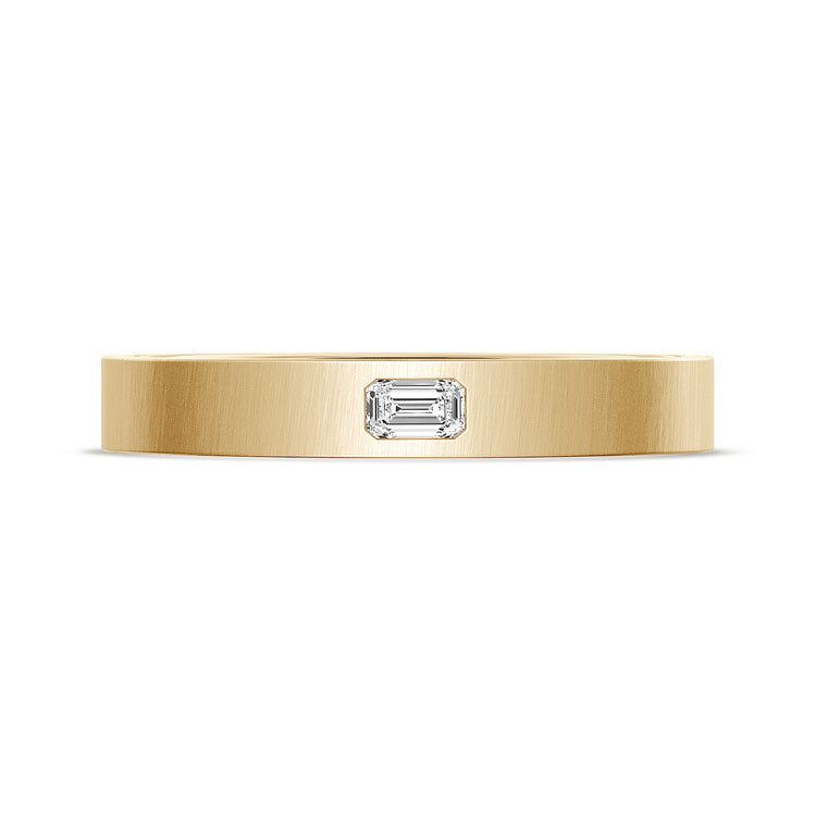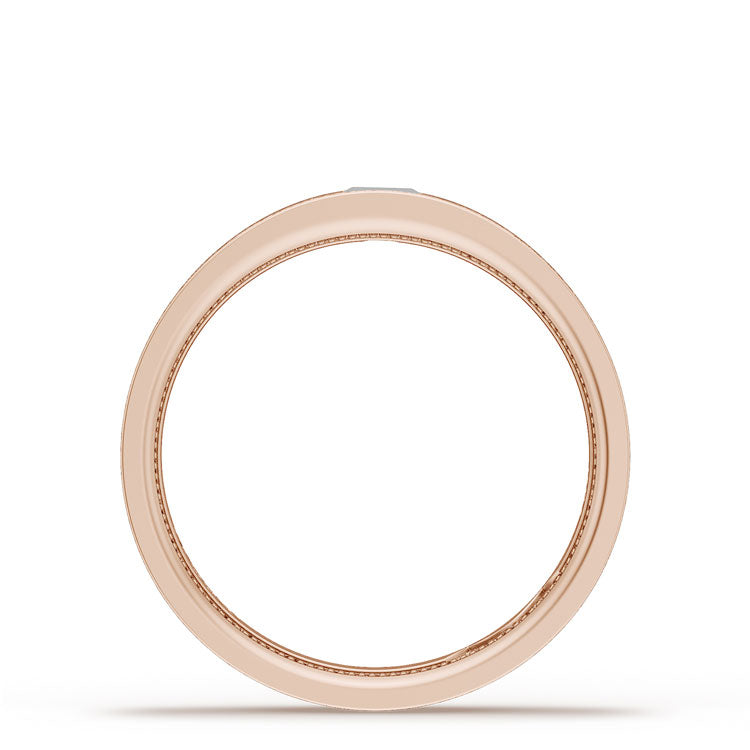 A single bezel set TACORI exclusive diamond is set into the ceiling of a delicate wedding band. The inner face silhouette features TACORI Crescent detailing and hand-hewn milgrain. Rings are available in sizes 4-12.