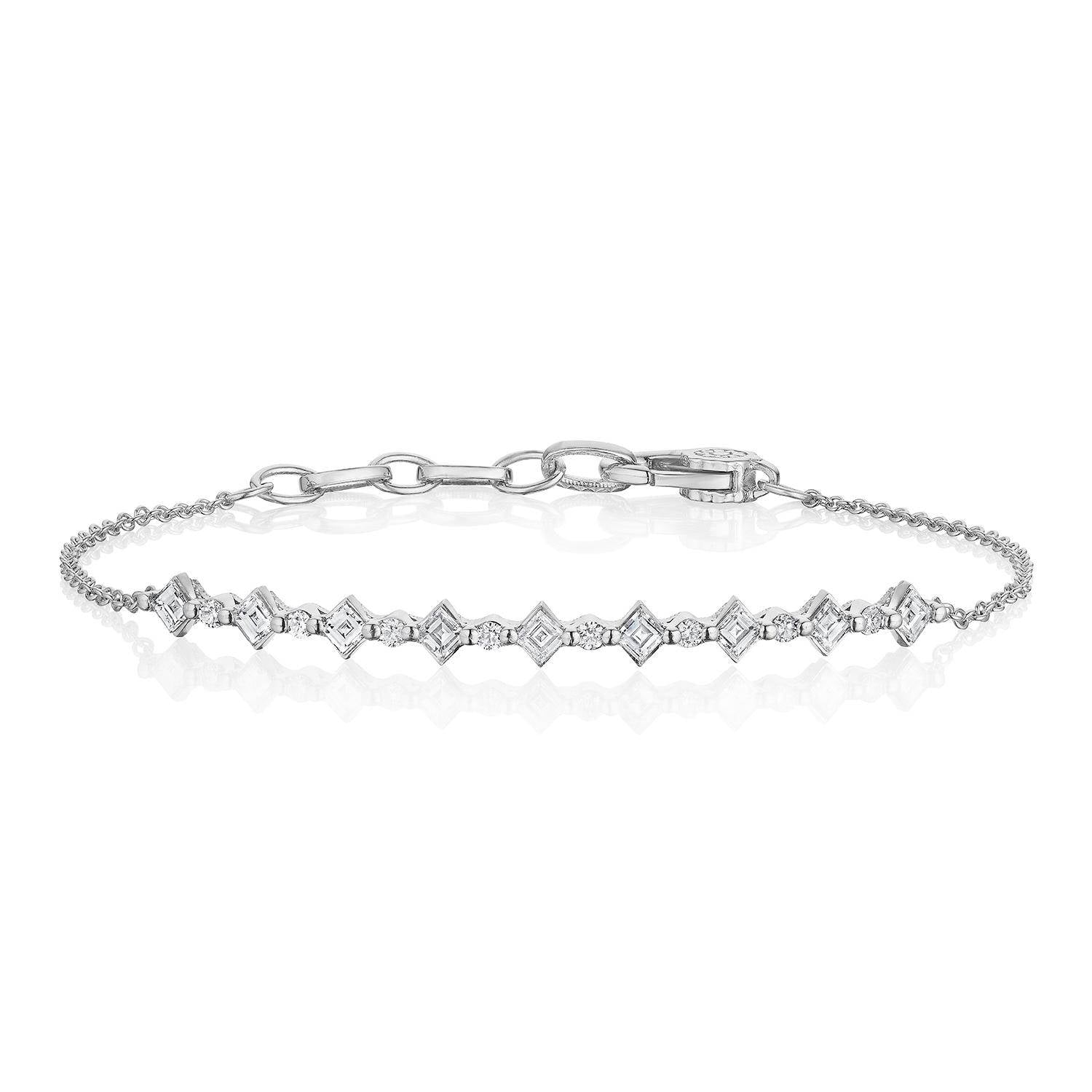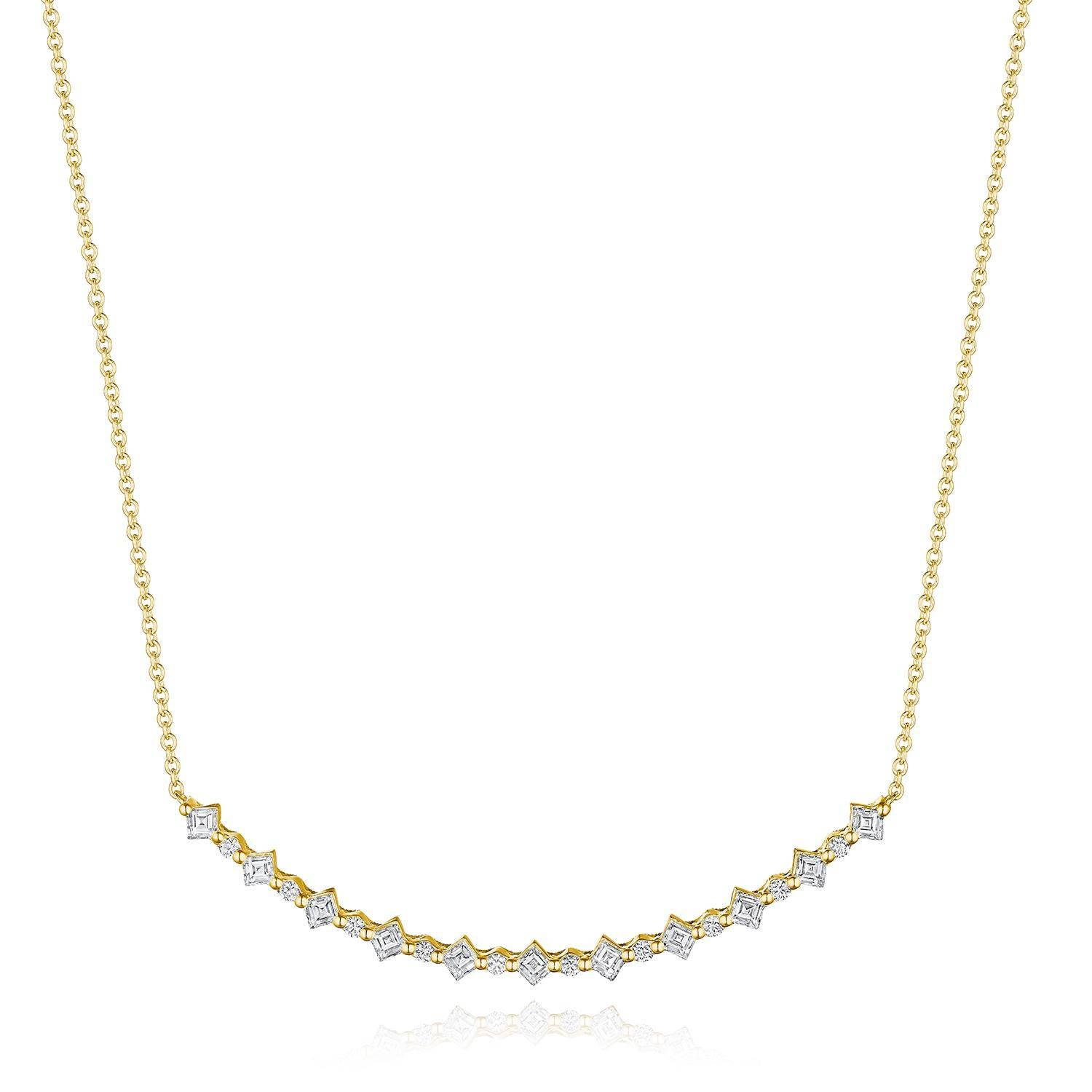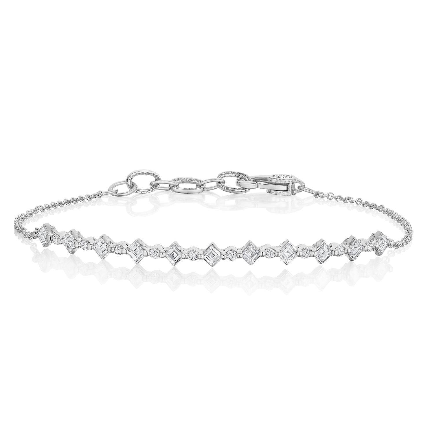 A delicate string of carré and round brilliant cut diamonds hangs from a chain of 18k White Gold. The silhouette of each stone is embellished with milgrain-accented TACORI Crescents.