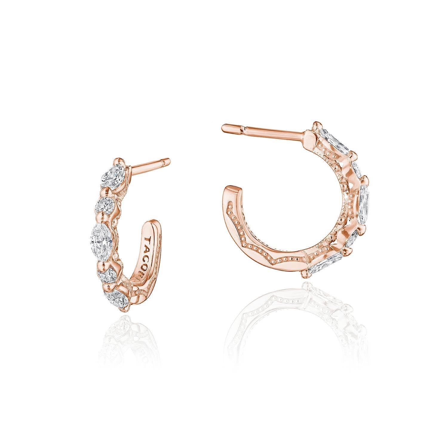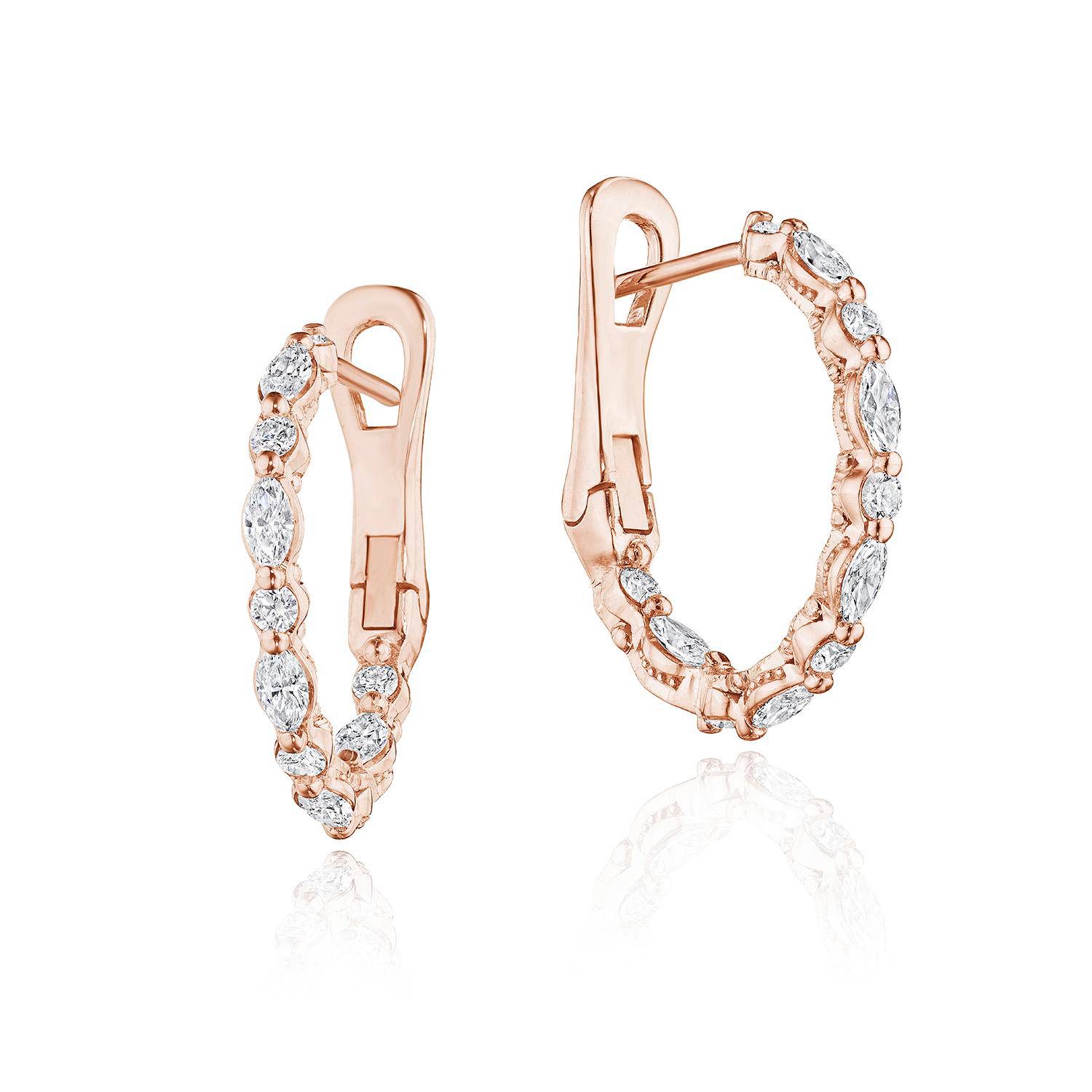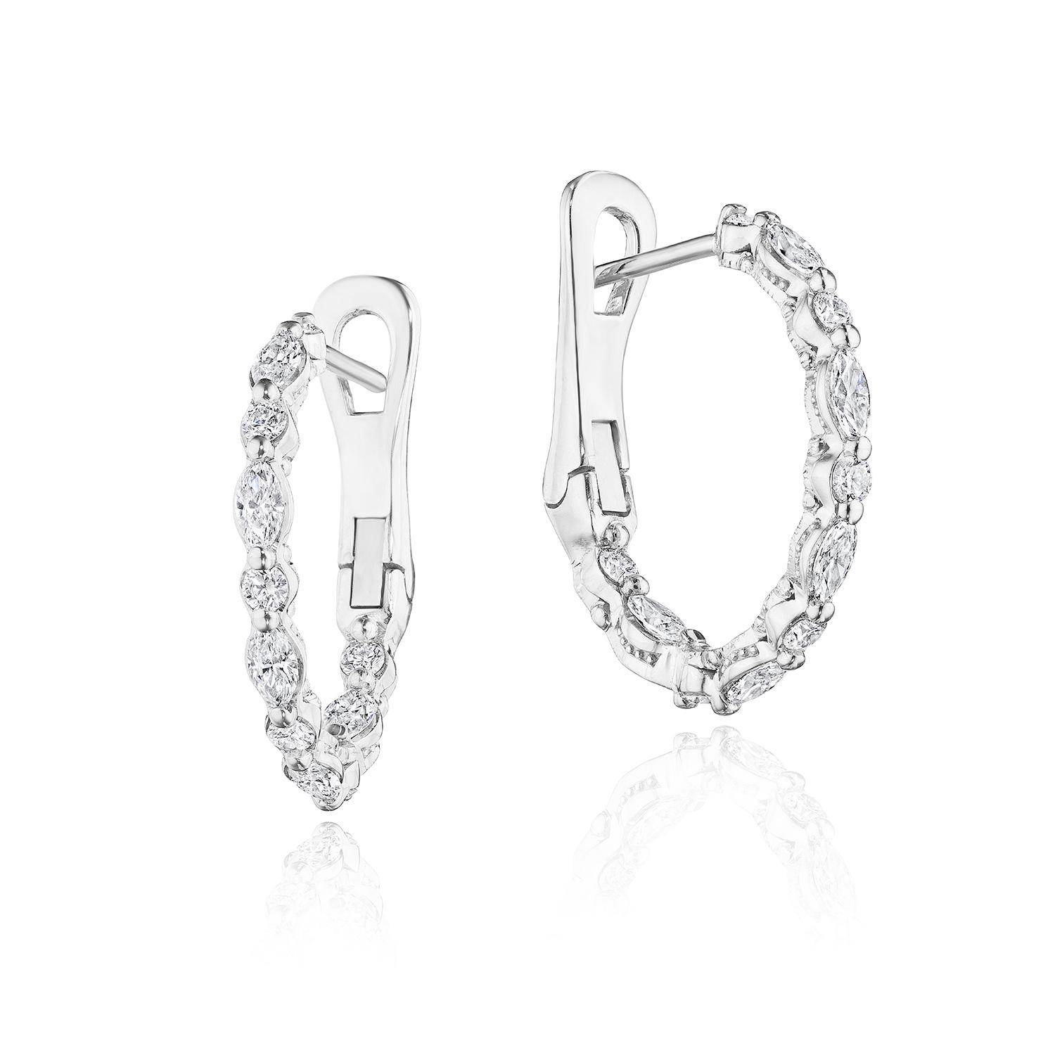 Delicate hoop earrings of 18k White Gold are meticulously hand-set with marquise and round brilliant cut diamonds. Milgrain-studded TACORI Crescent detailing decorates the silhouette.