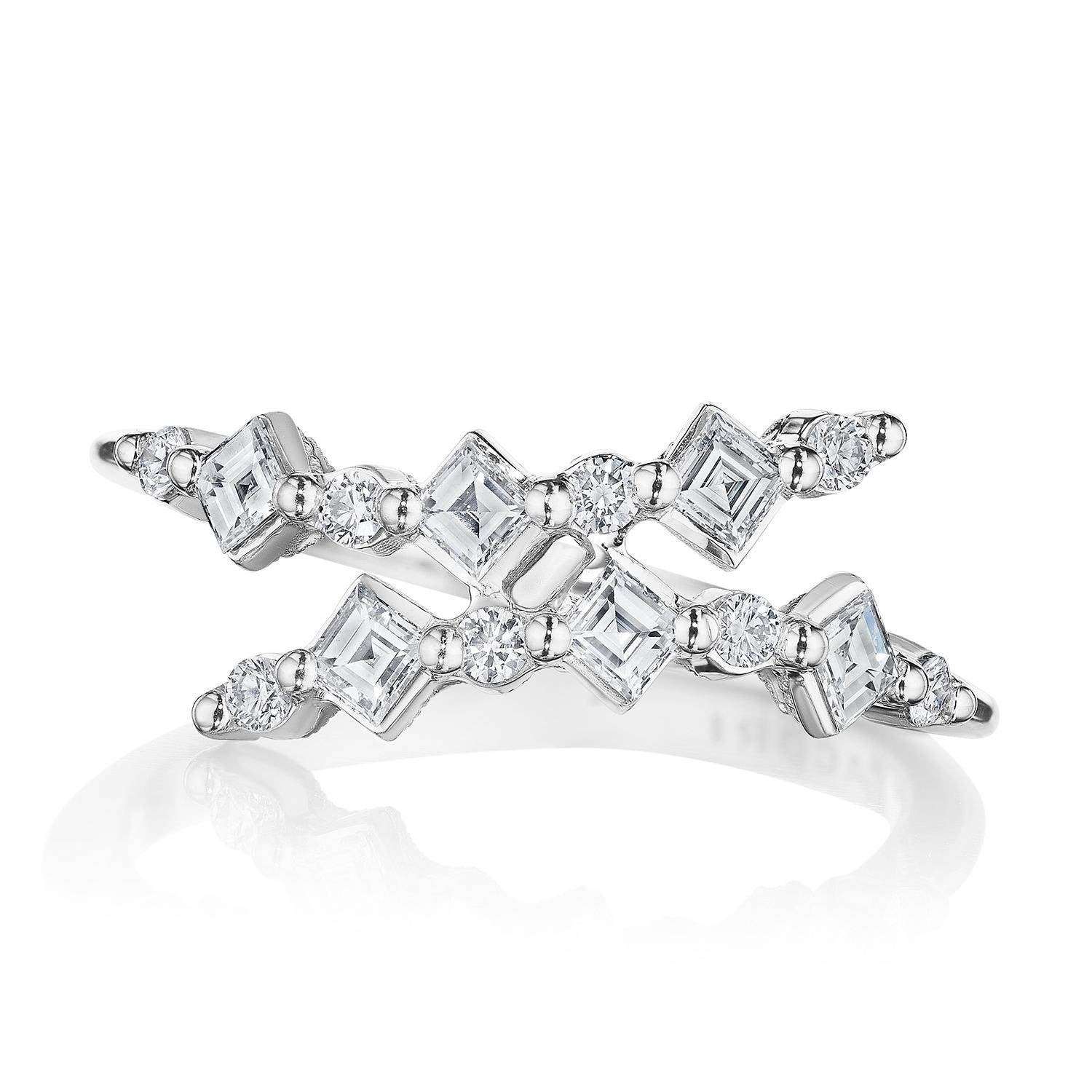 Passing strings of carré and round brilliant cut diamonds are set into a foundation of 18k White Gold. The silhouette of each stone is embellished with milgrain-accented TACORI Crescents.