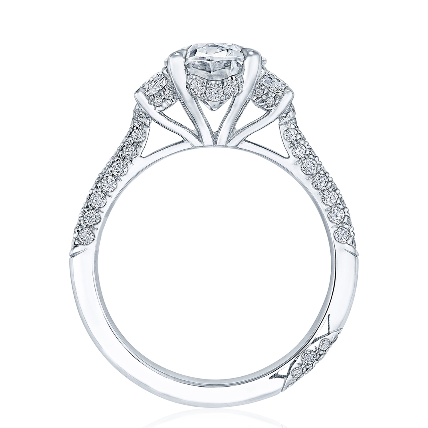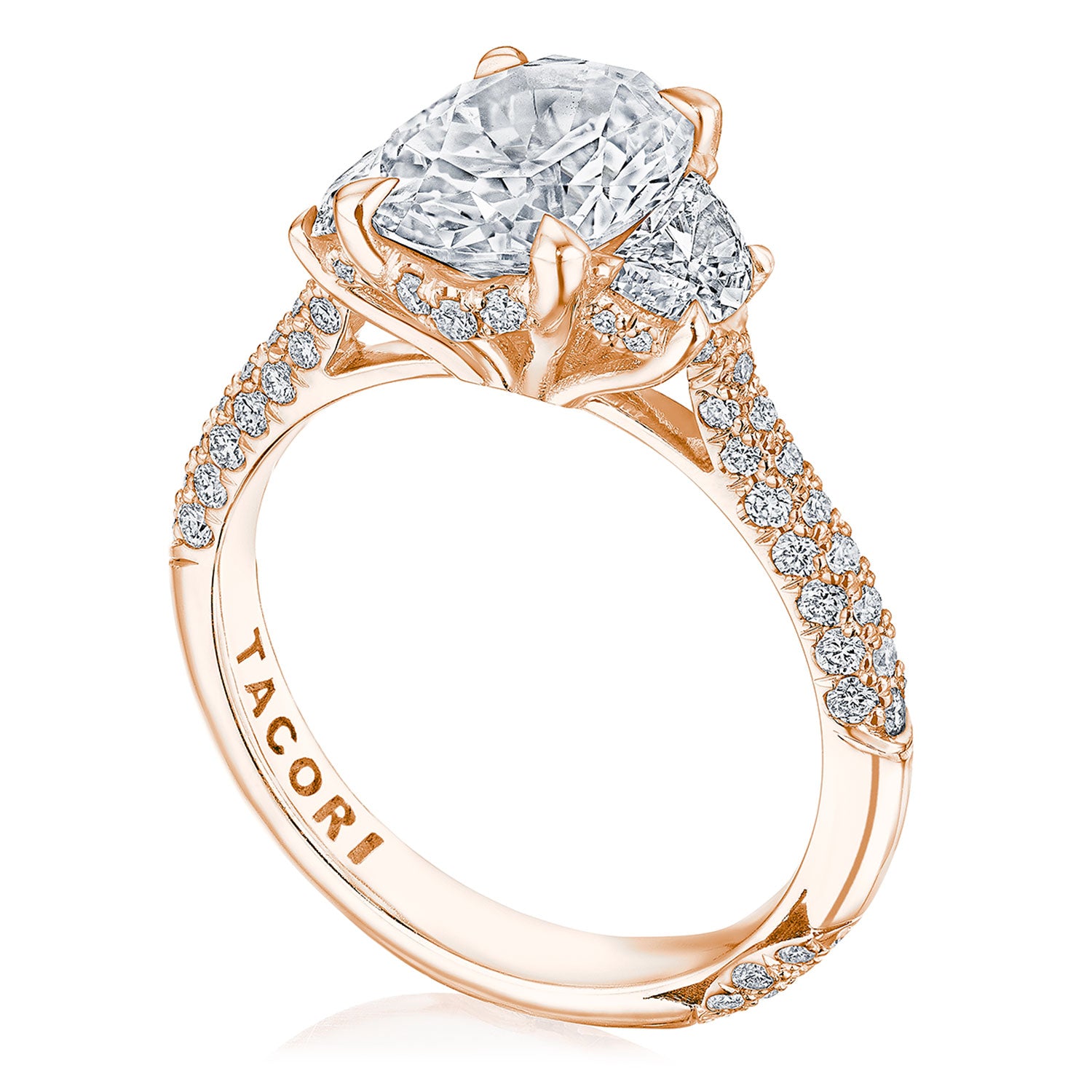 Pear side stones set in an East-West orentation highlight the center stone, which floats on a Classic 360 foundation above a hidden bloom. Sculpted Crescent fabric decorates the innerface, and a Signature Crescent marks the resting point.