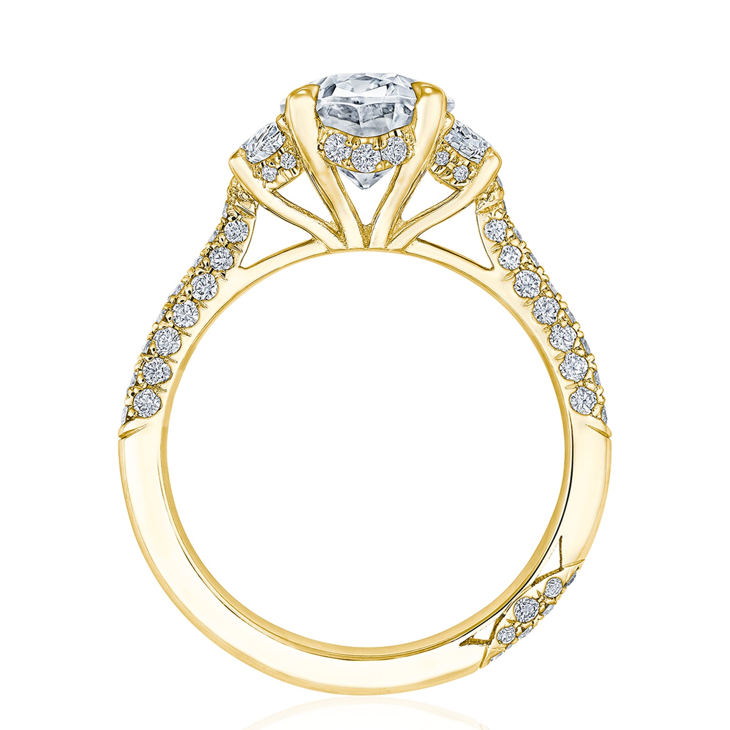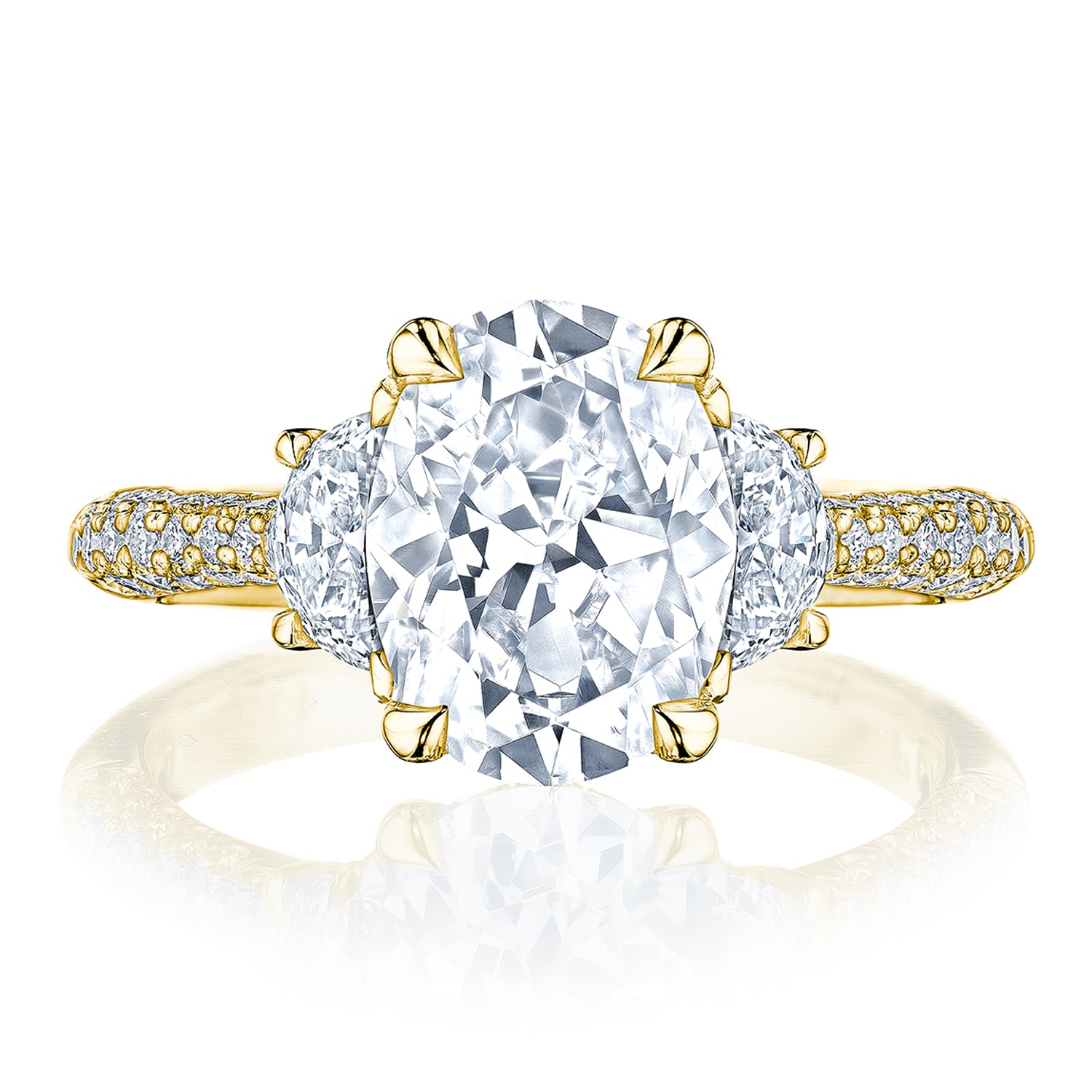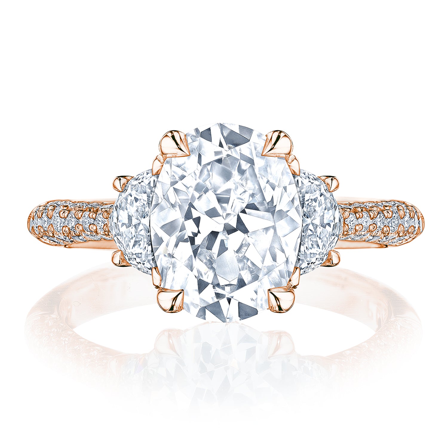 Two half-moon diamonds embrace the center stone, which sits on a Cathedral foundation with a hidden bloom for all-angle sparkle. Triple rows of pavé on the ceiling add more brilliance, and a Founder's Crescent marks the resting point.