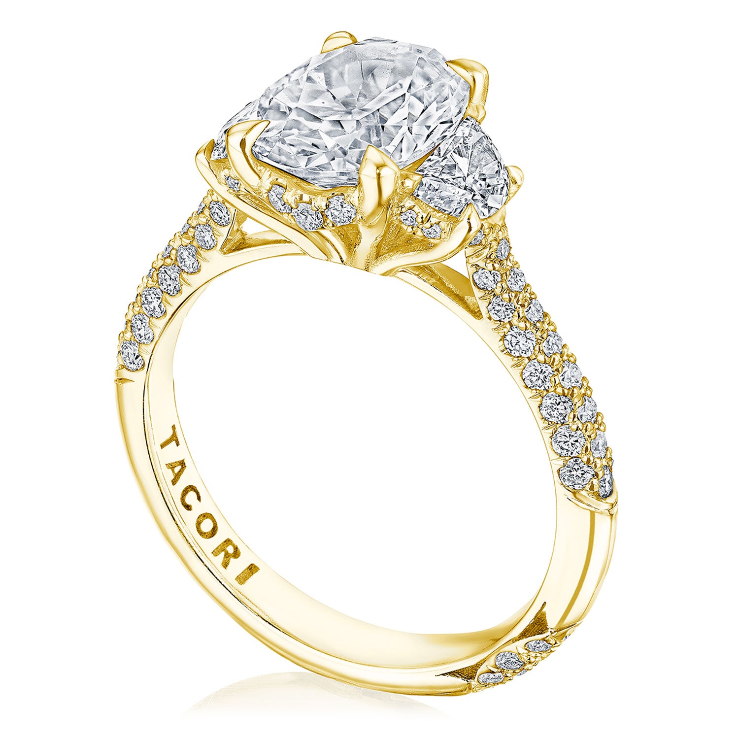 Contemporary and diamond-intense, with Simply TACORI Crescent Fabric and pavé-set diamonds adorning the ceiling. A stunning bloom around the fancy-cut pear solitare delivers brilliant detail. A signature Crescent marks the ring as Truly TACORI.