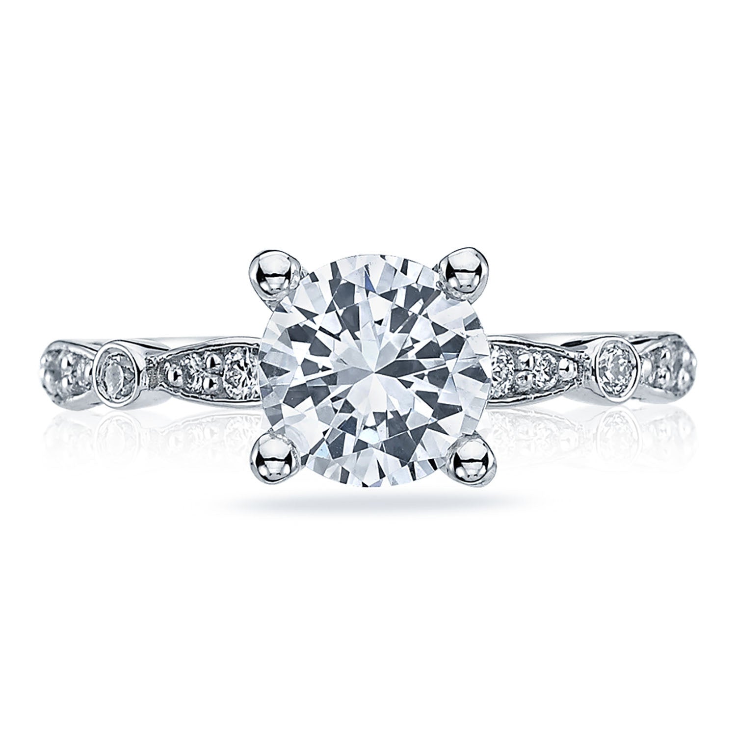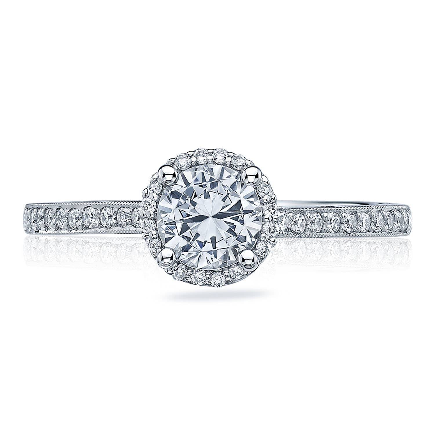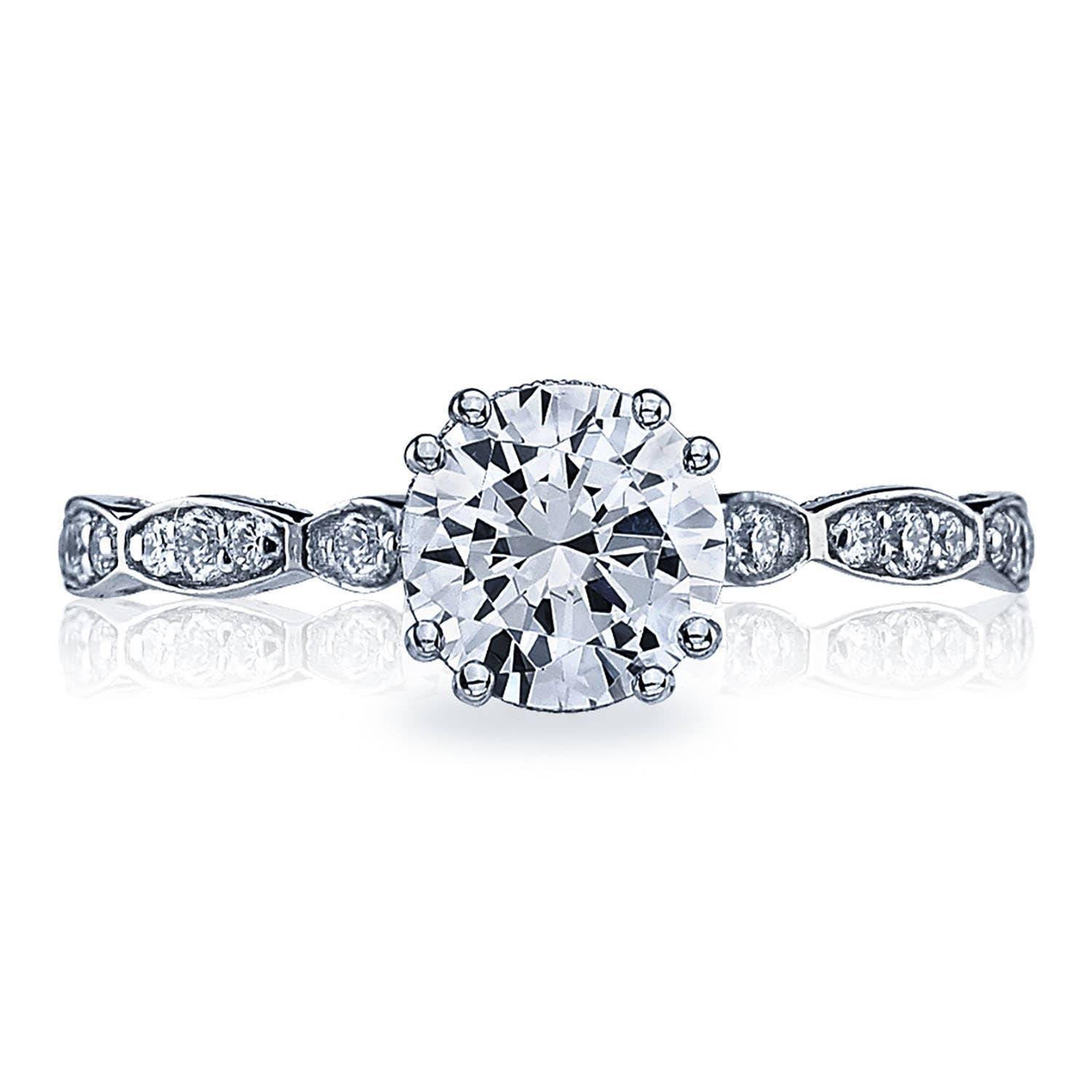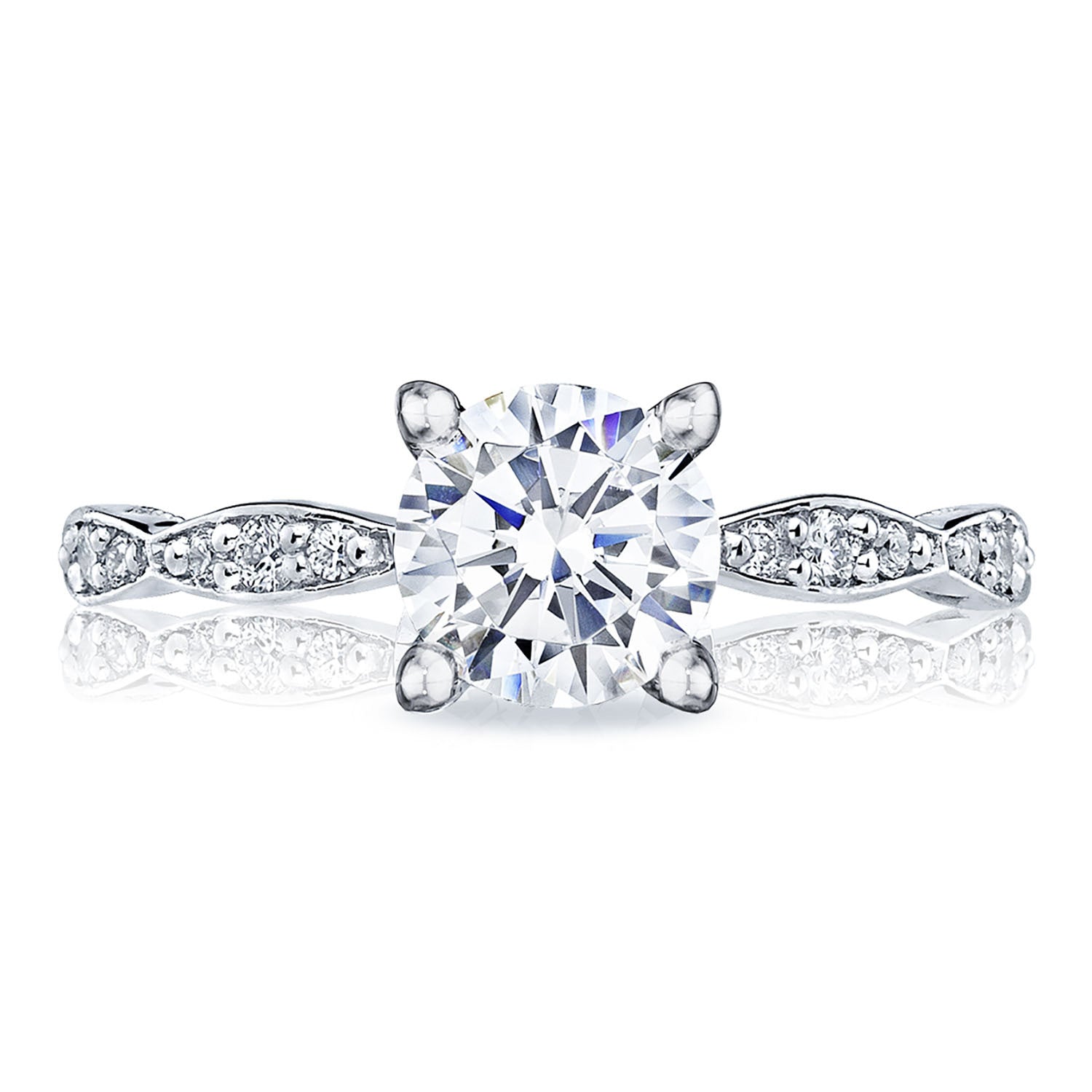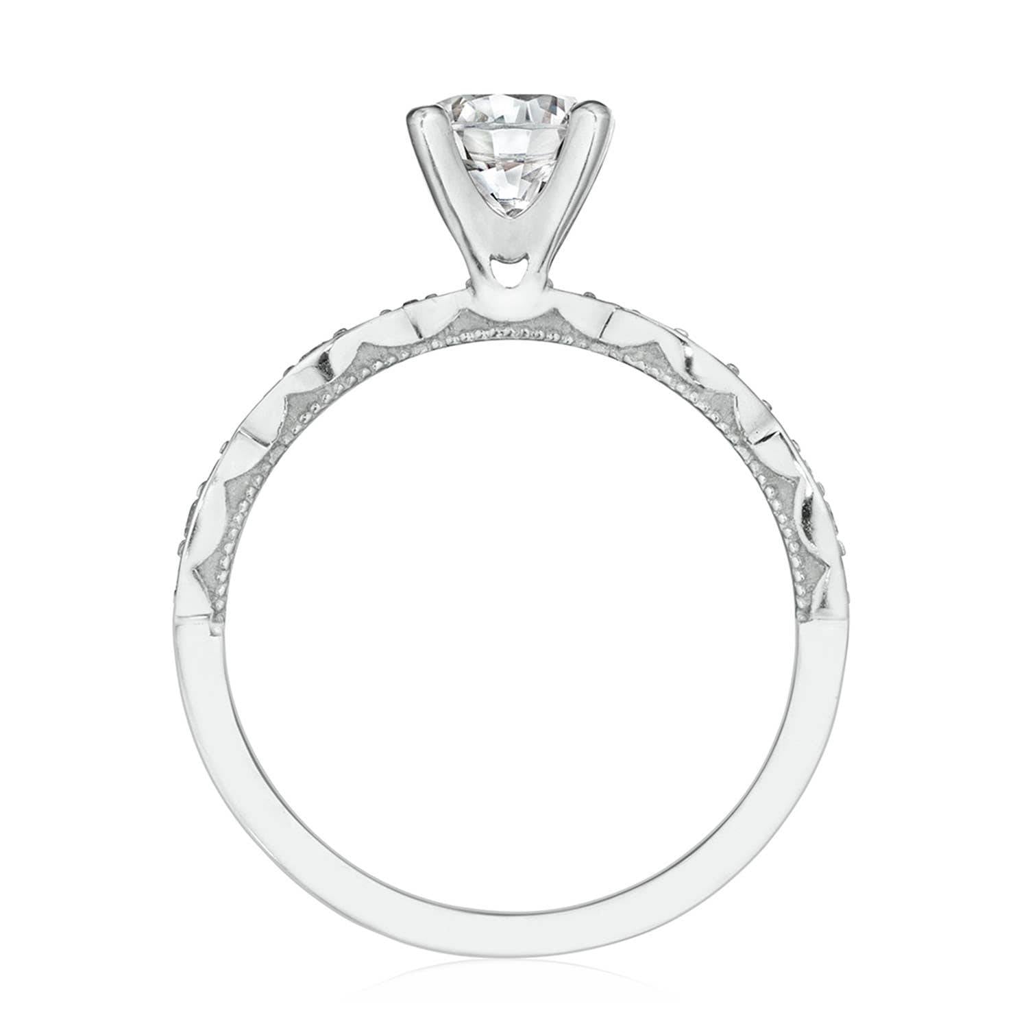 A round-brilliant solitaire is enhanced by lace-like milgrain detailing on the Cathedral foundation. Pave of round-brilliant diamonds on the ceiling lead towards the center stone, while a signature crescent marks the resting point of the band.