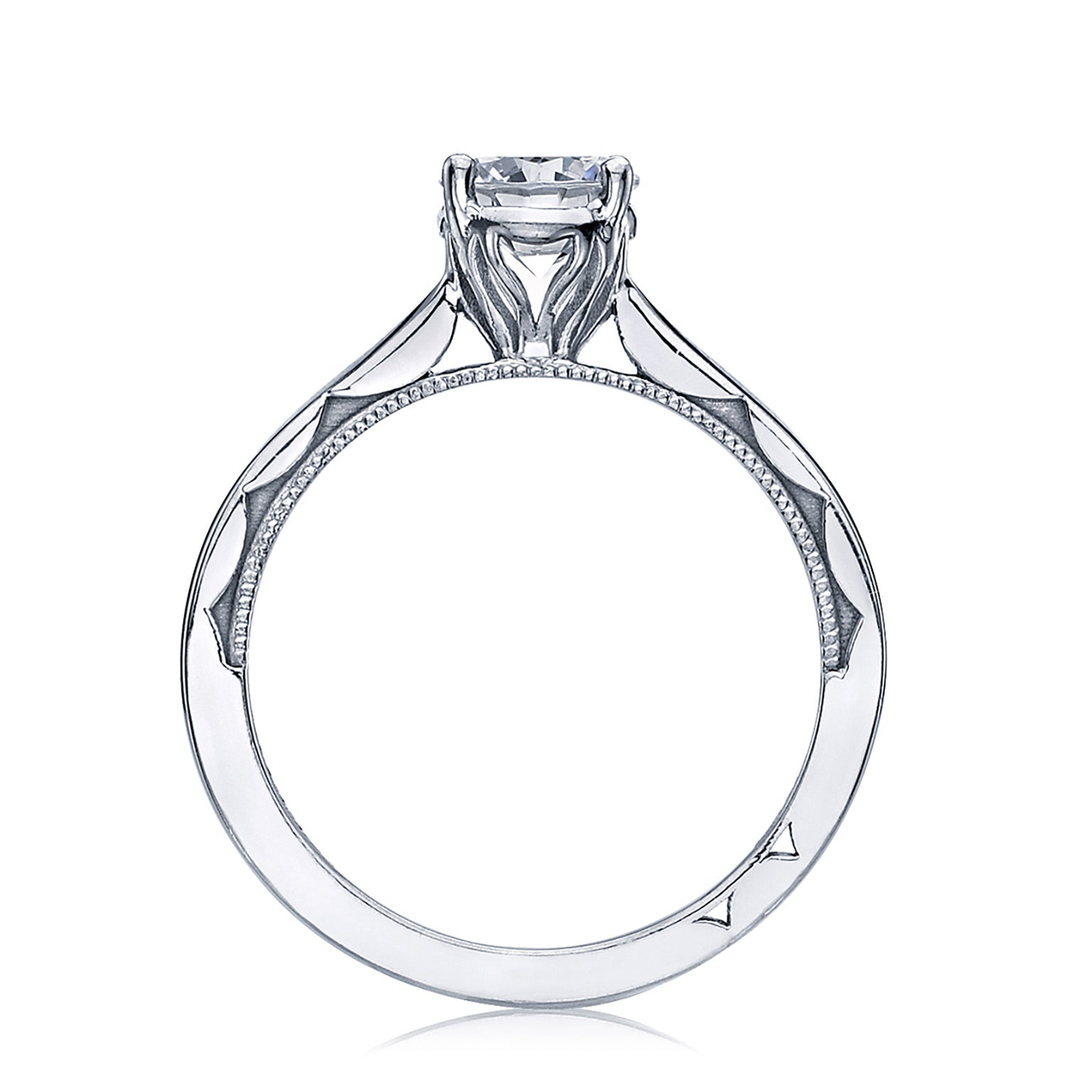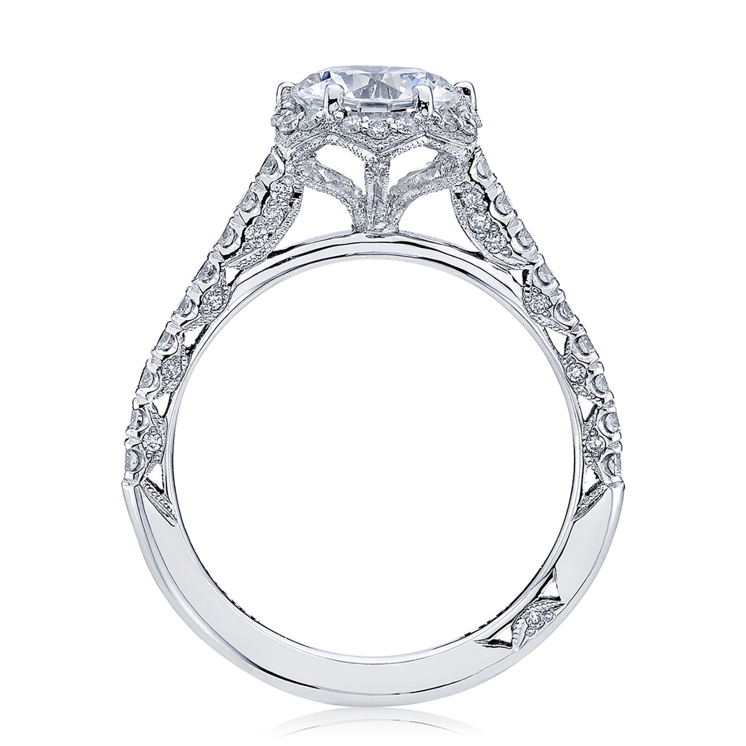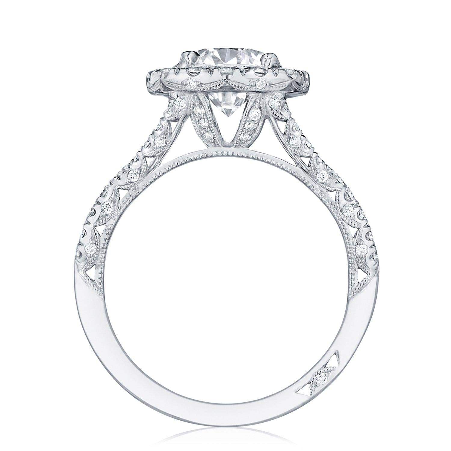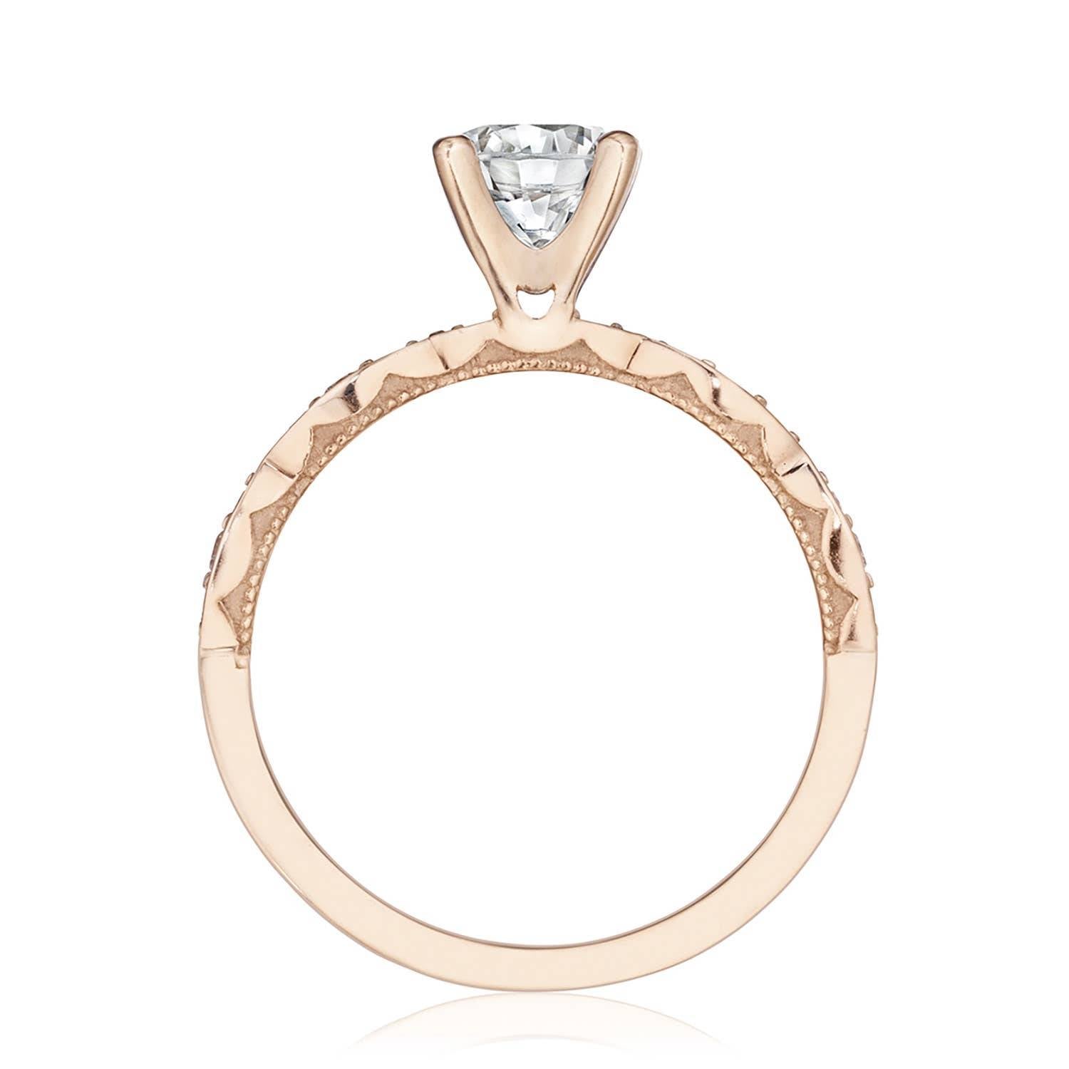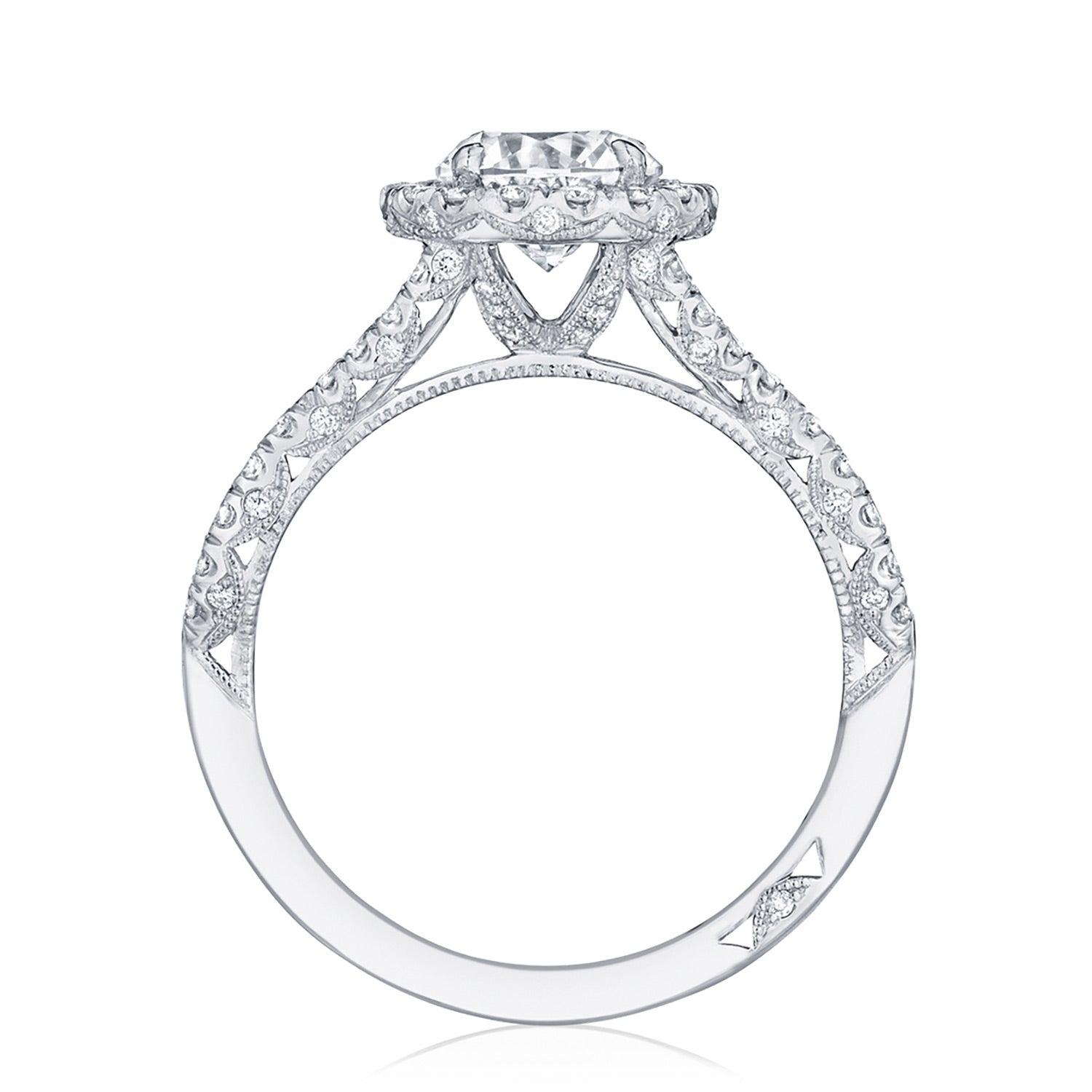 A bloom enhances the center stone, which sits on a Classic 360 foundation with an open gallery. Hand carved Sculpted Crescent fabric with careful milgrain decorates the innerface of the ring.