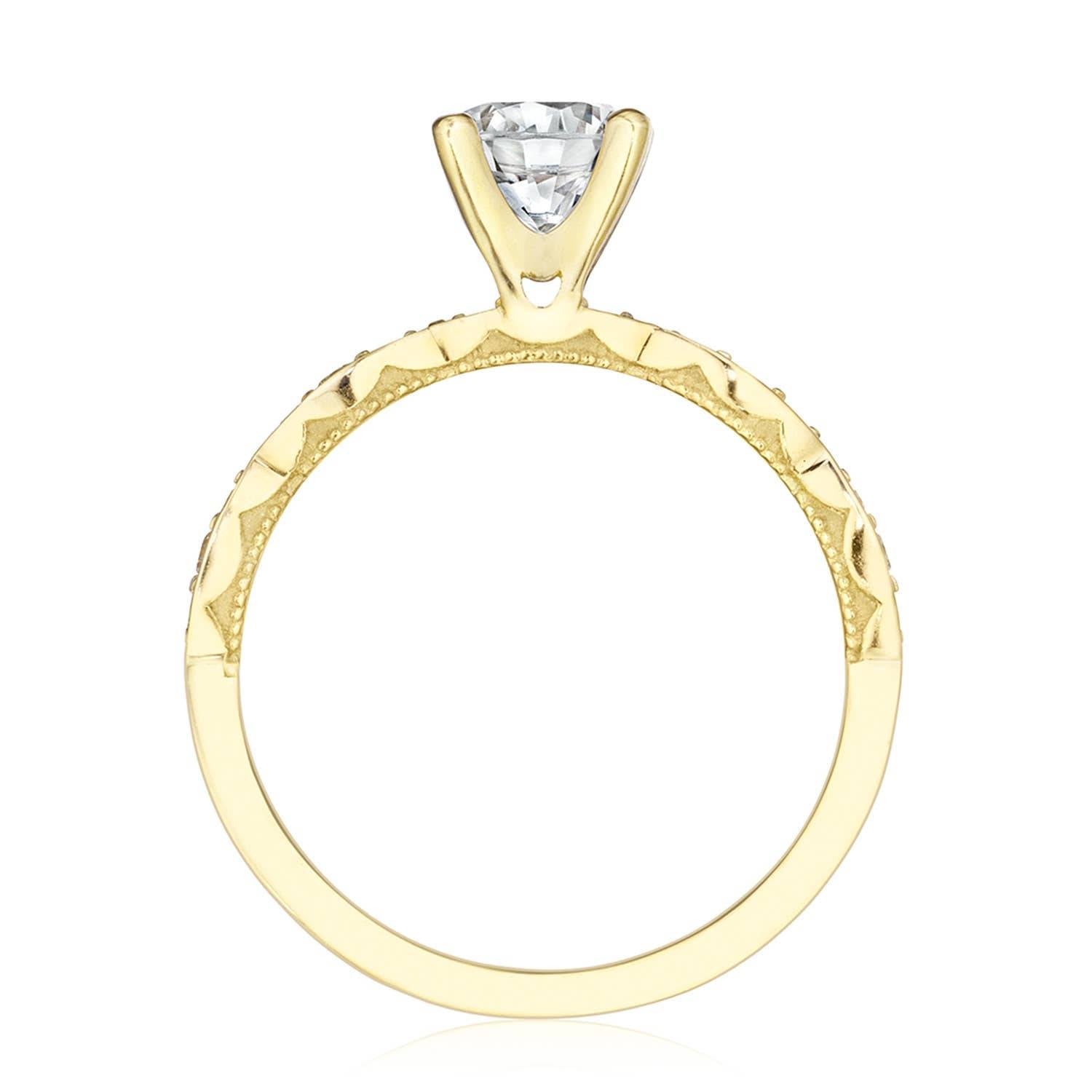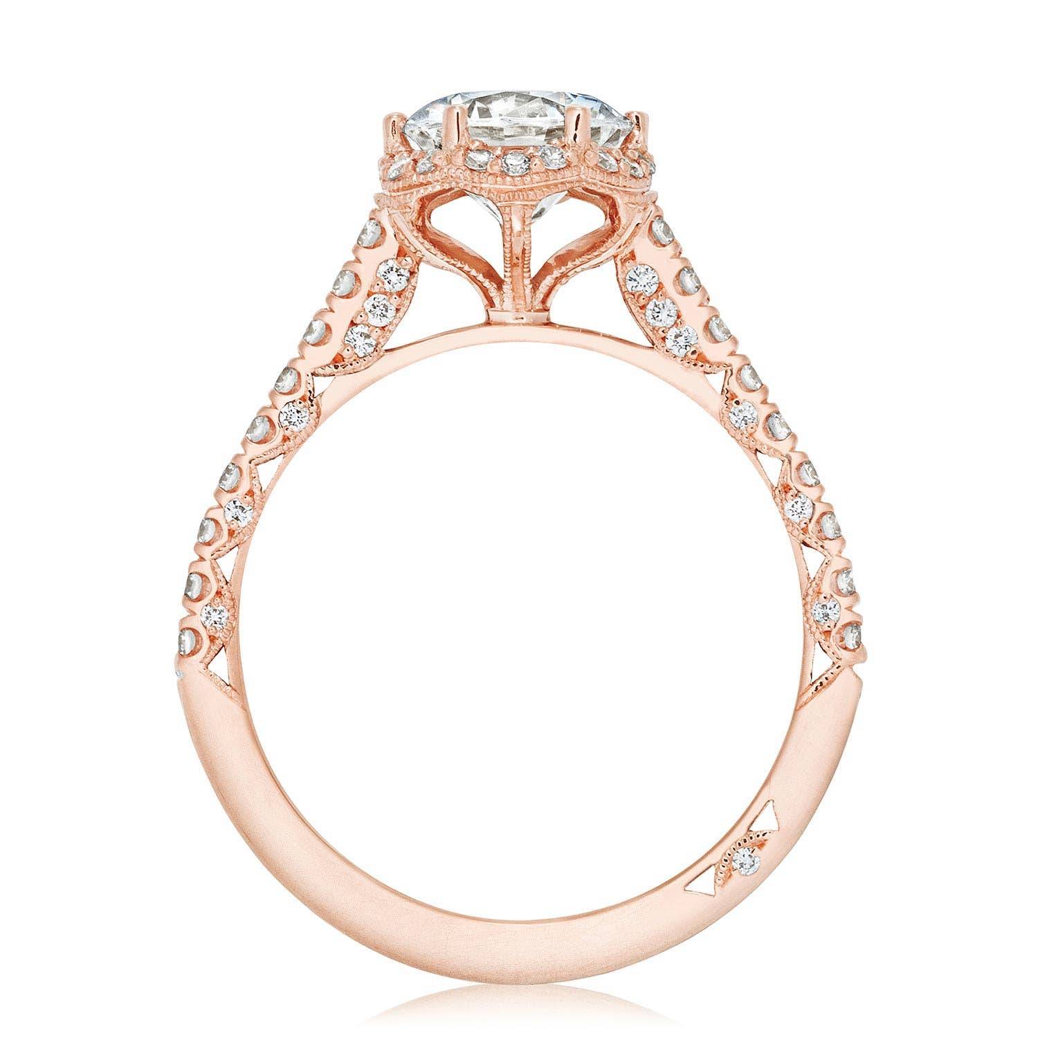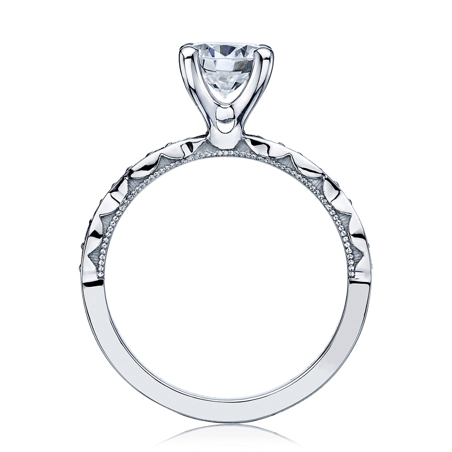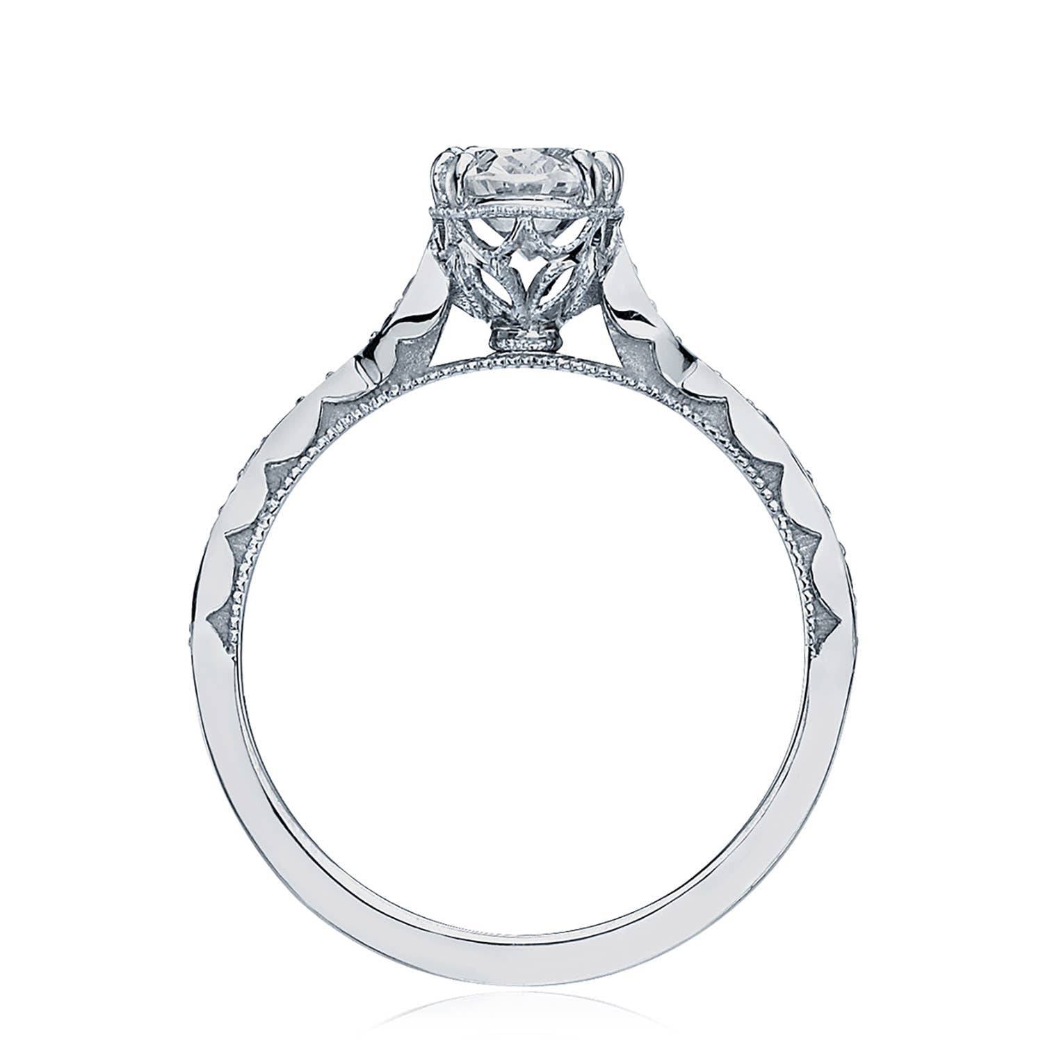 A bloom enhances the center stone, which sits on a Classic 360 foundation with an open gallery. Hand carved Sculpted Crescent fabric with careful milgrain decorates the innerface of the ring.