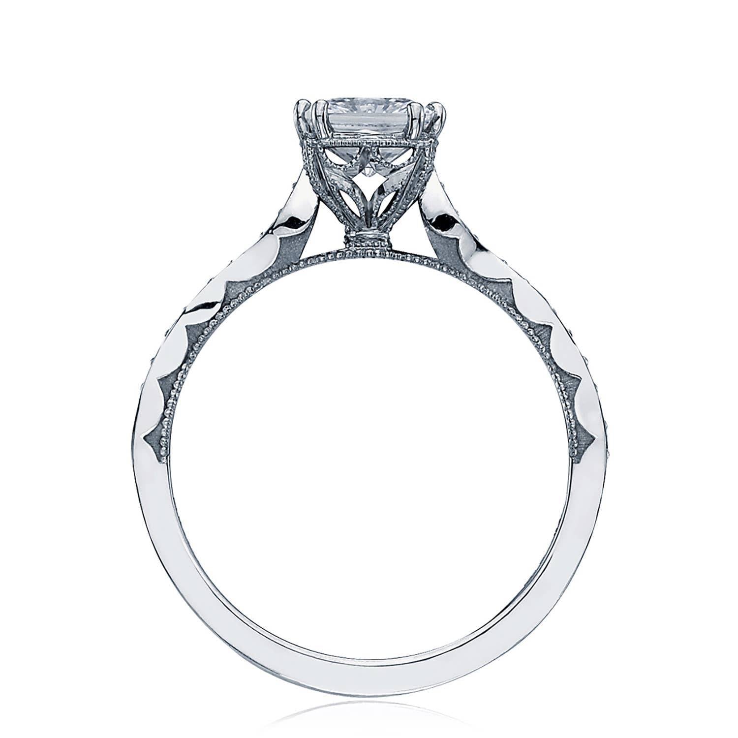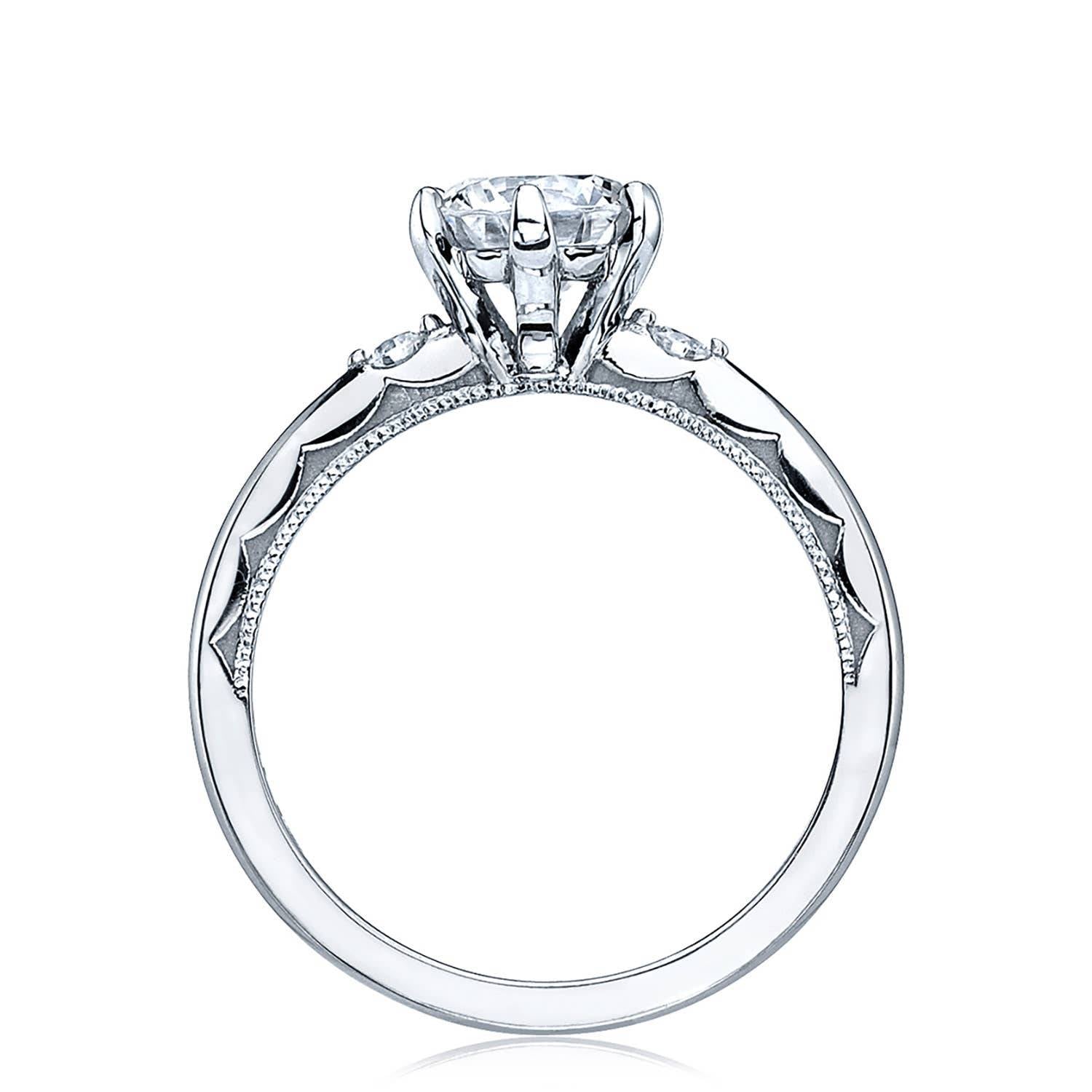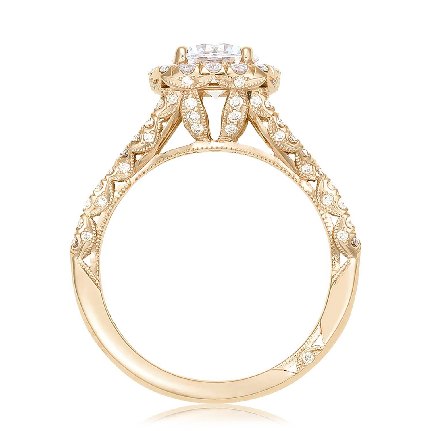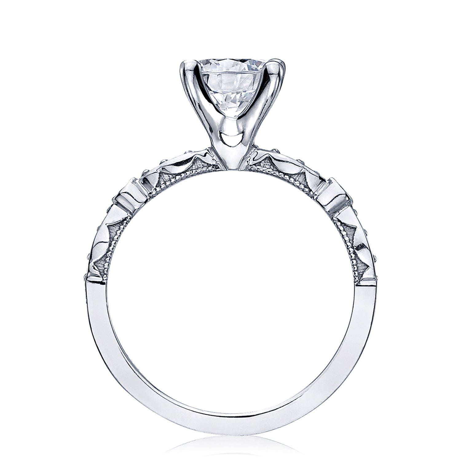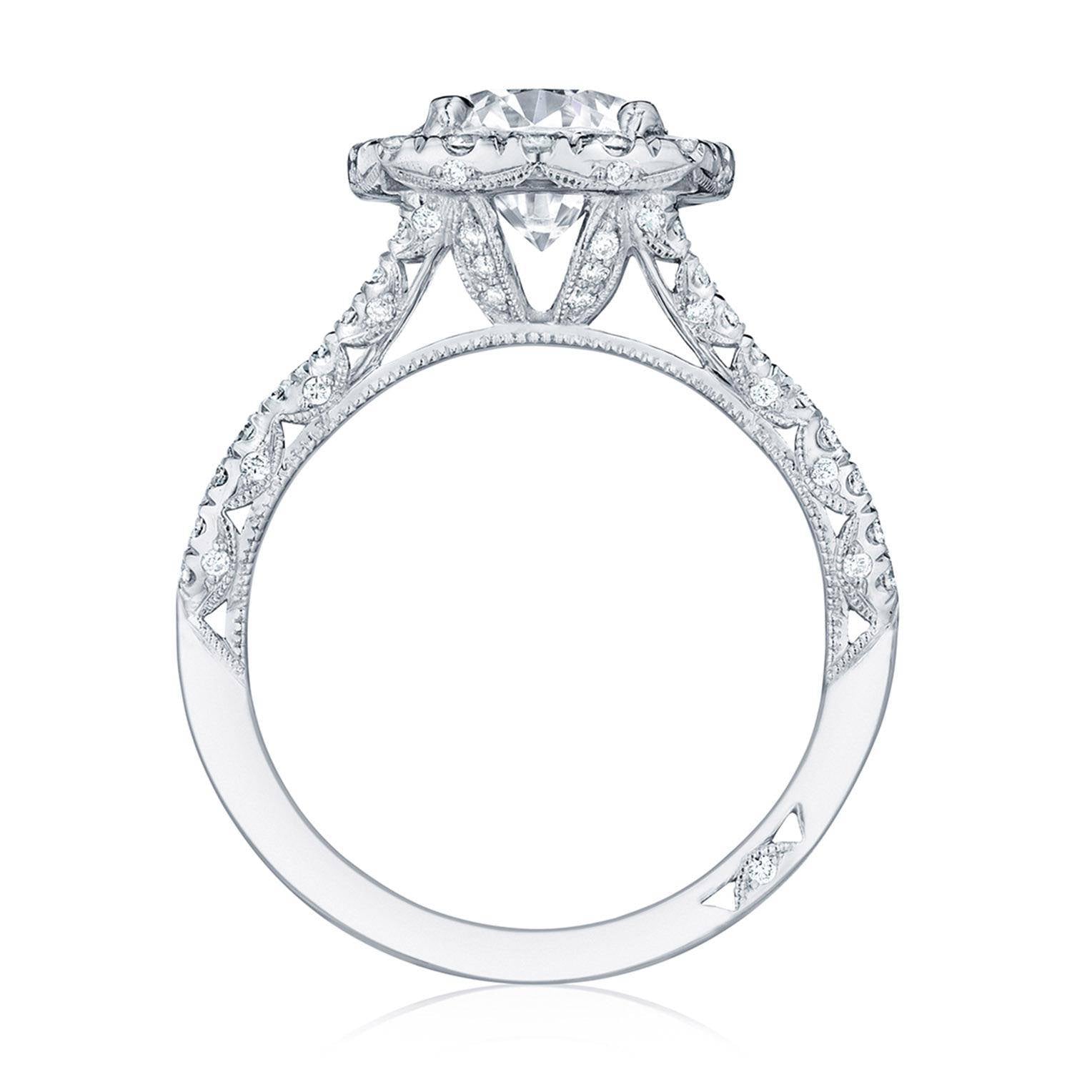 A bloom enhances the center stone, which sits on a Classic 360 foundation with an open gallery. Hand carved Sculpted Crescent fabric with careful milgrain decorates the innerface of the ring.