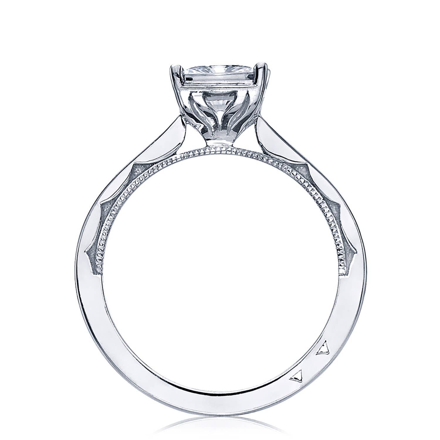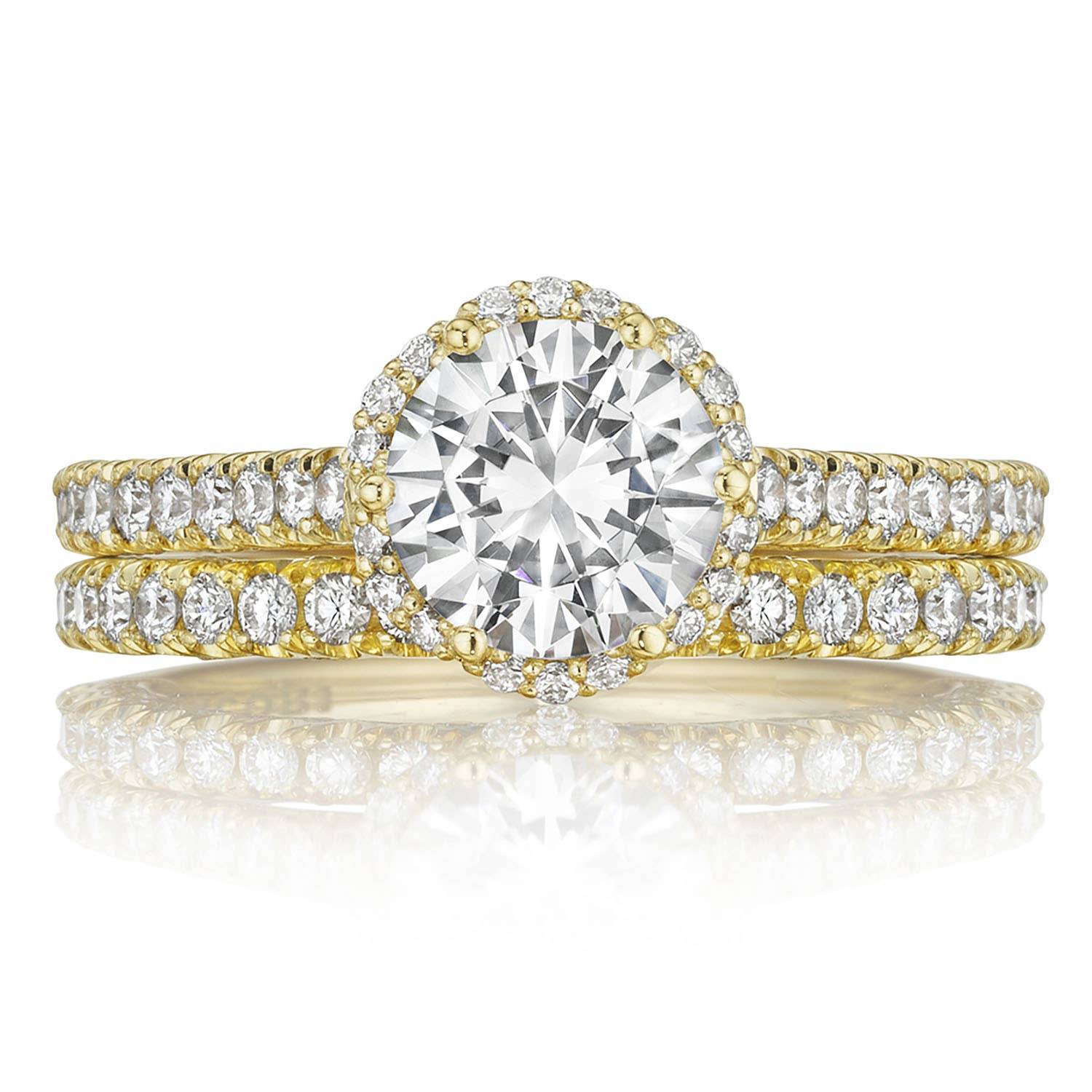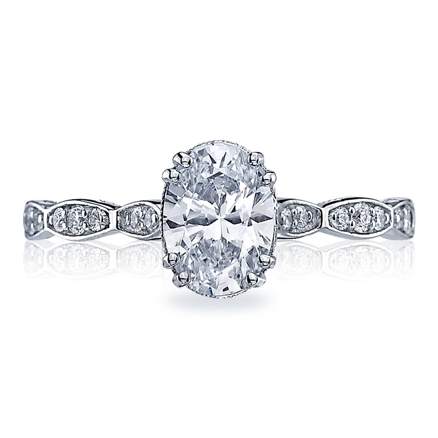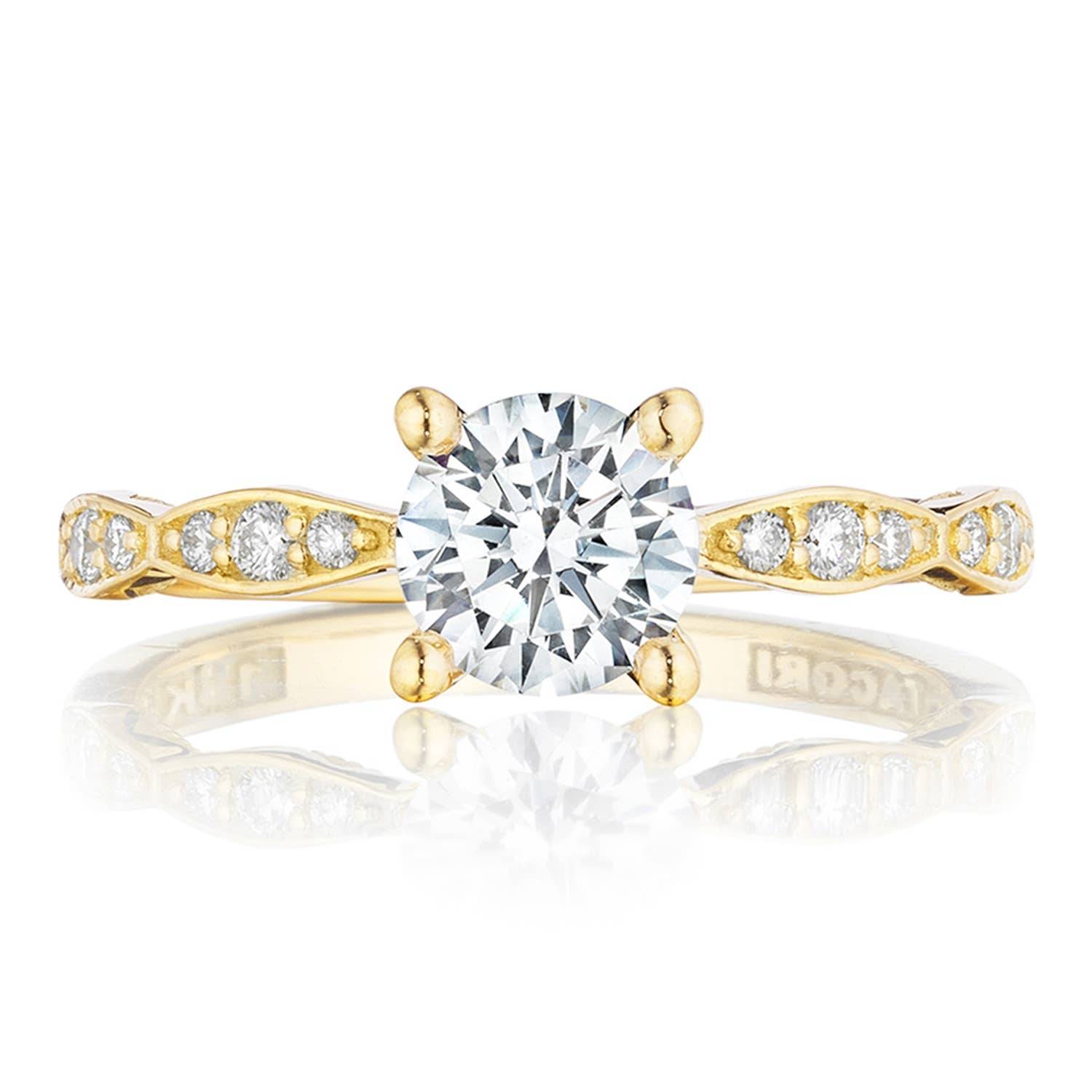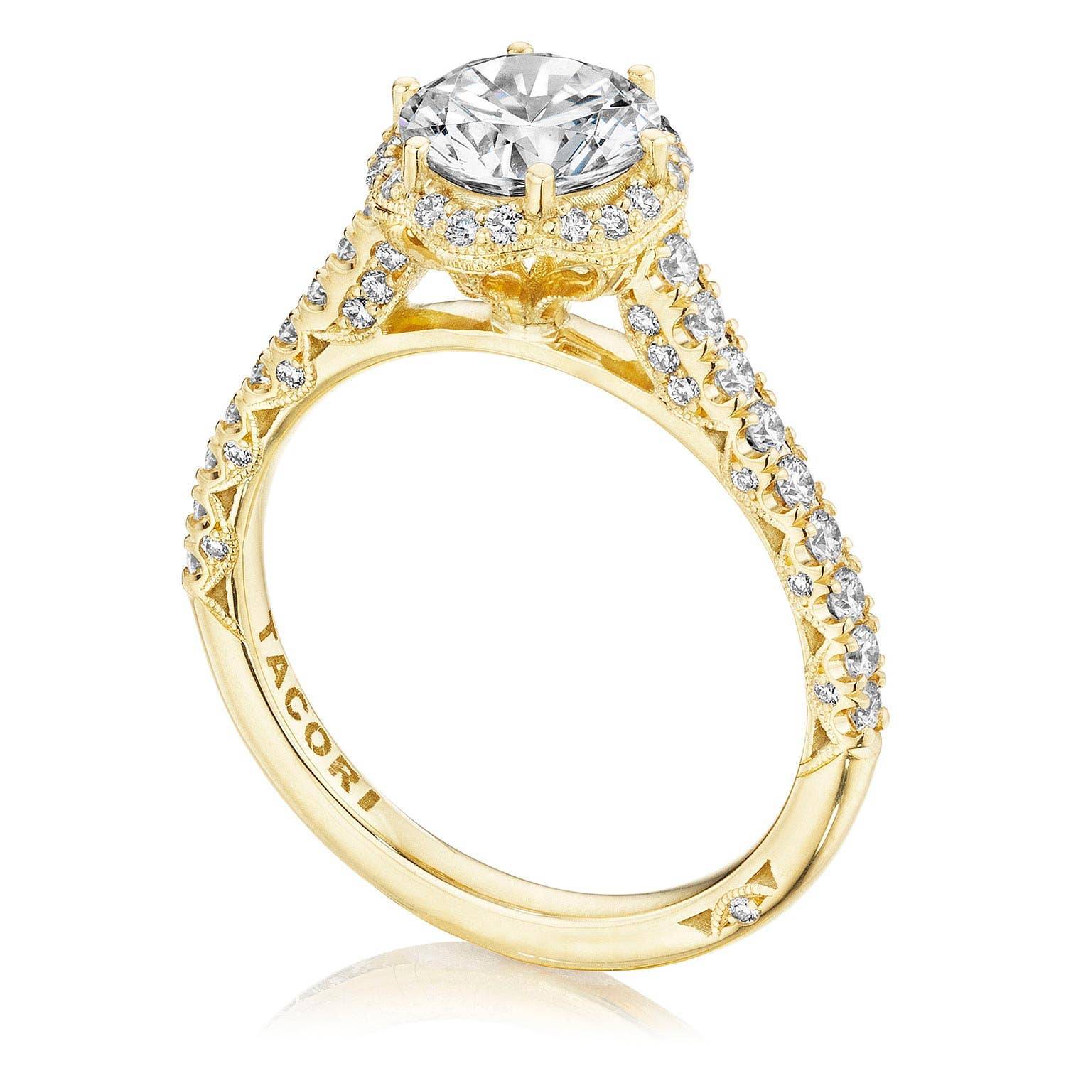 A bloom enhances the center stone, which sits on a Classic 360 foundation with an open gallery. Hand carved Sculpted Crescent fabric with careful milgrain decorates the innerface of the ring.