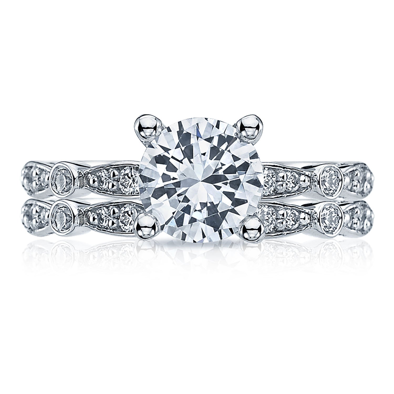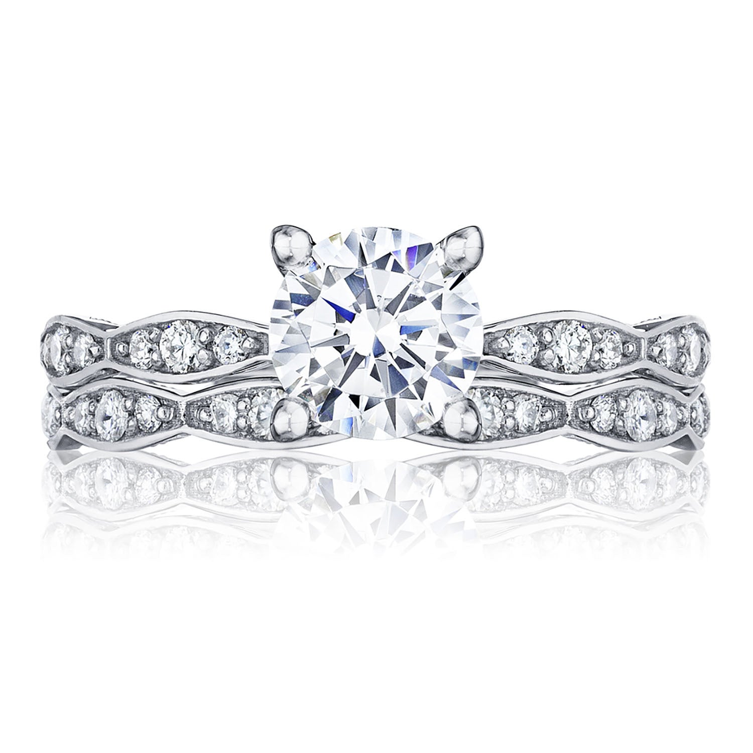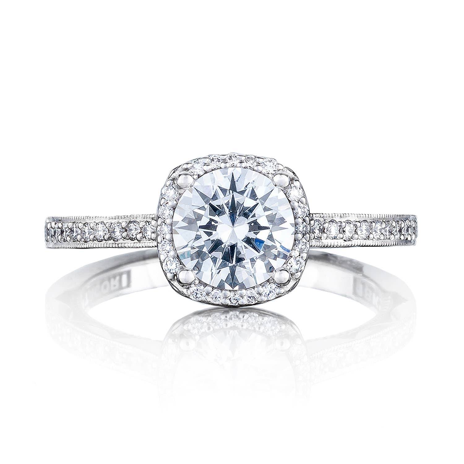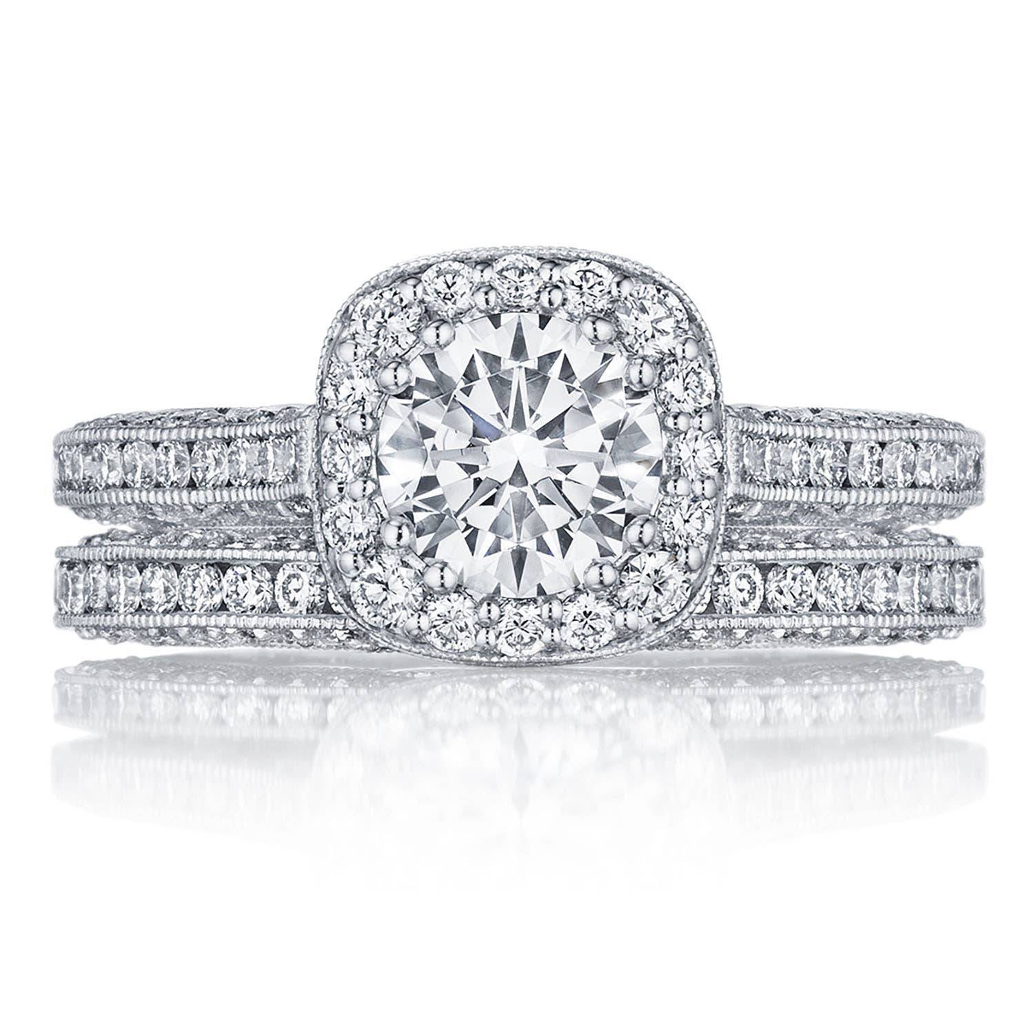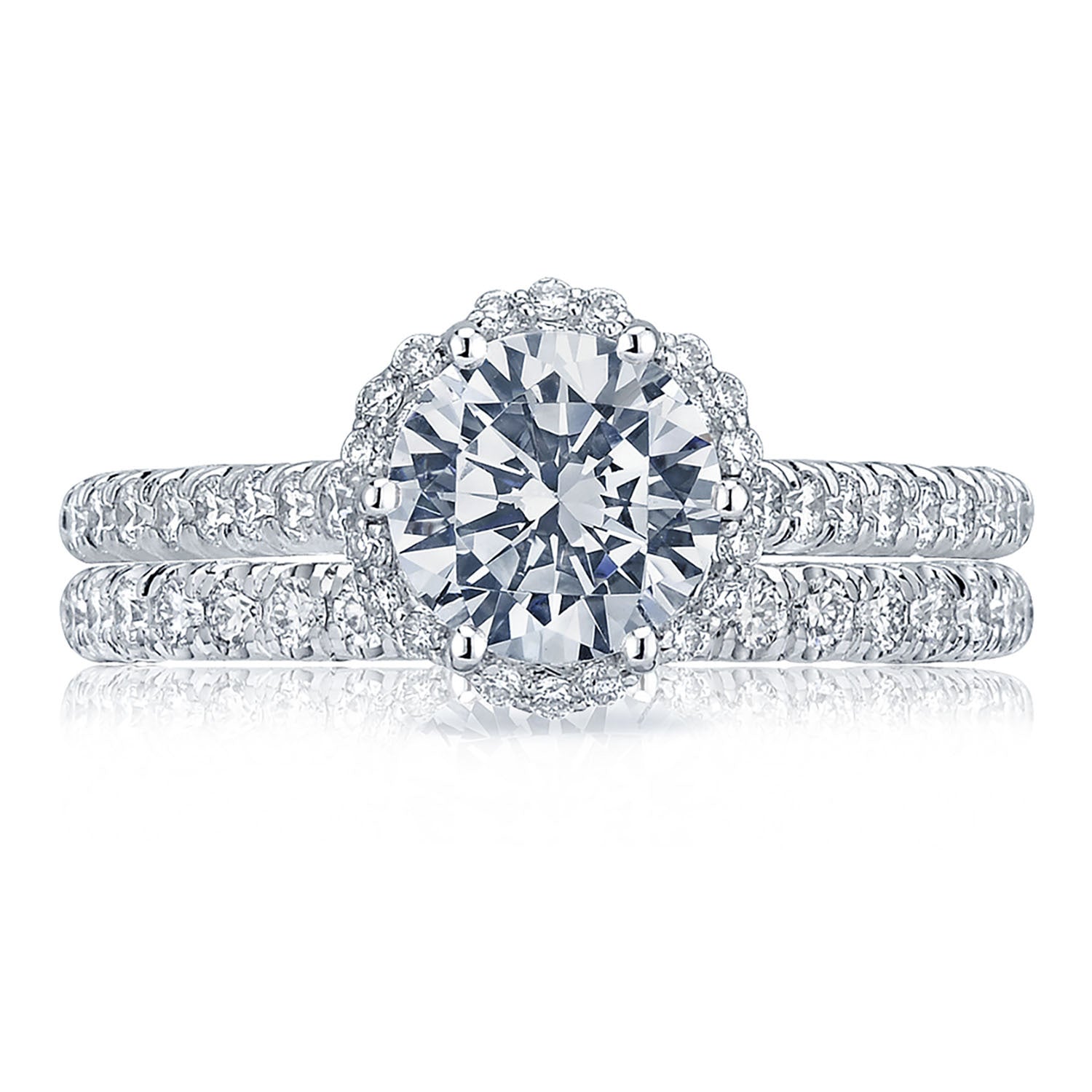 A cushion bloom enhances the round-brilliant solitaire, while pavé juxtabposes the high-polish band. Lace-like milgrian decorates the Cathedral crown, while diamond-studded crescents decorate the silhouette.