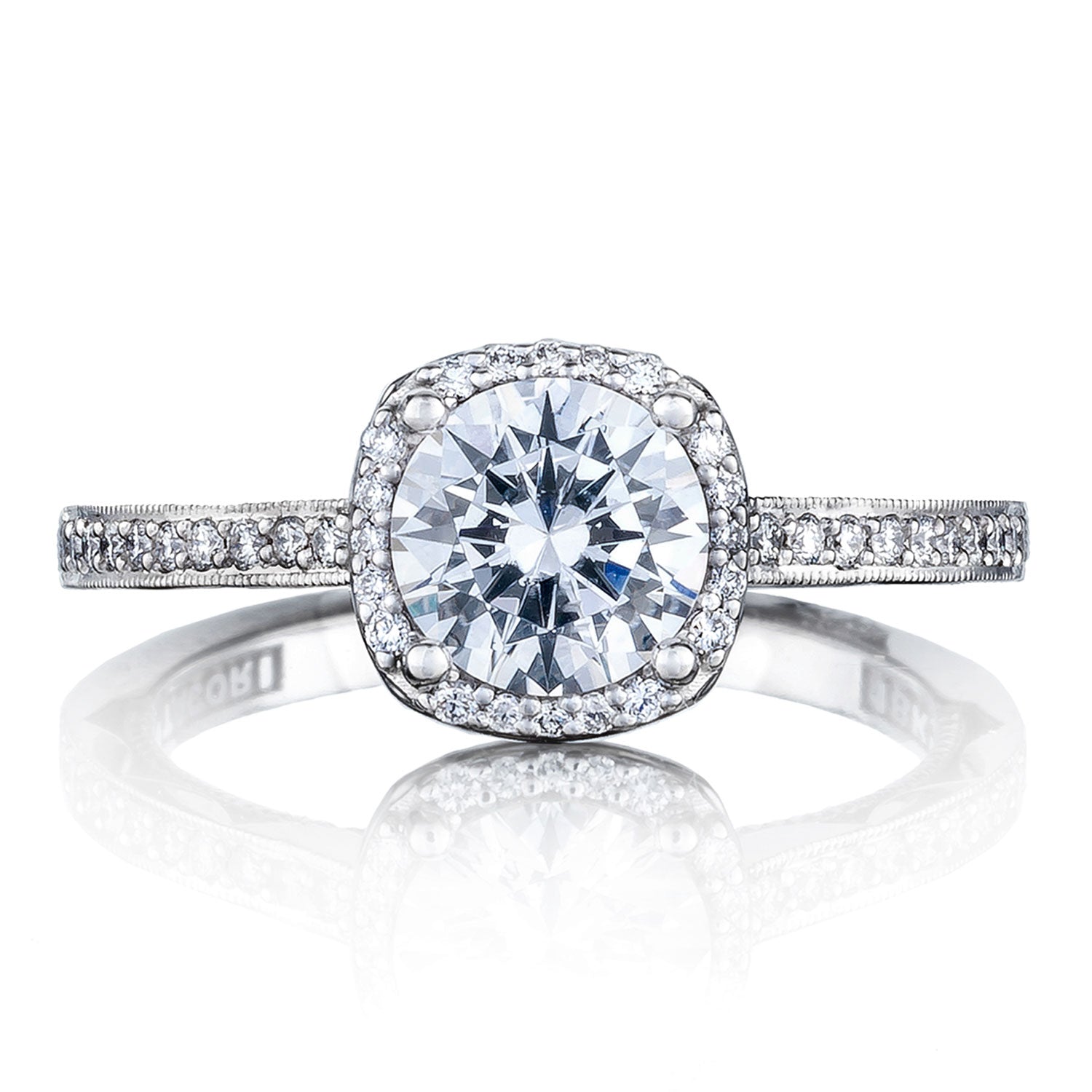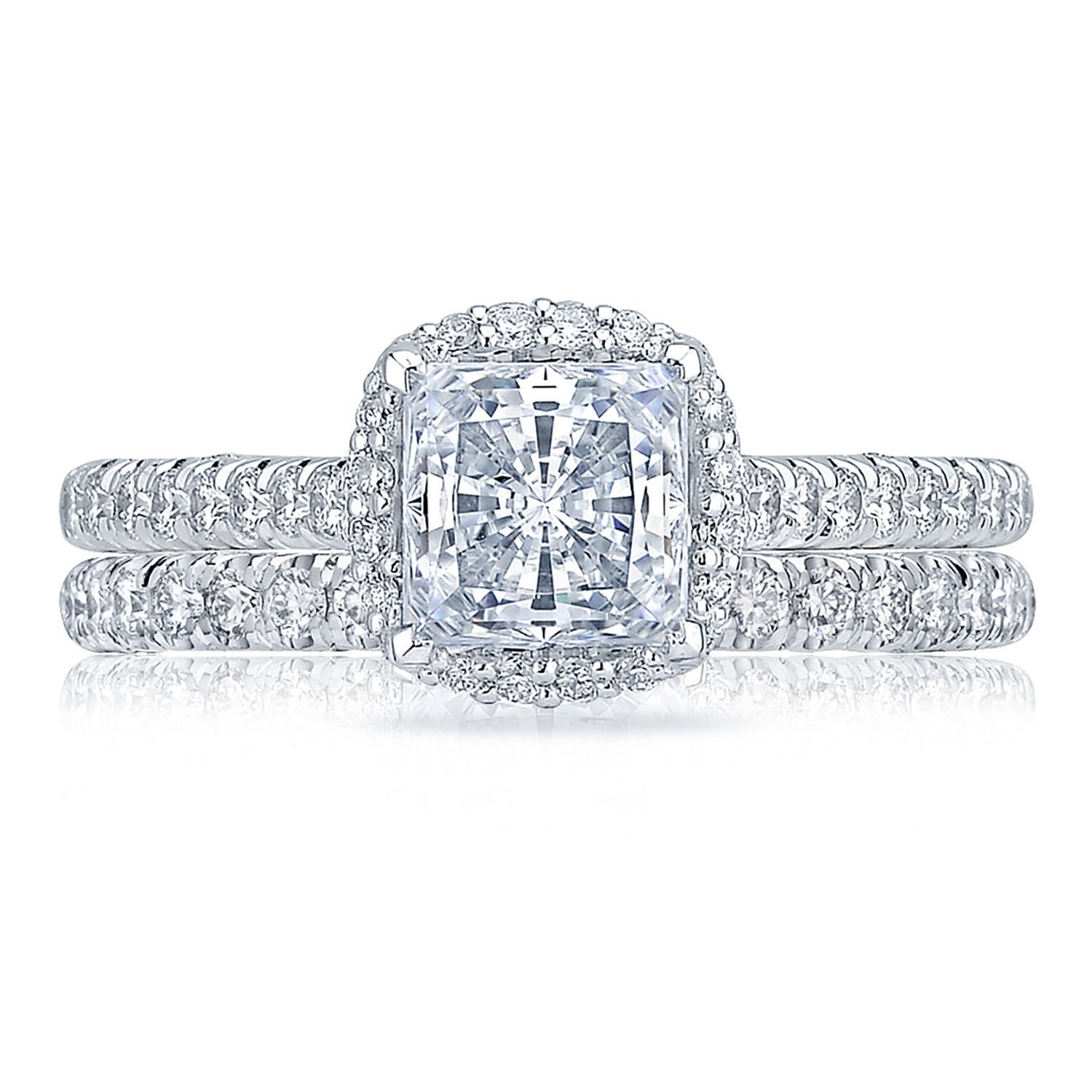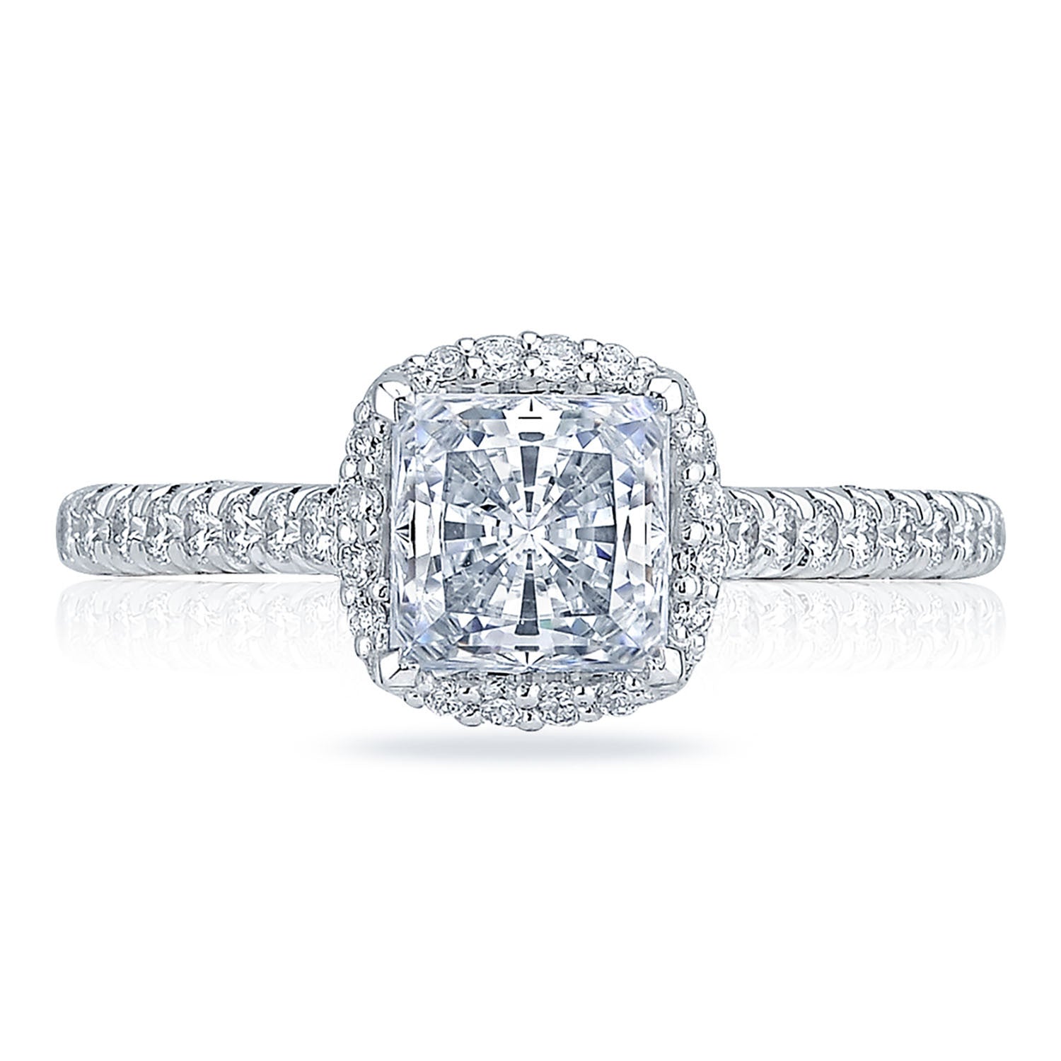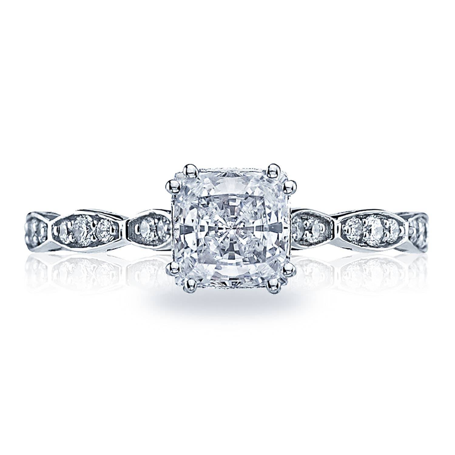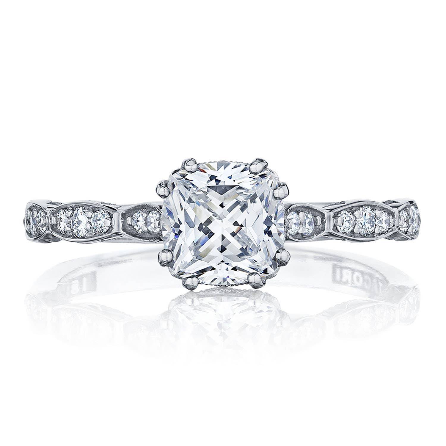 A romantic cushion bloom illuminates the center diamond, which is set into an open, milgrain-detailed Cathedral foundation. The band is pavé-set with diamonds and decorated with an iconic, diamond-intense Classic Crescent fabric.