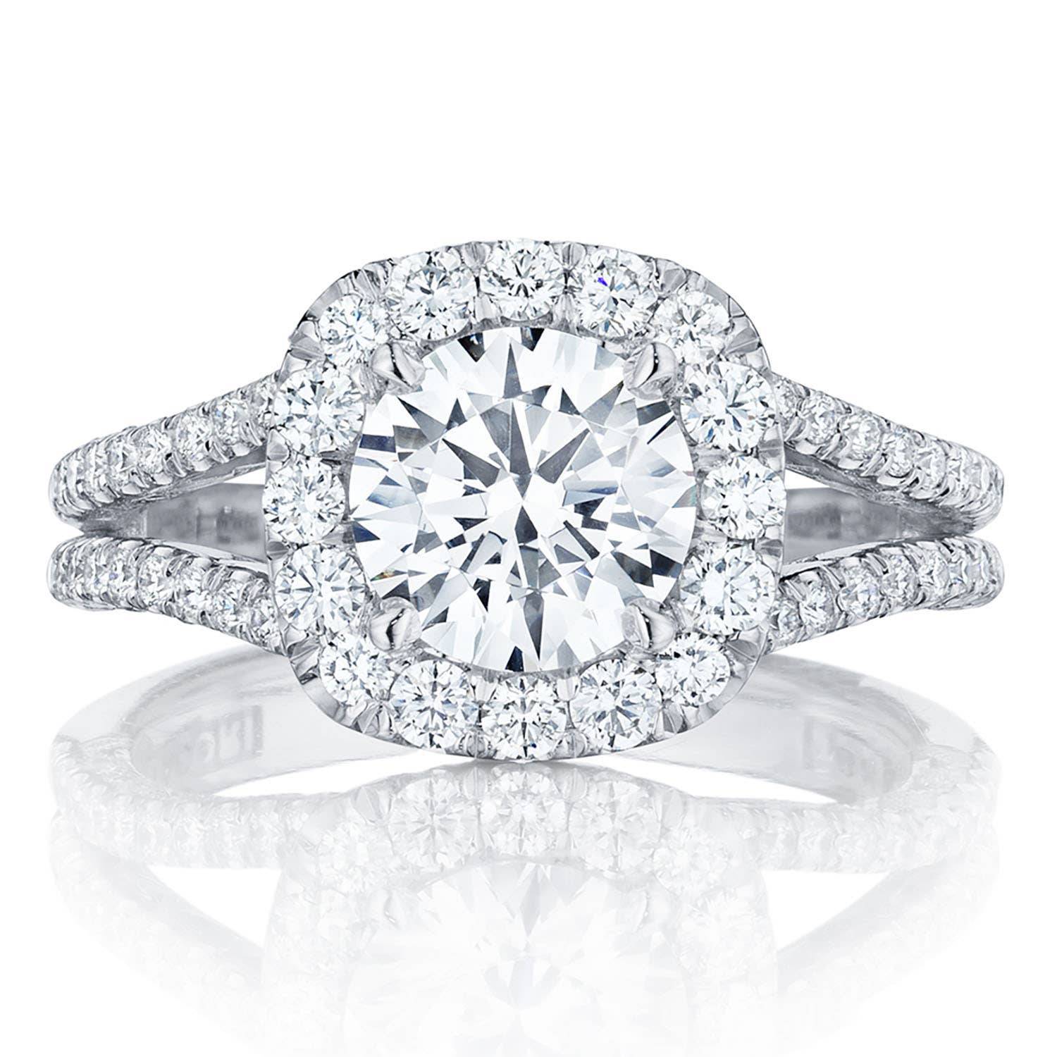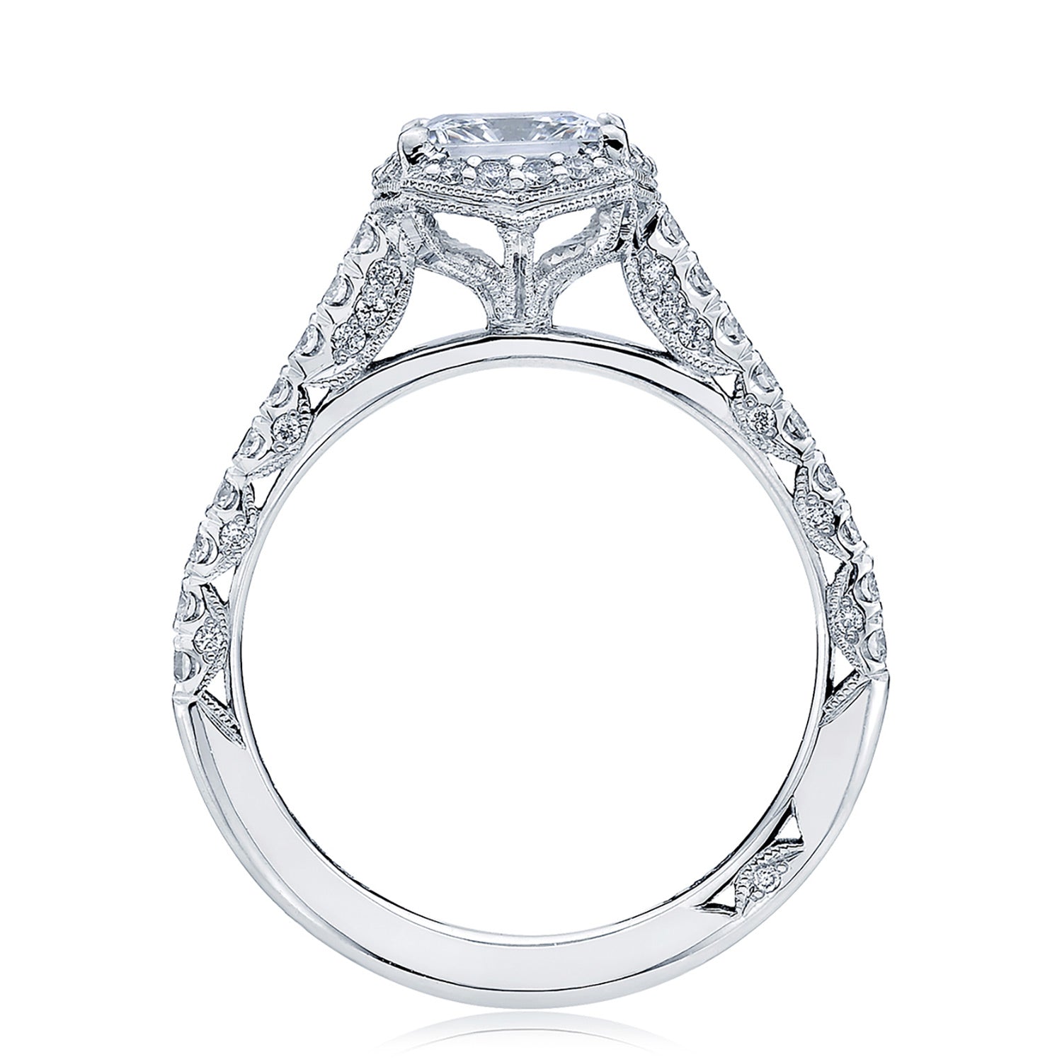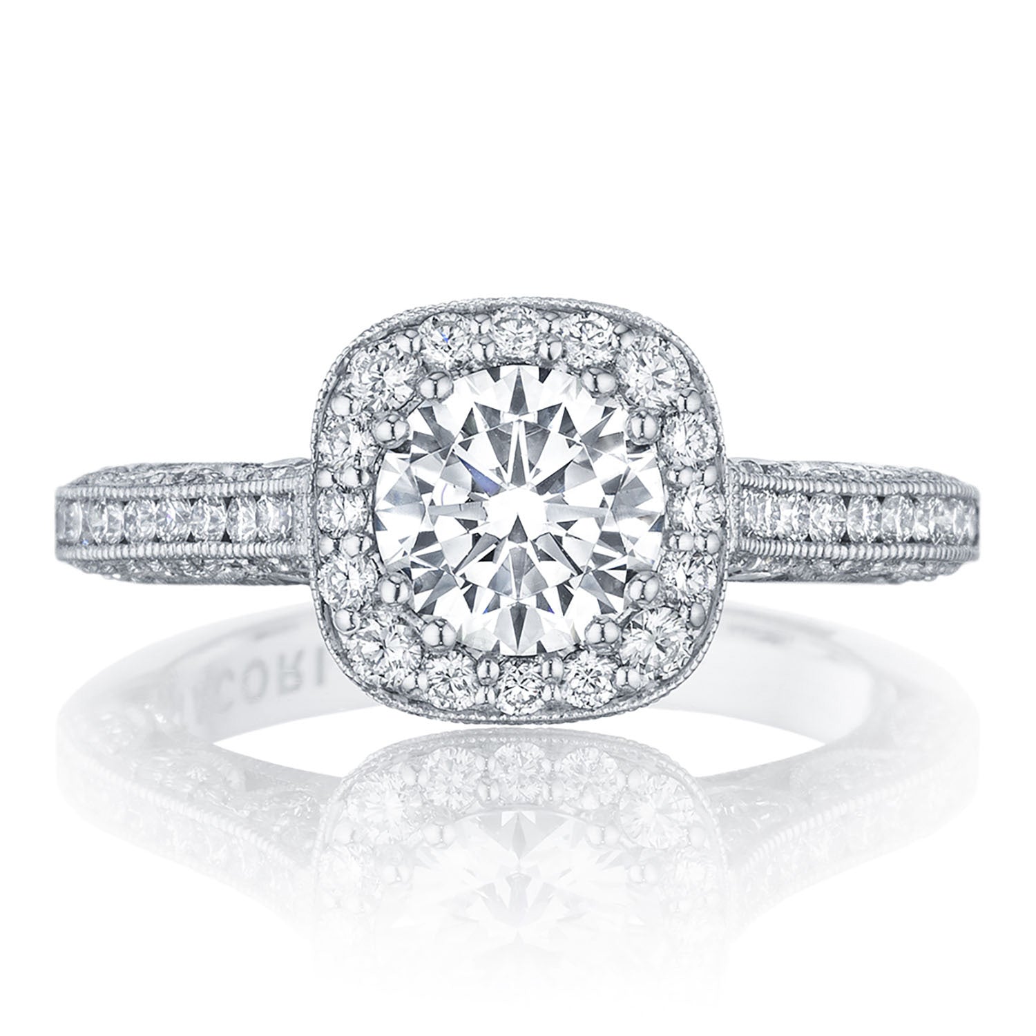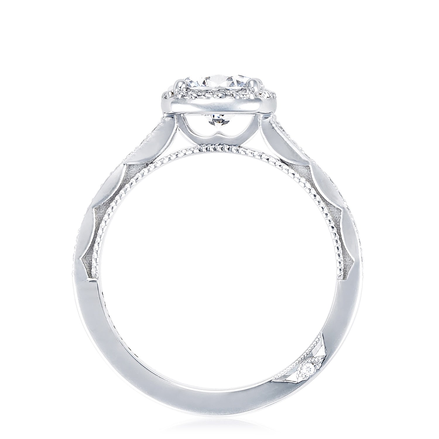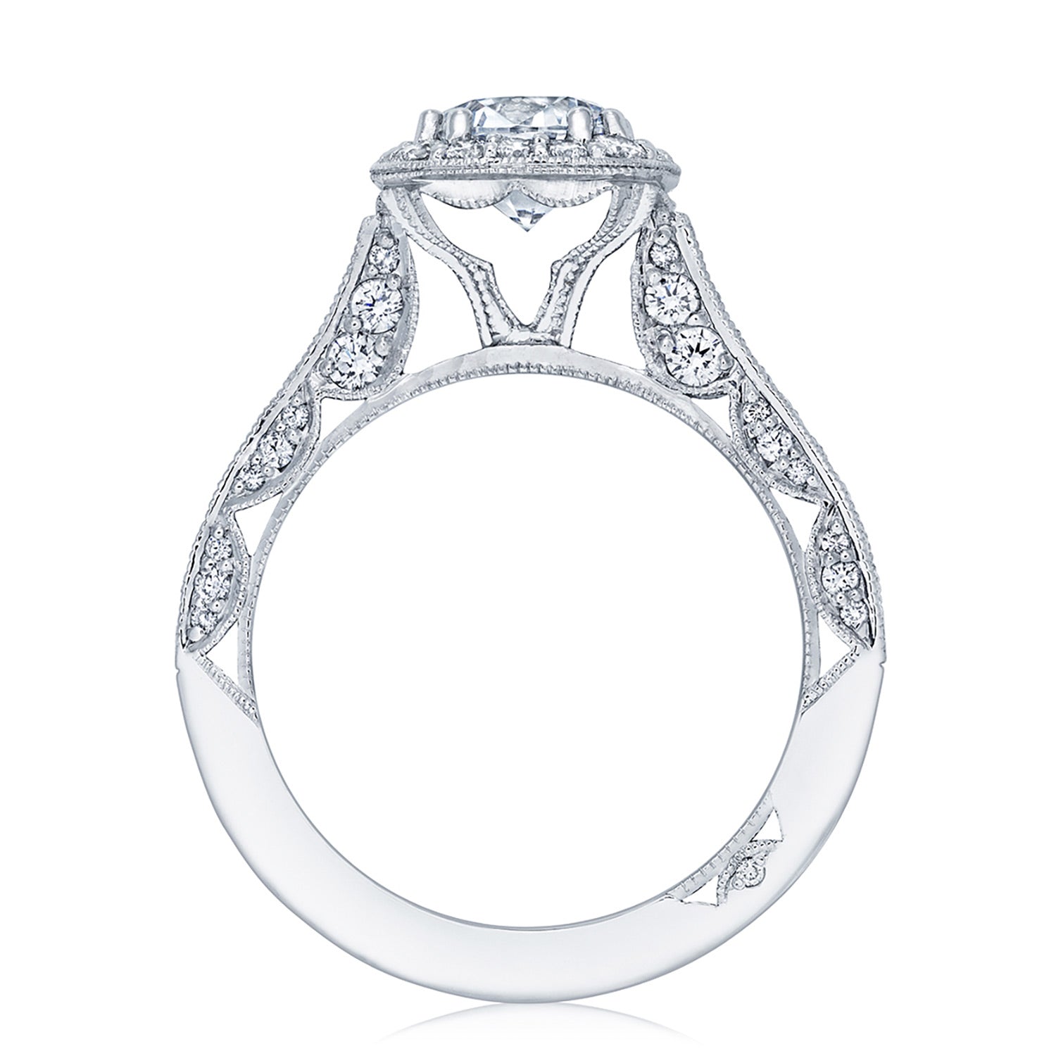 A cushion bloom enhances the center stone, which sits on a Classic 360 foundation with an open gallery. Hand carved Sculpted Crescent fabric with careful milgrain decorates the innerface of the ring.