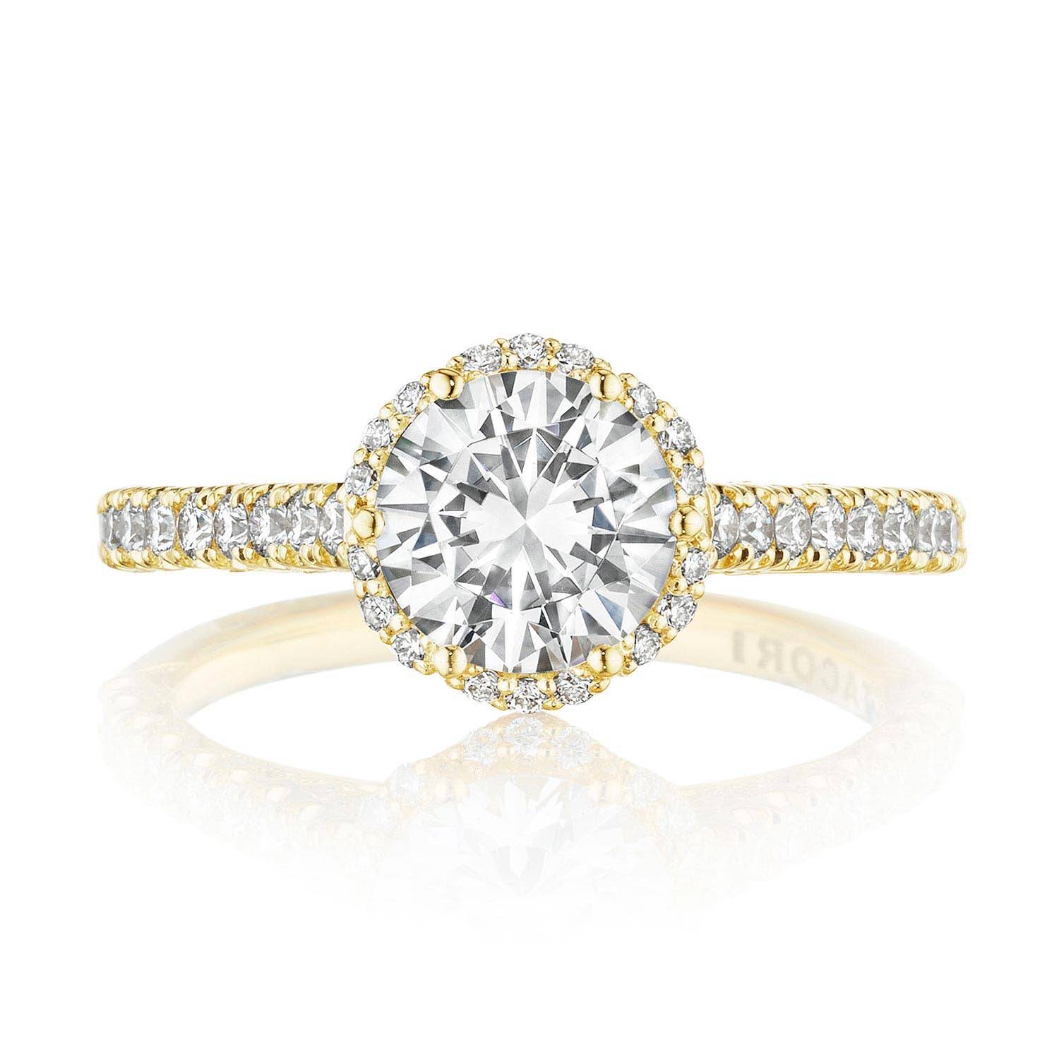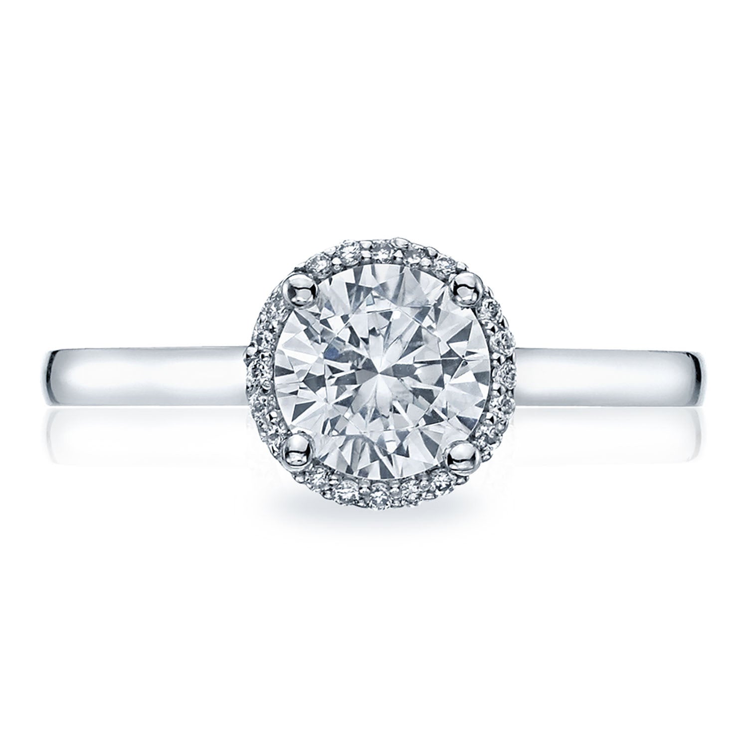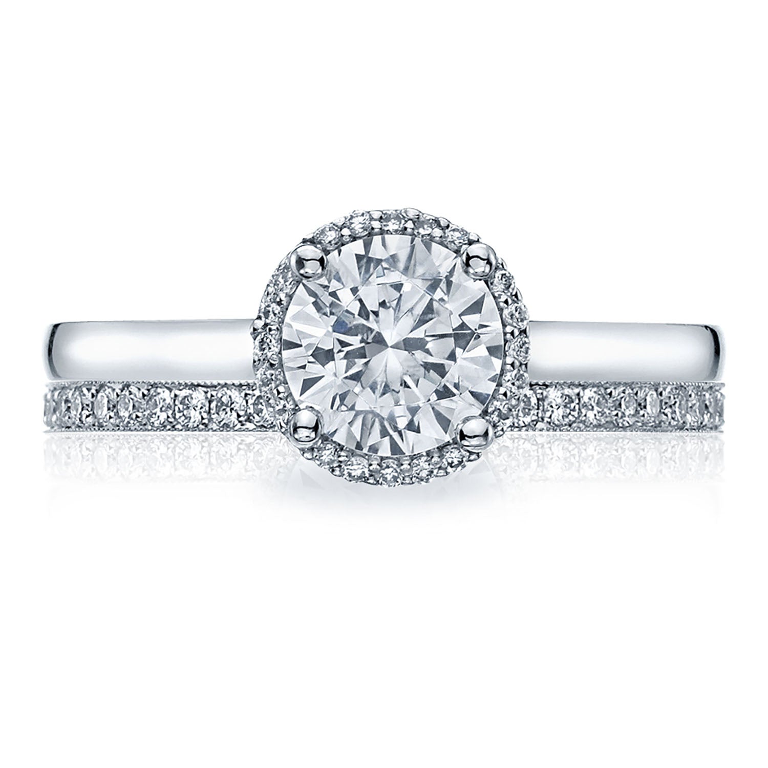 A bloom of diamonds around the round brilliant solitaire gives depth and dimension, while a diamond and milgrain-studded Cathedral foundation addes intricacies. A delicate pavé creates distinguished radiance against the high-polish band.