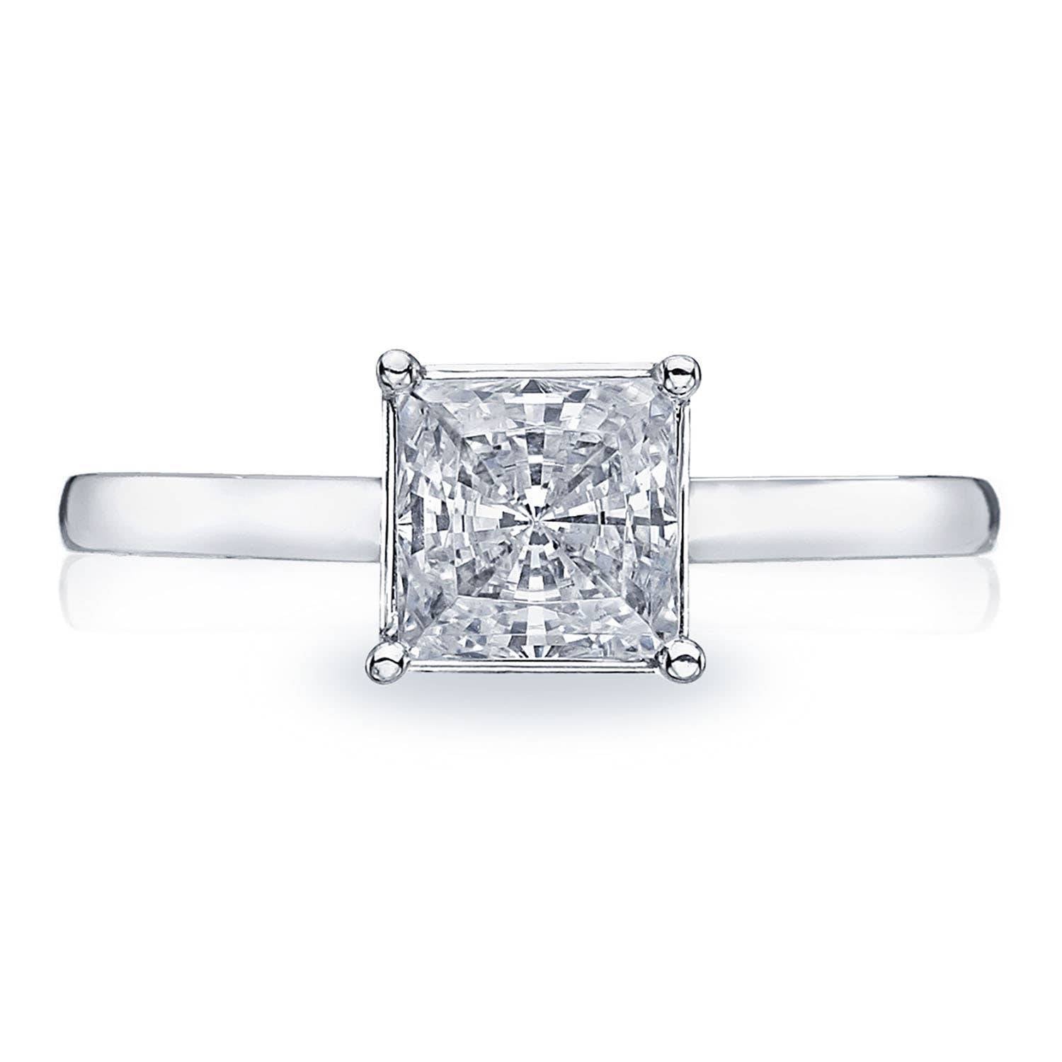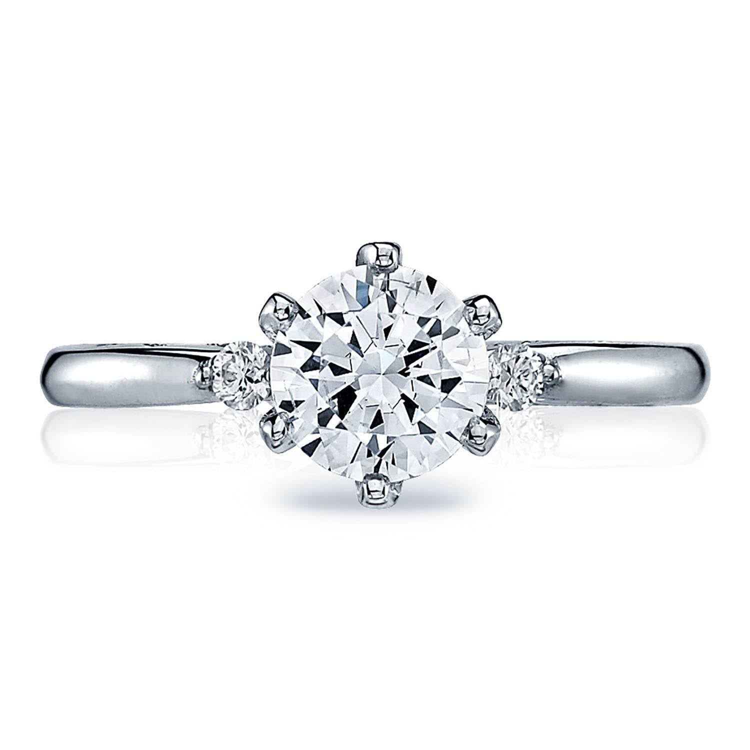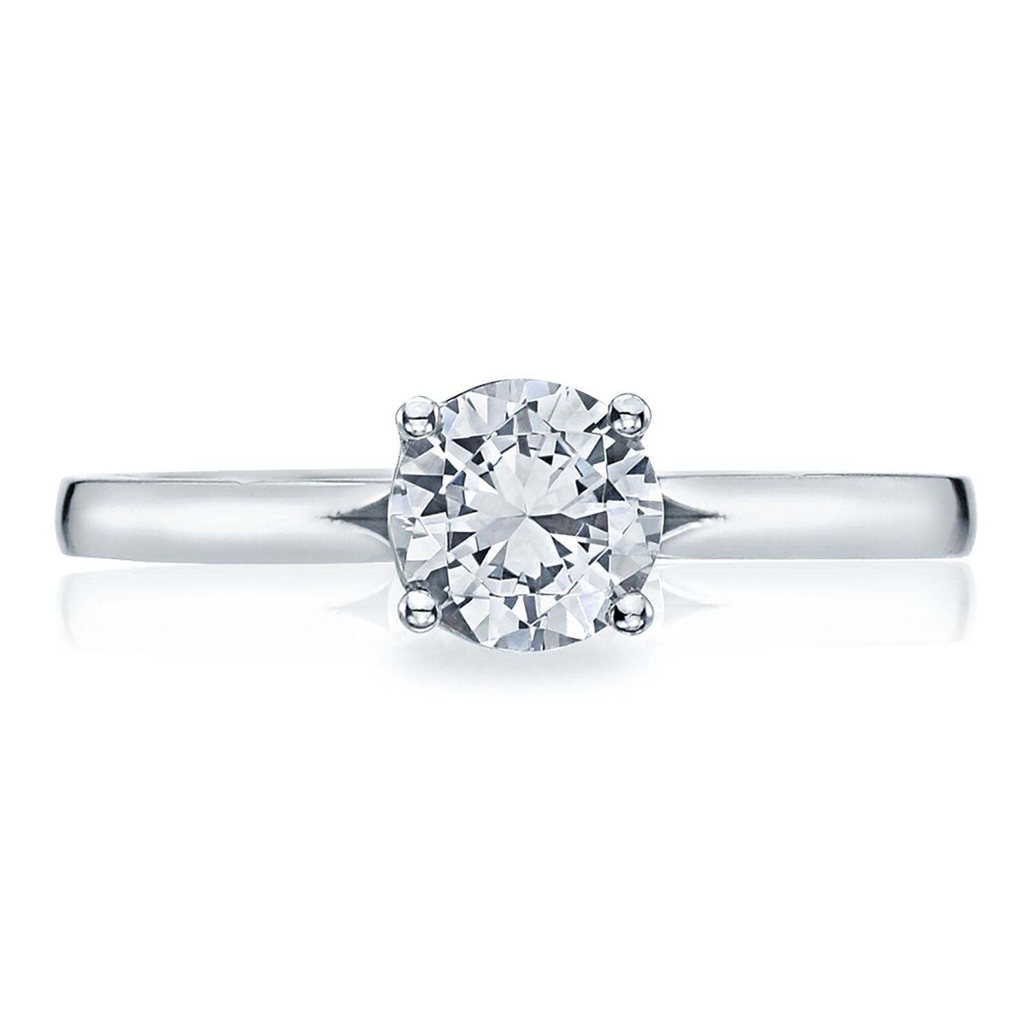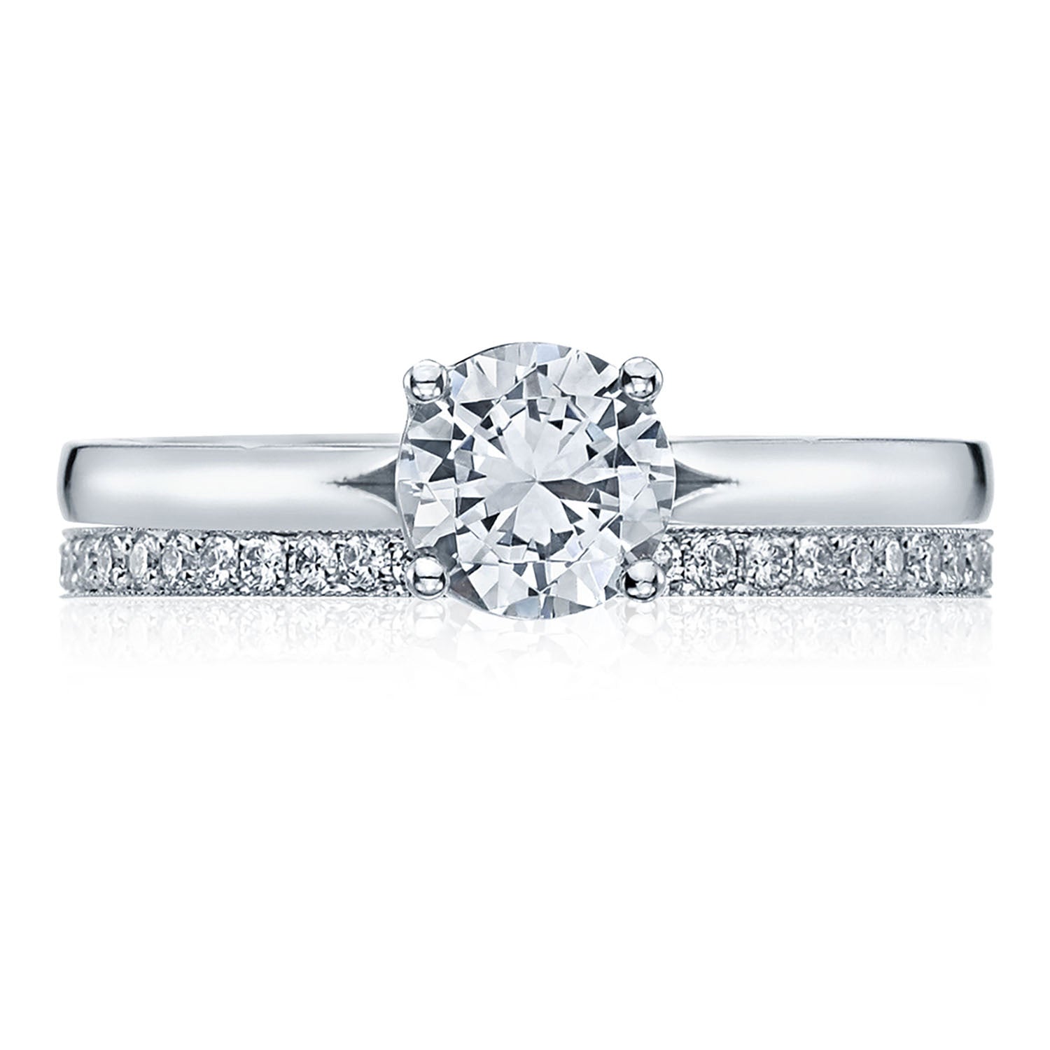 A round-brilliant solitaire is enhanced by lace-like milgrain detailing on the Cathedral foundation. These intricacies are smartly juxtaposed by a high-shine band which is marked with a signature crescent at the resting point.