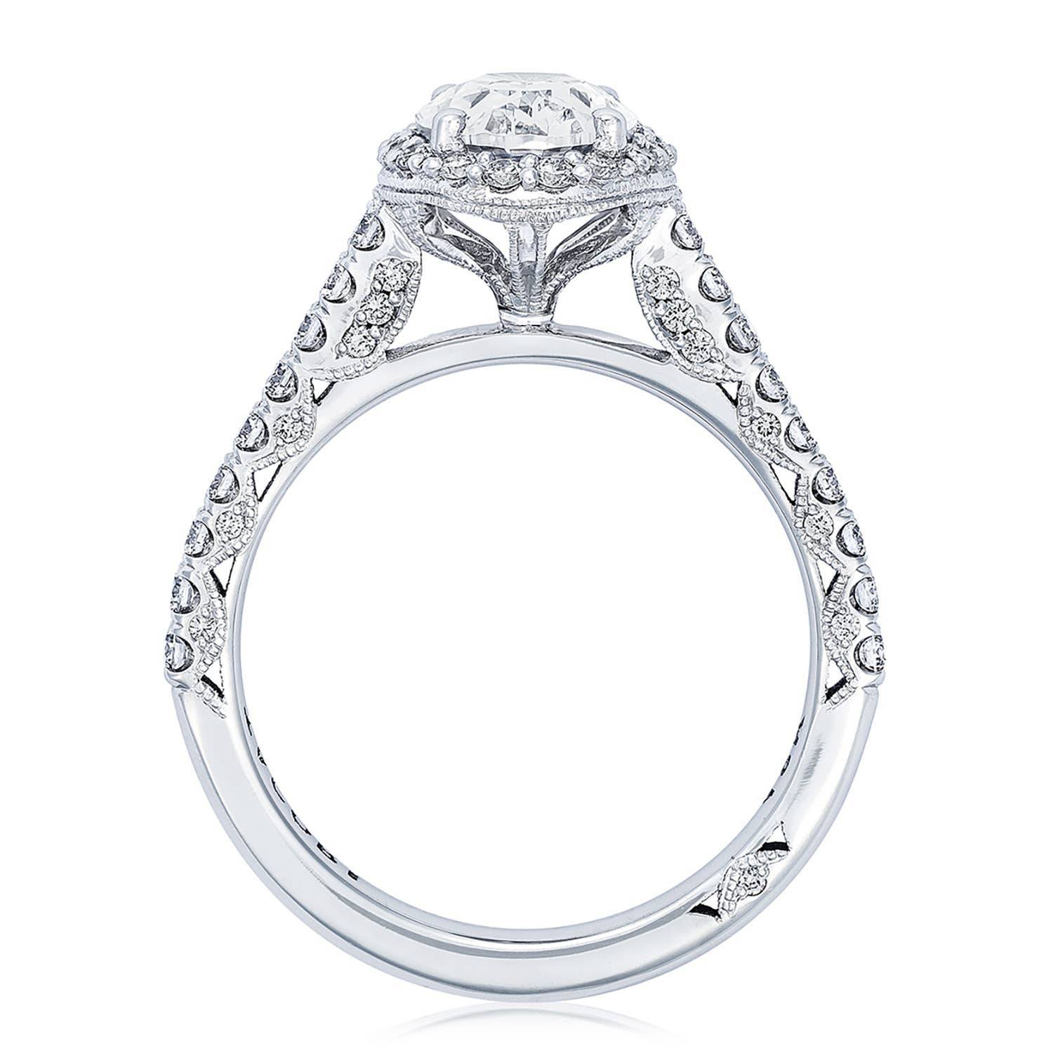 Round-brilliant diamonds form marquise shapes on the ceiling, while milgrain decorates the innerface of Sculpted Crescent fabric. The soltaire floats above the band on a Classic 360 foundation.